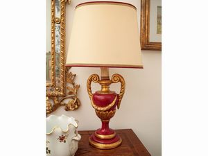 Coppia di lumi da tavolo in legno laccato rosso e dorato