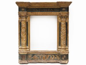 Cornice da specchio a edicola in legno ebanizzato e lumeggiato in oro