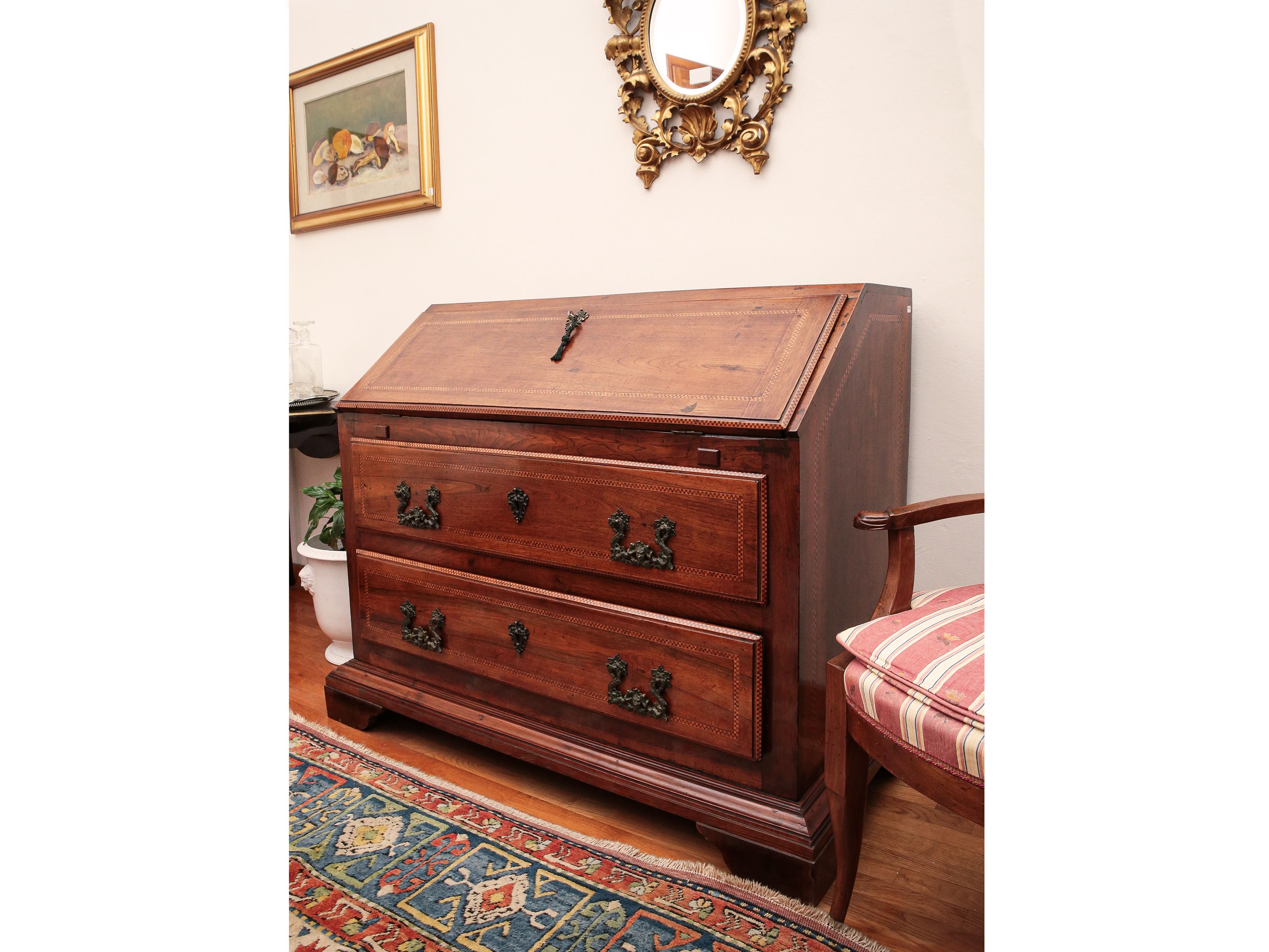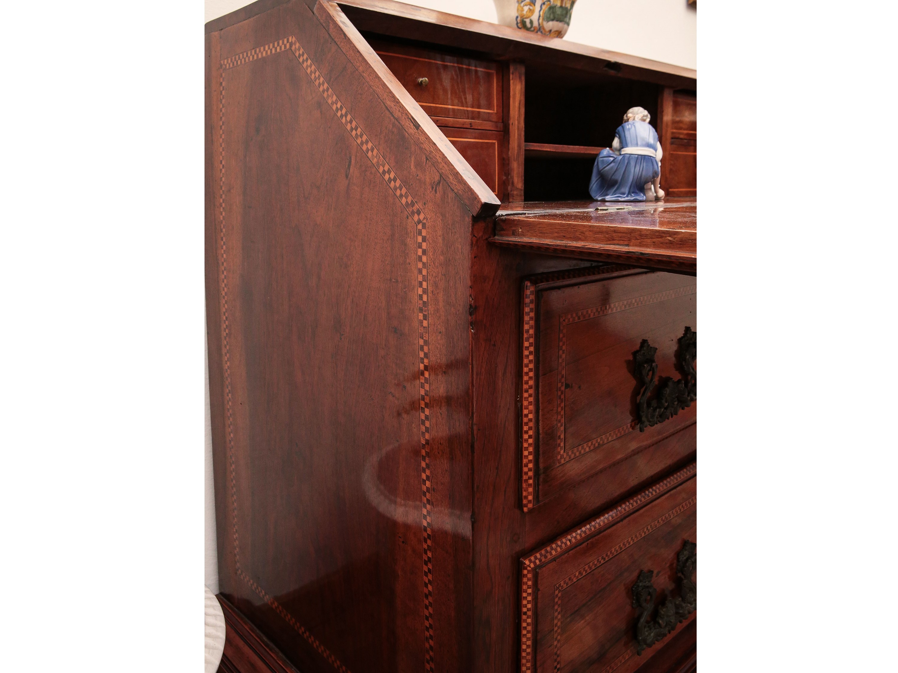 XVIII/XIX secolo intarsiato con filettature damier, sportello a calatoio a celare scarabattolo con cassettini e vani a giorno, base a cornice con piedi a mensola