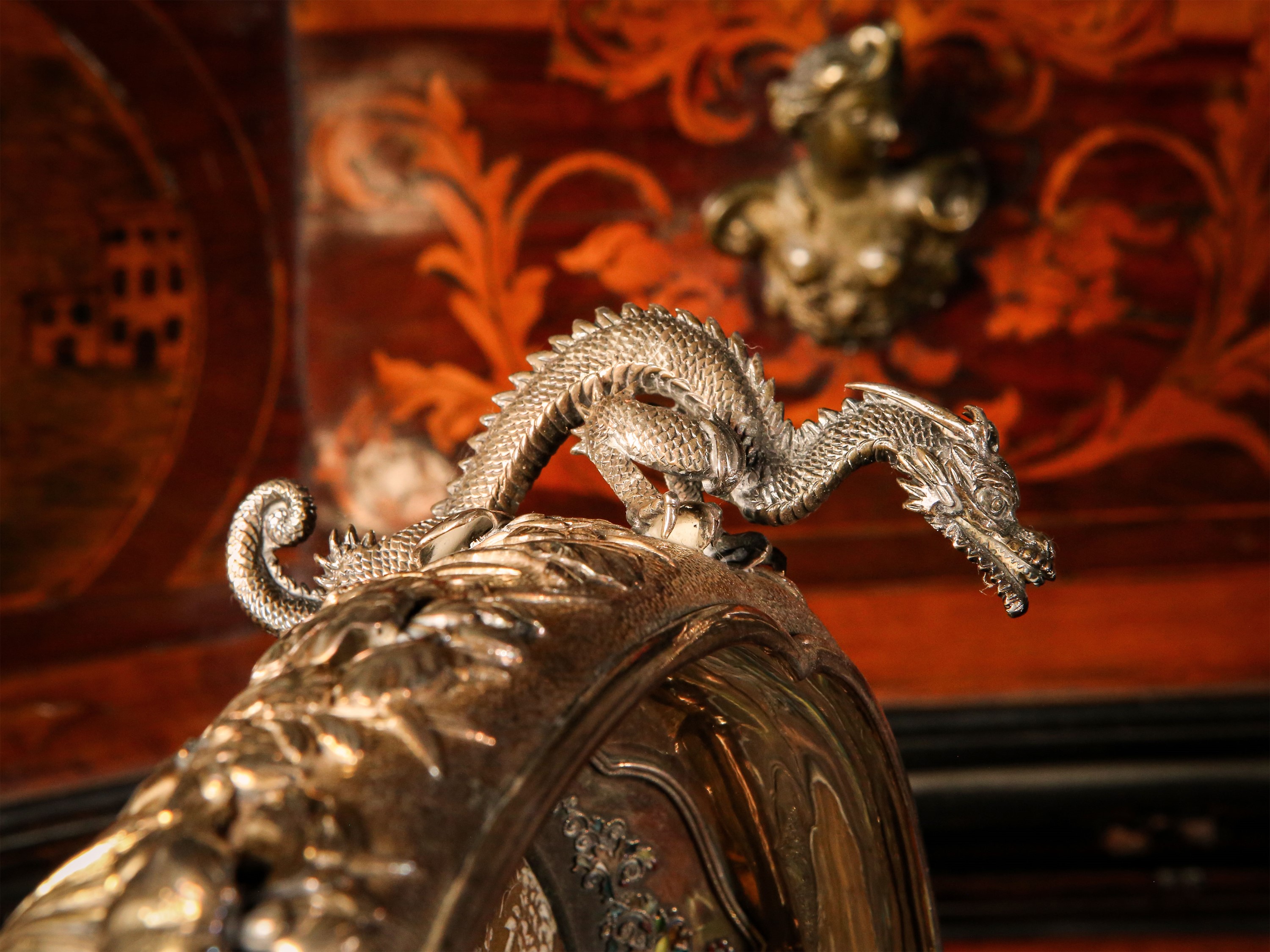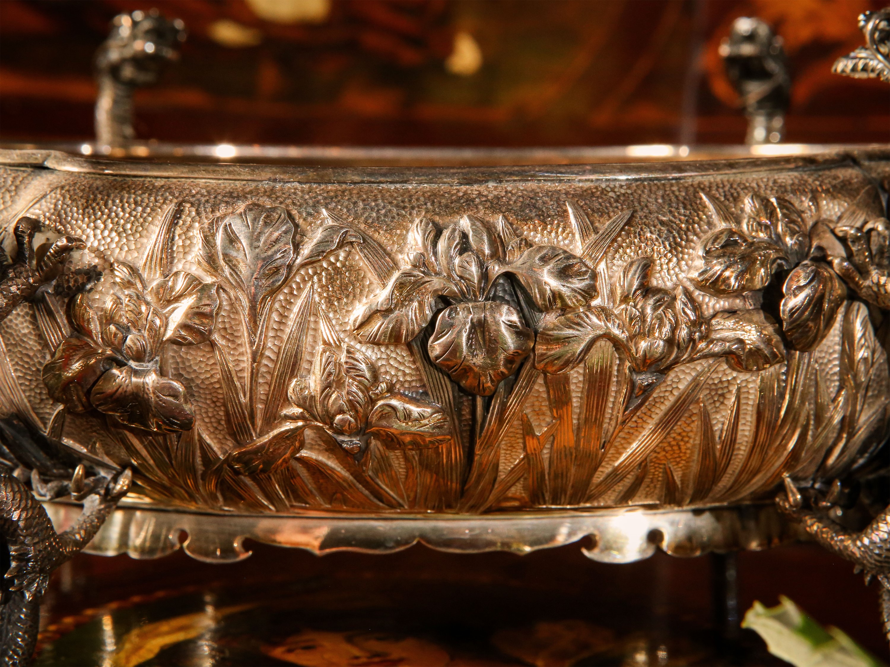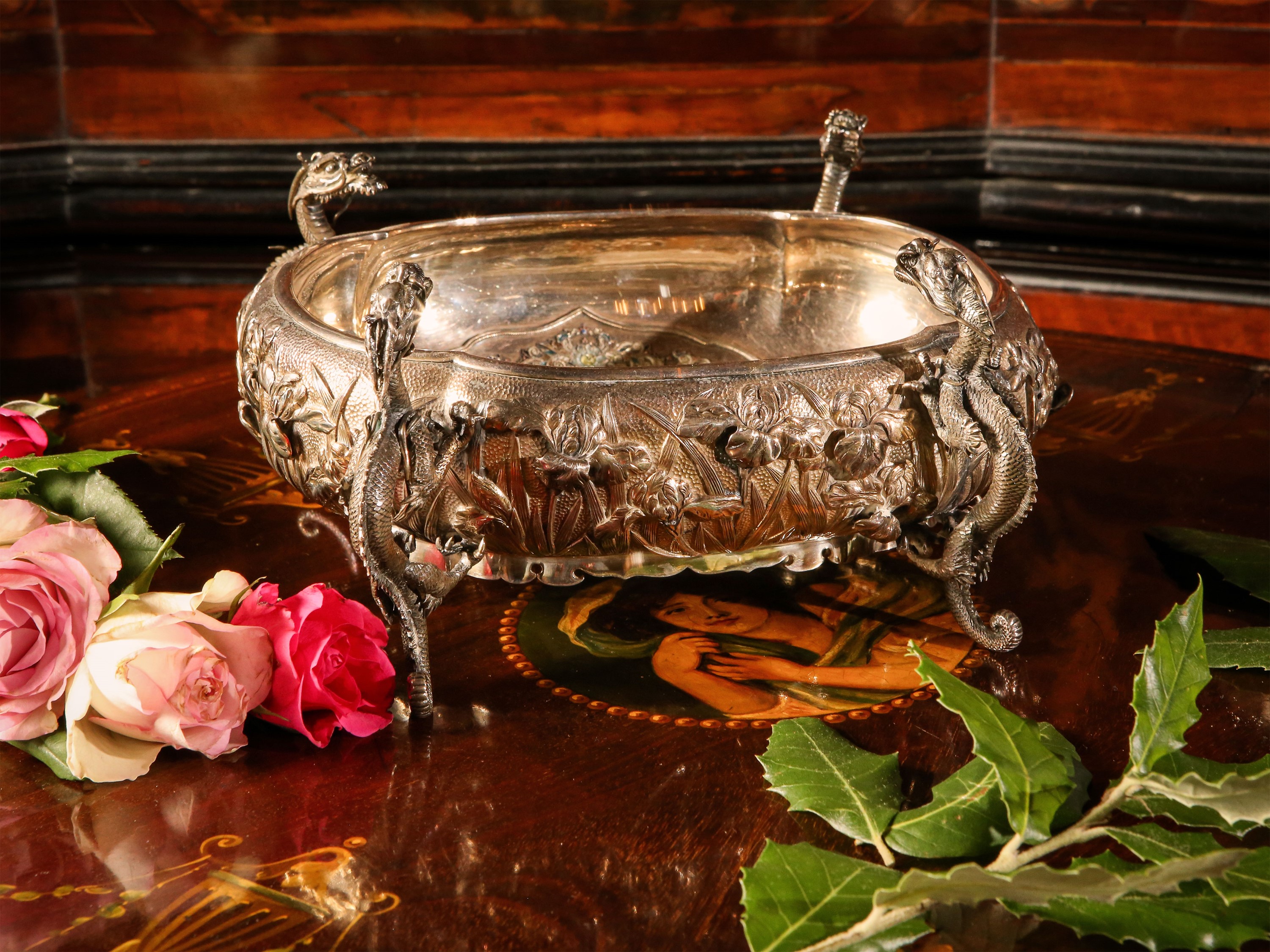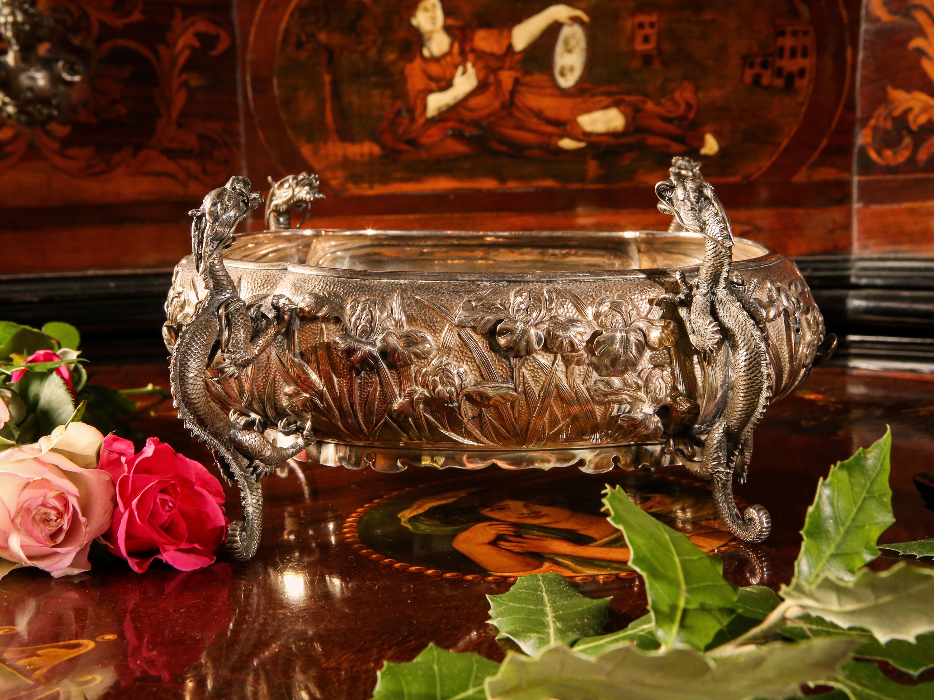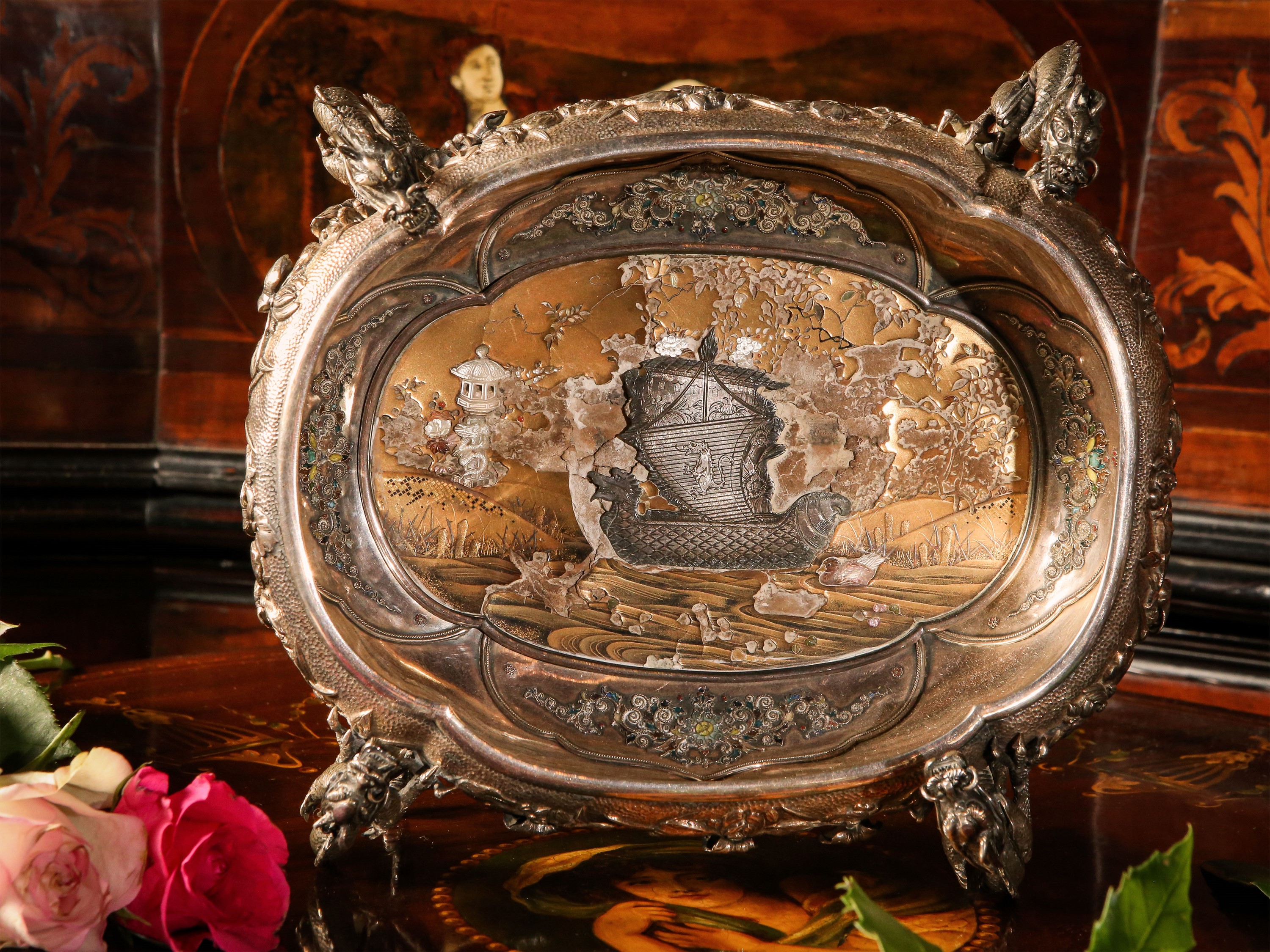 h cm 11x20x16 Cina, XX secolo sorretto da quattro draghi, bordo esterno sbalzato con motivo di iris, all'interno decorato (difetti e mancanze) con paesaggio esotico raffigurante imbarcazione su fondo dorato, intarsi in madreperla, dettagli in smalti, appesantito