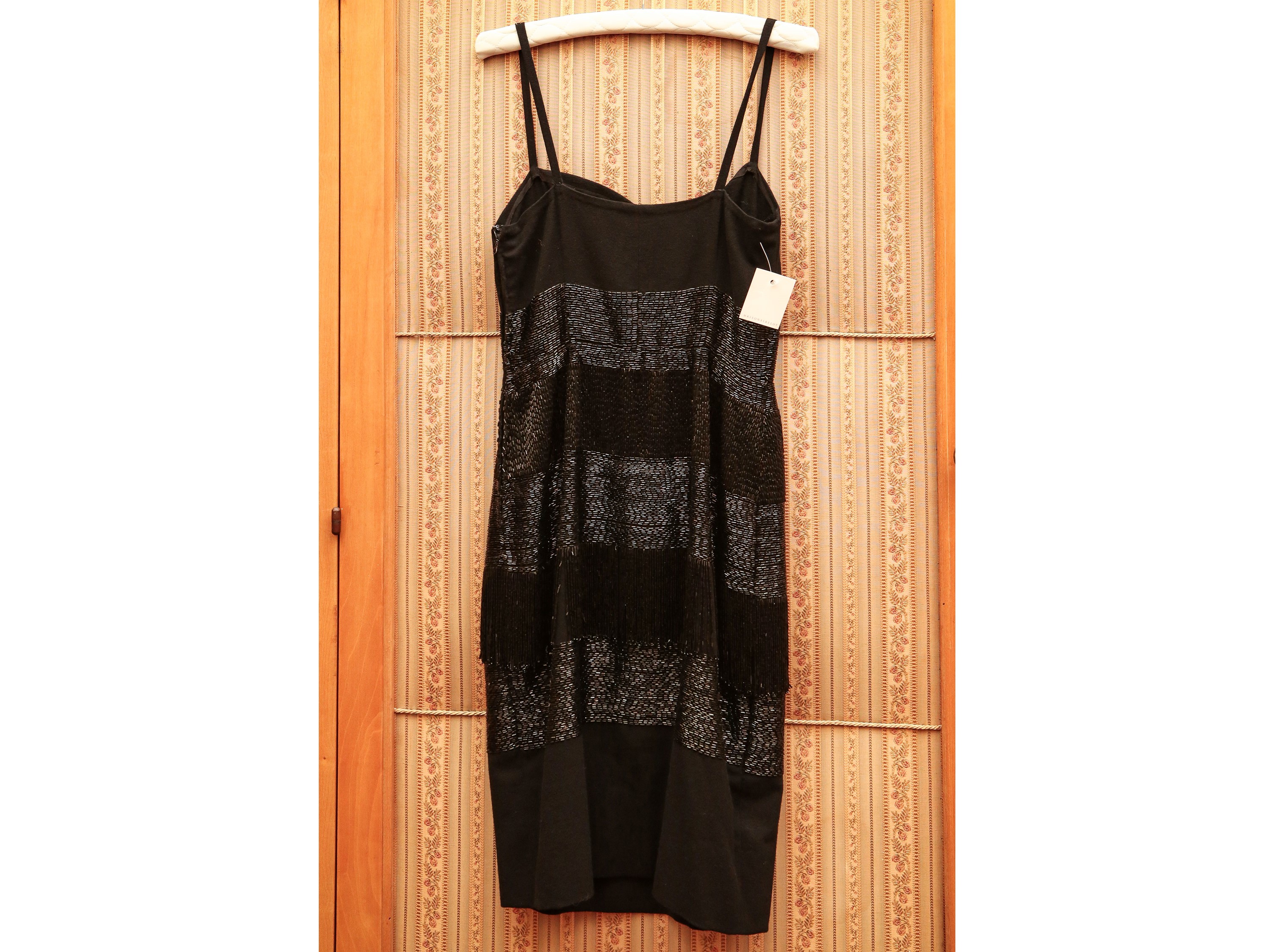 Anni Cinquanta in lana nera ornato da fasce e frange di jais neri, corredato da coprispalle en pendant con bordi ornati da frangia di perline, lievi difetti