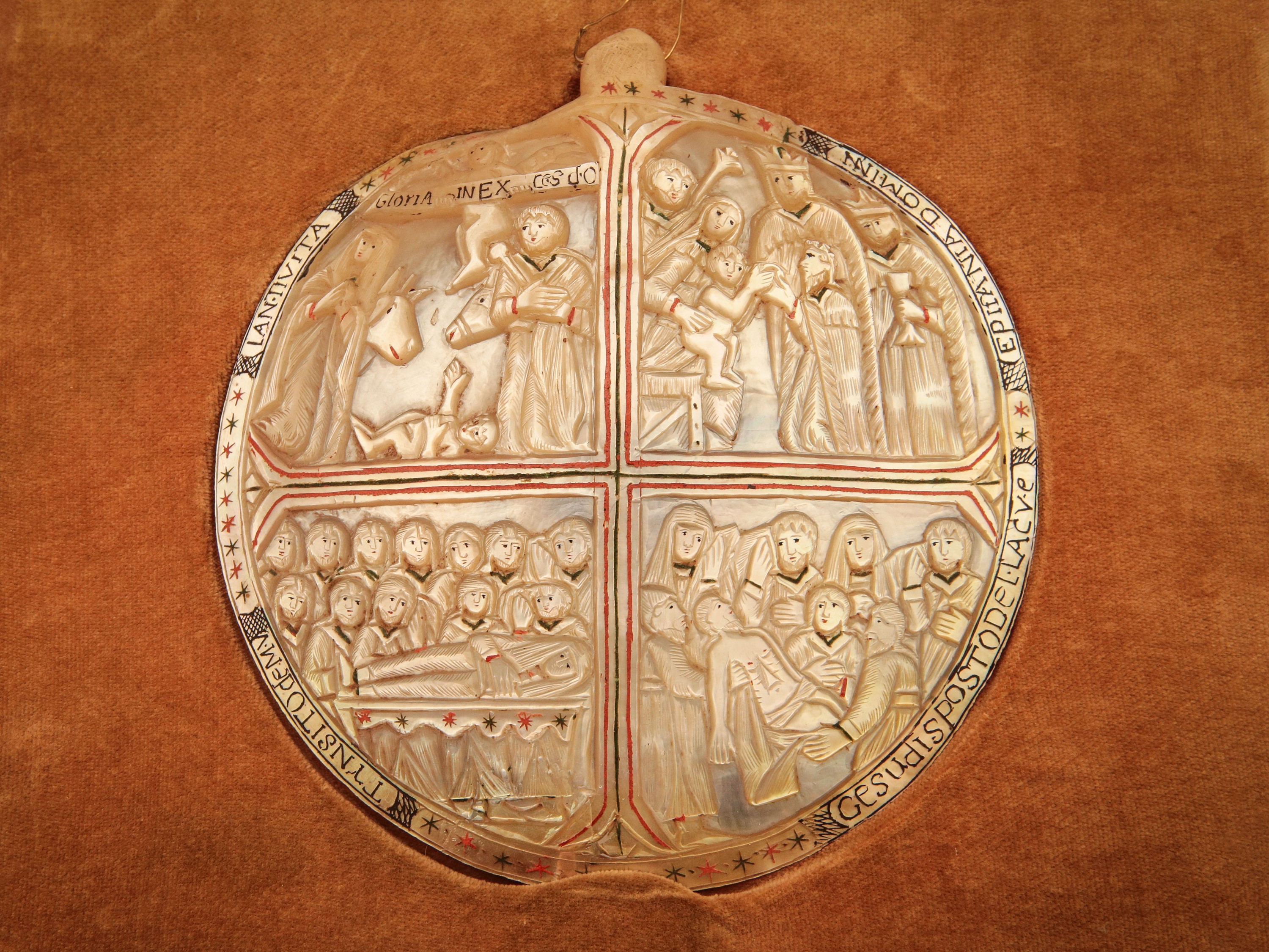 XIX secolo intagliata con motivo devozionale raffigurante quattro episodi della vita di Gesù, su pannello in velluto colo oro, alcuni difetti