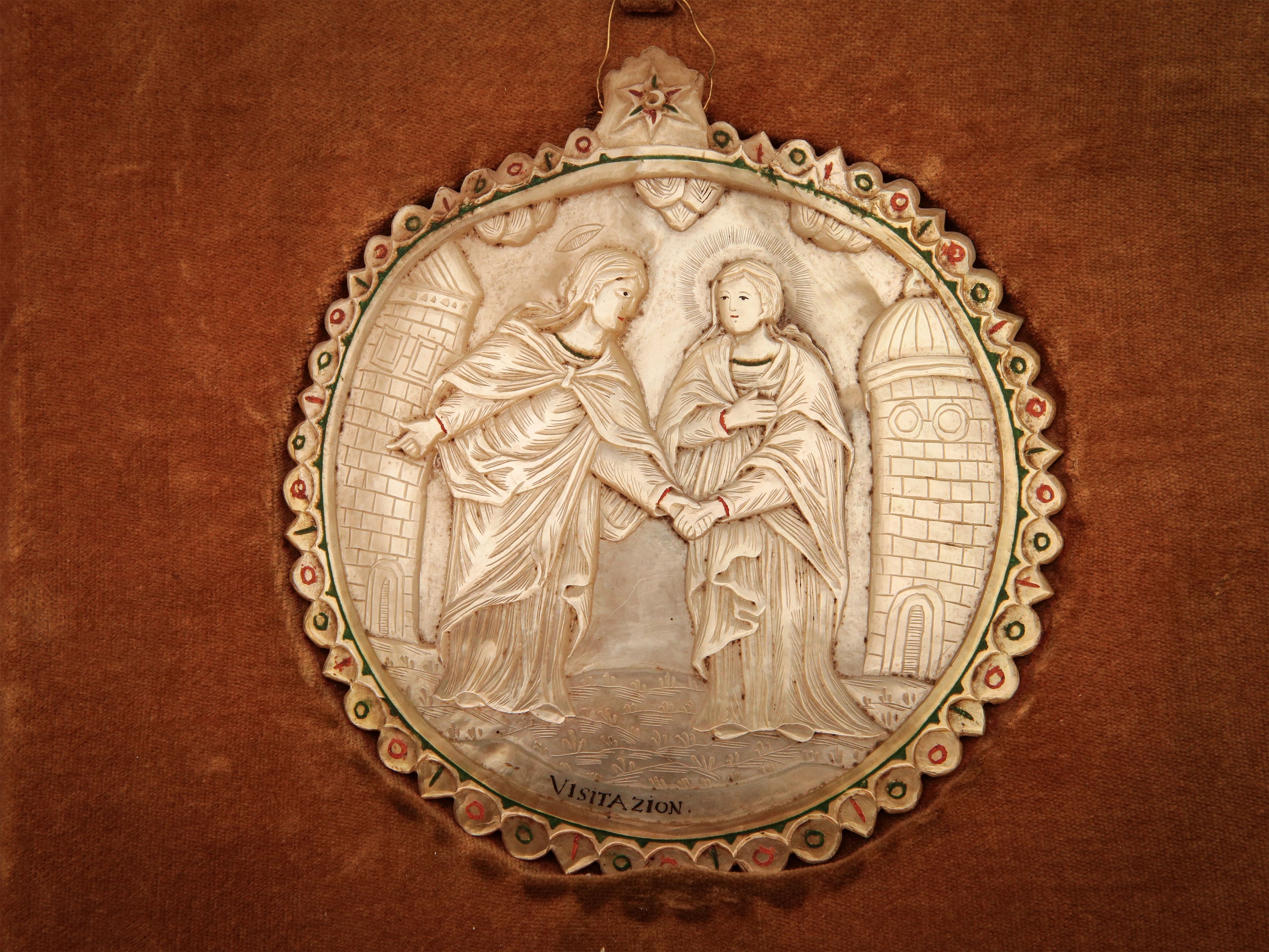XIX secolo intagliata con motivo devozionale raffigurante la Visita di Santa Elisabetta alla Vergine, su pannello in velluto color oro