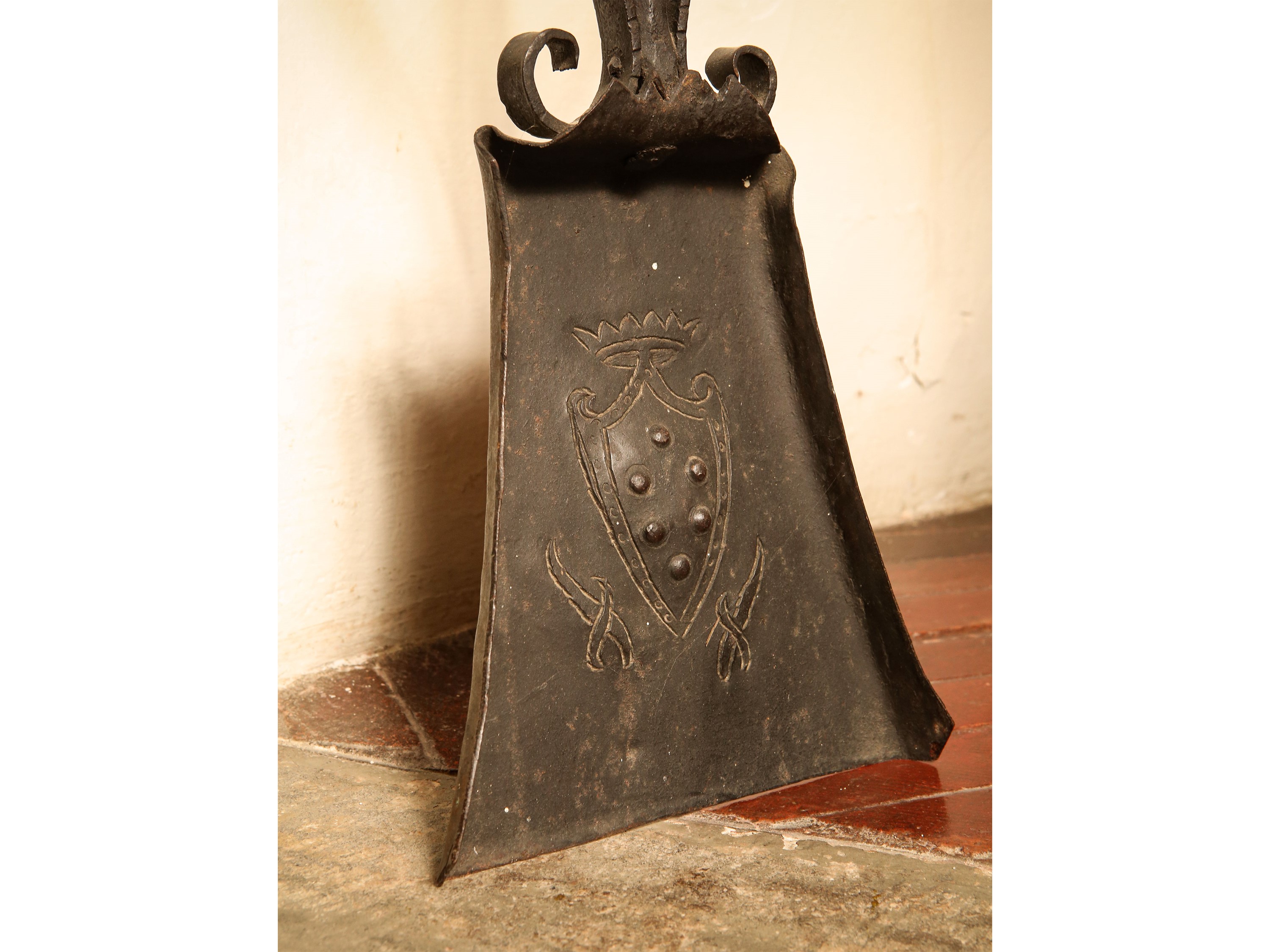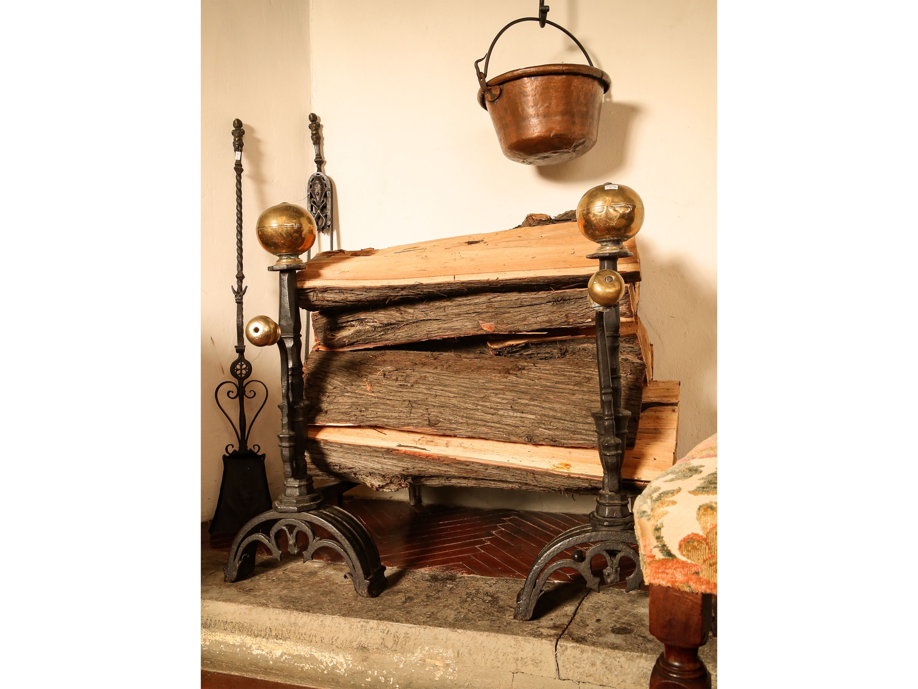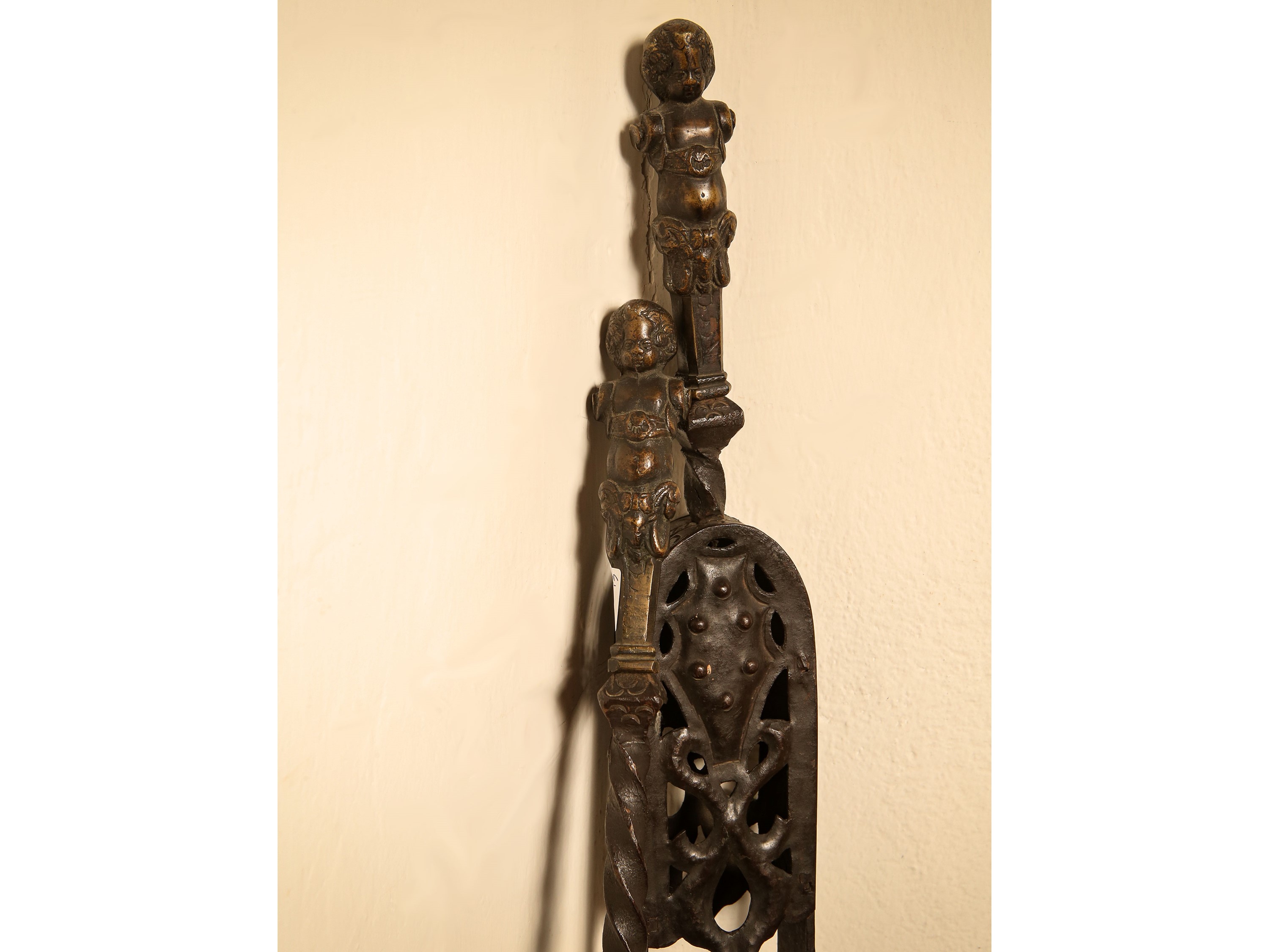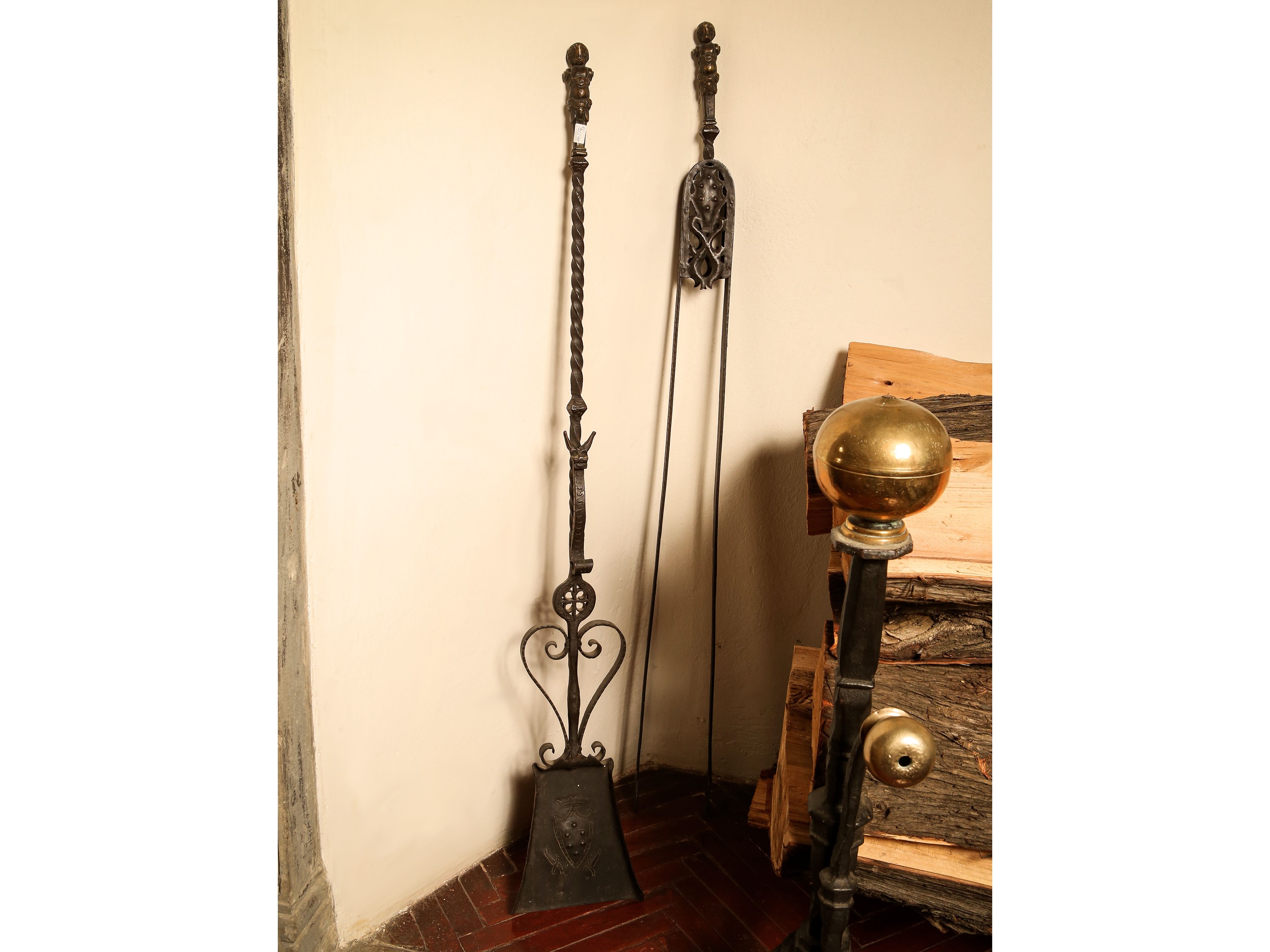 Coppia di grandi alari in ferro battuto