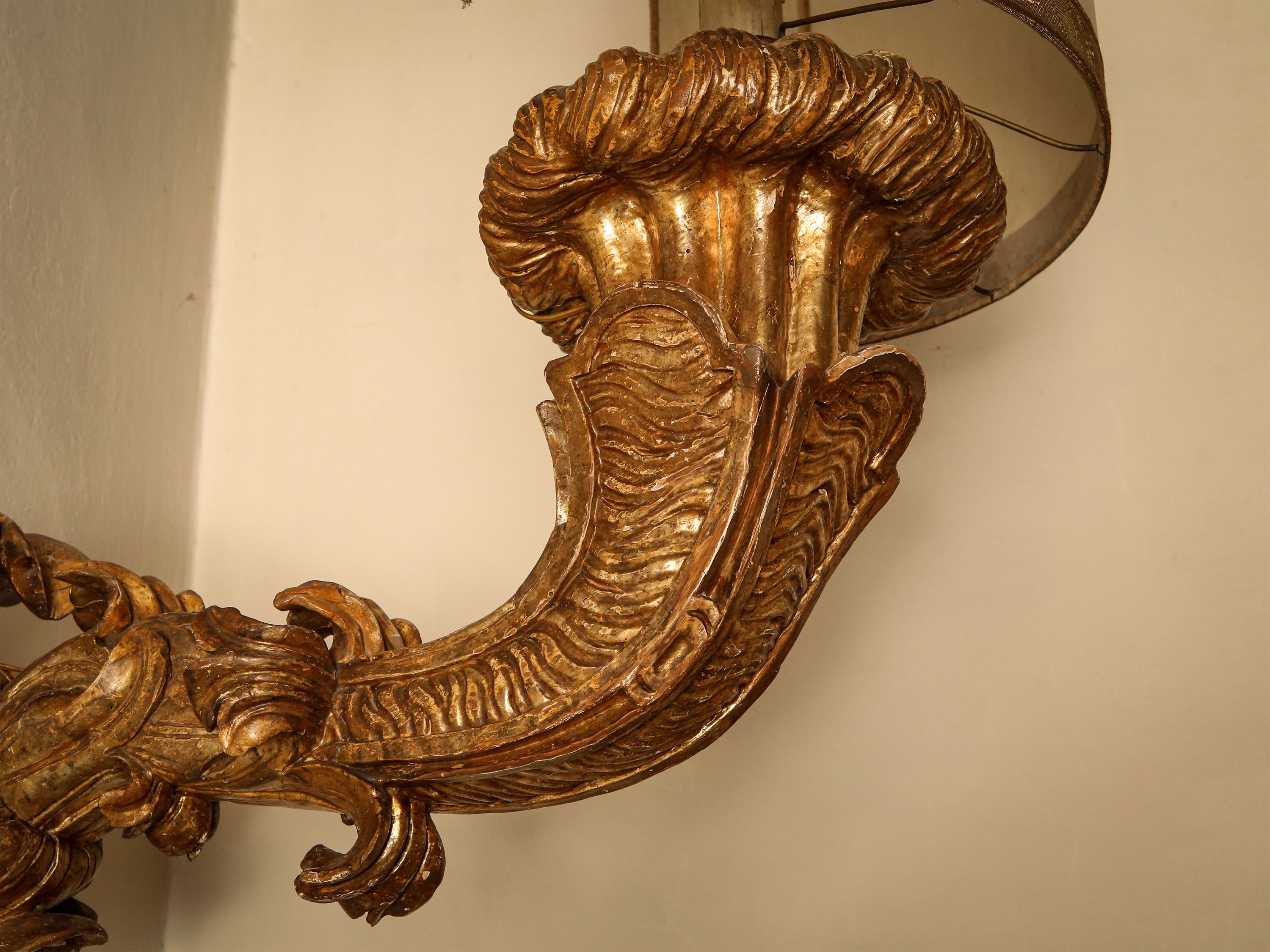 Coppia di grandi bracci a muro in legno intagliato e dorato