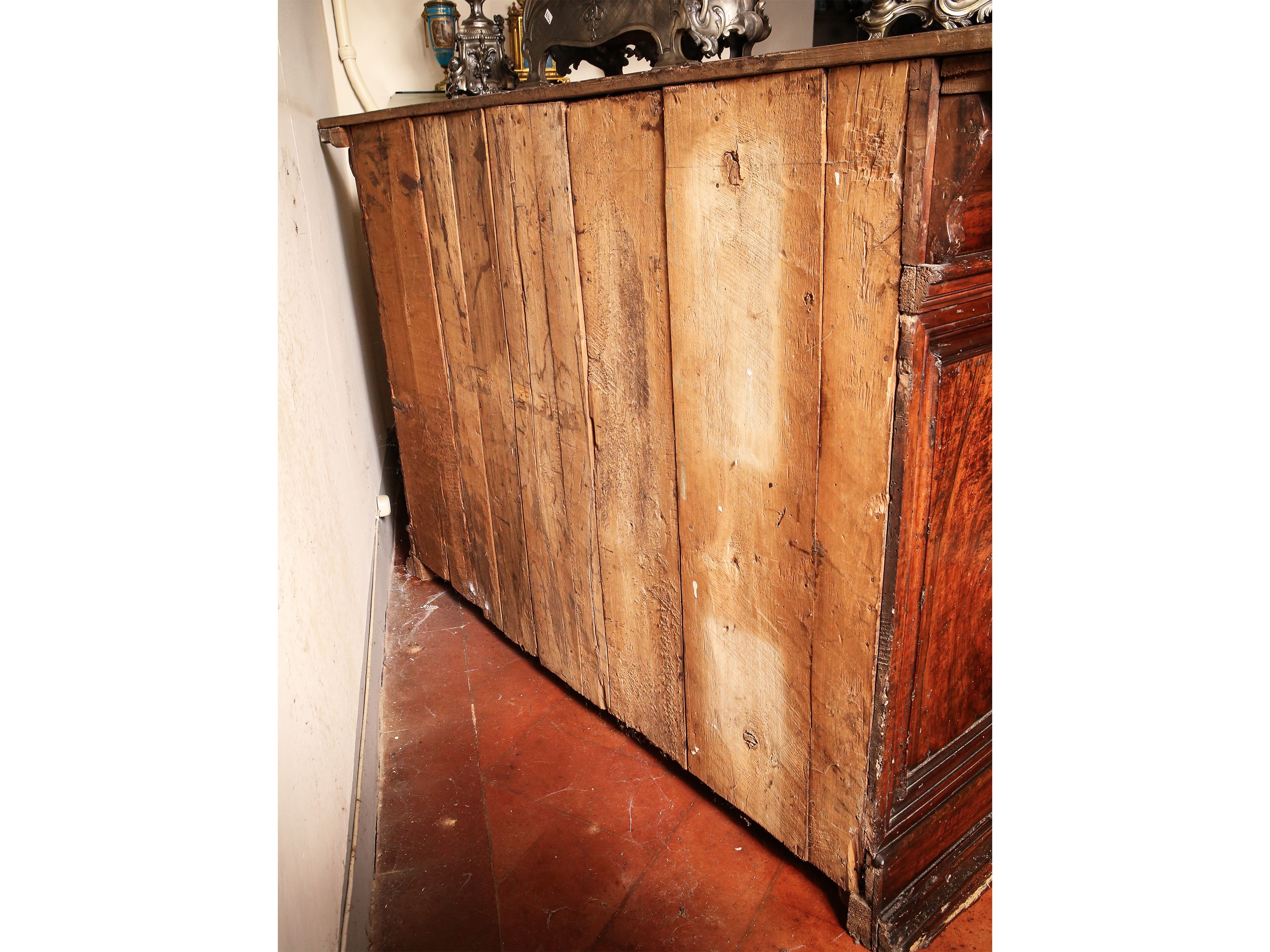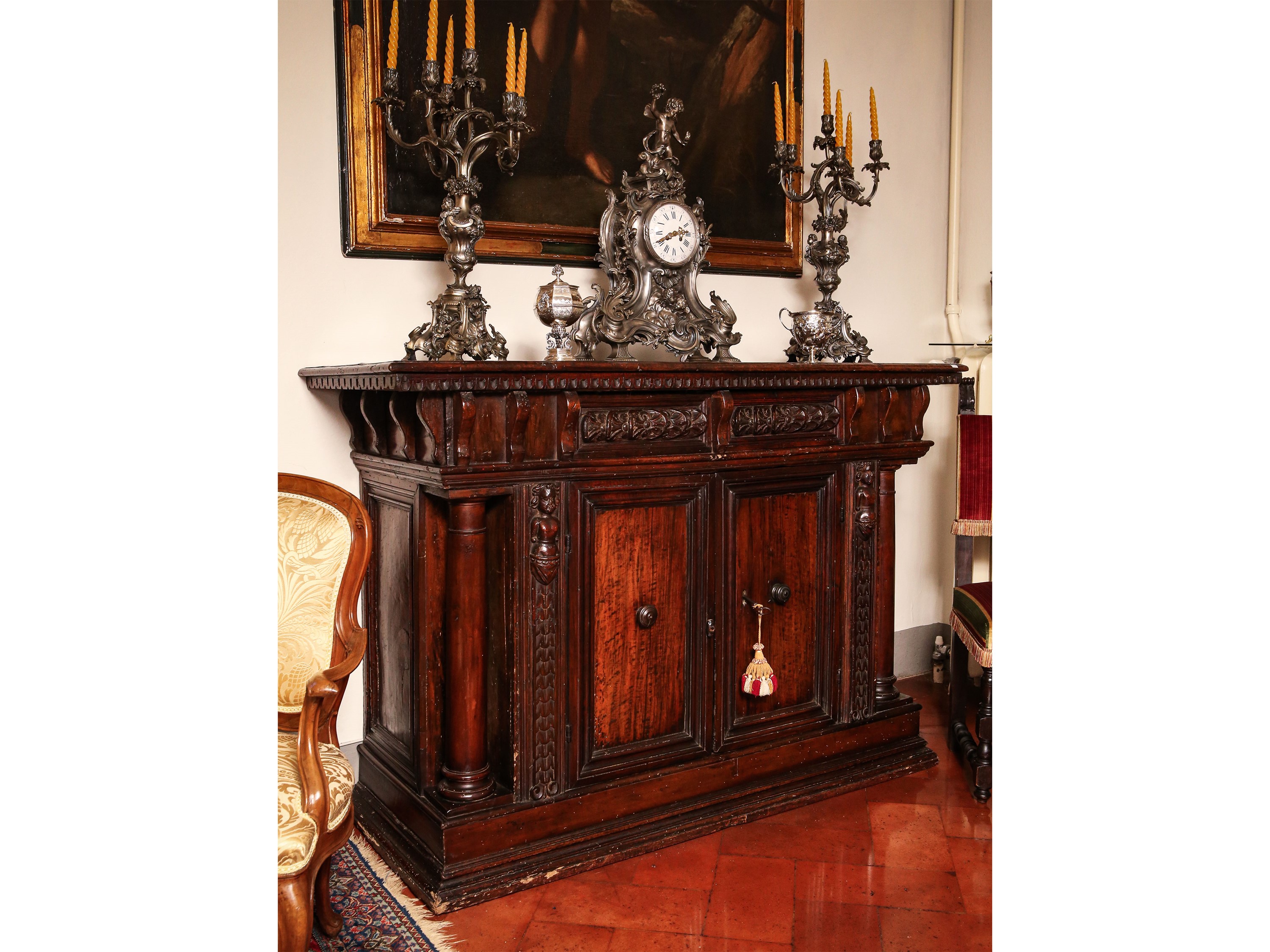 in parte del XVII secolo piano con bordo modanato e gocciolatoio, due mezzi cassetti intagliati a rosoni nella fascia, due sportelli fra doppie lesene a bambocci e a colonna, base a cornice, alcuni restauri e sostituzioni