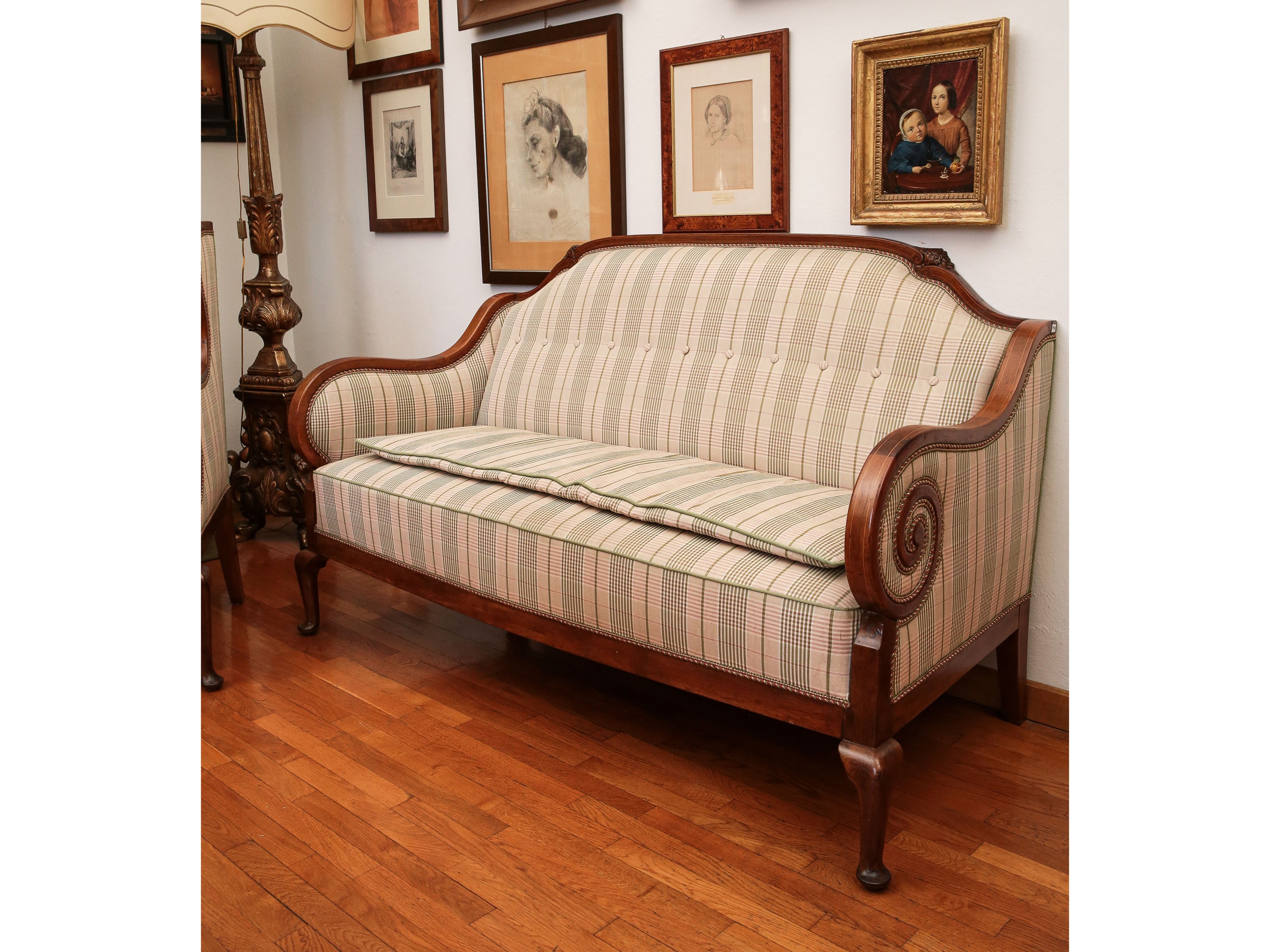 h cm 95x156x67 seconda metà del XIX secolo intarsiato con filettature, schienale sagomato intagliato con piccoli mazzetti di fiori, braccioli a grande voluta, piedi anteriori leggermente mossi, rivestito in tessuto con fantasia a quadretti nei toni del grigio