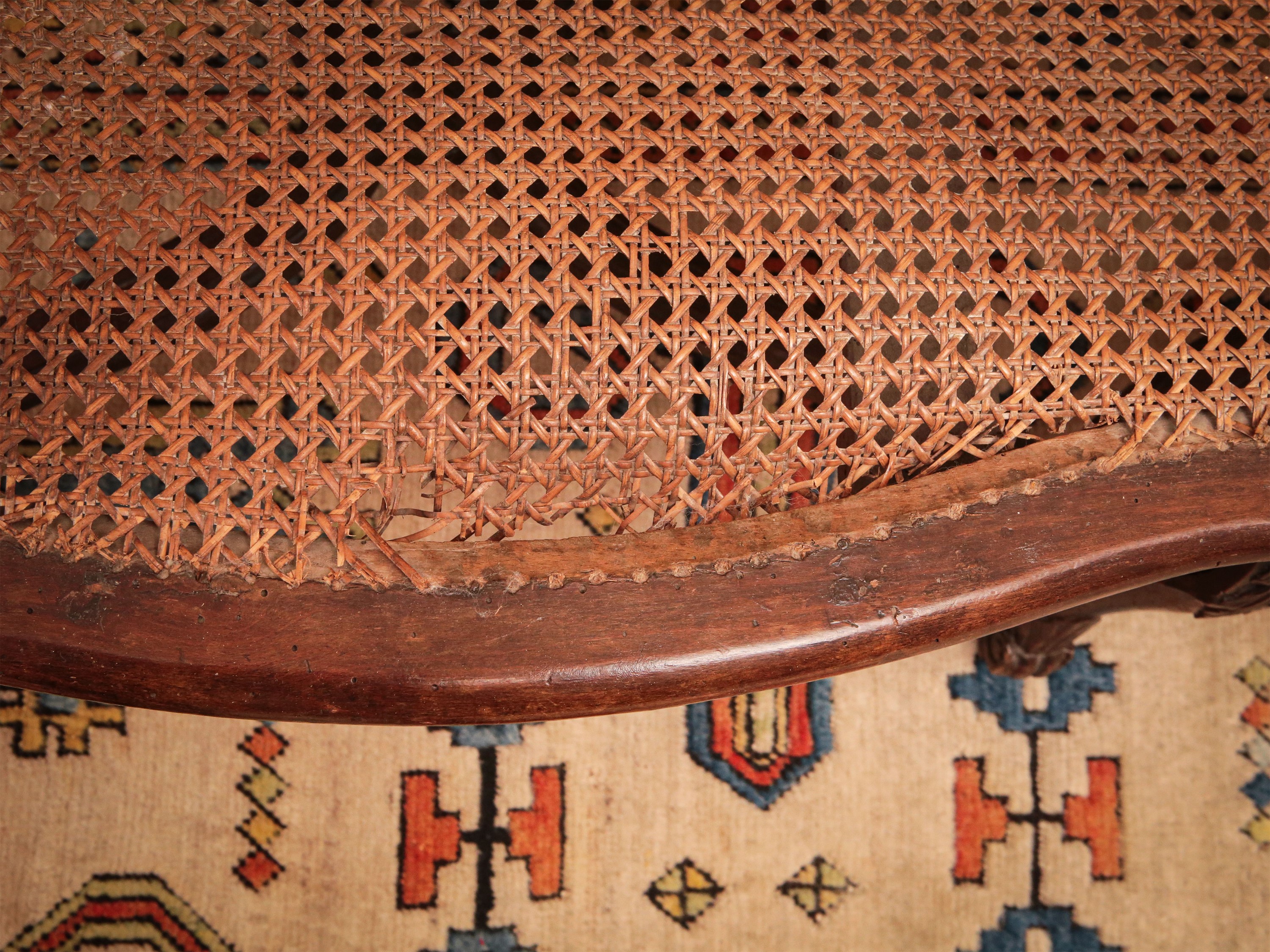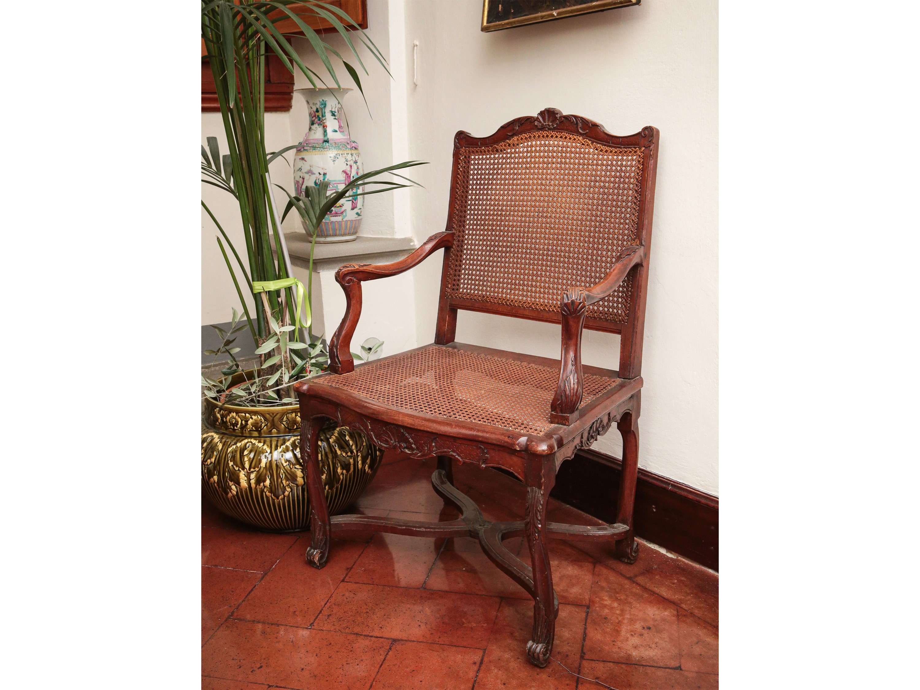 Veneto, XVIII secolo schienali sagomati, centrati da motivo a conchiglia, motivo che si ripete nella pendaglina, braccioli a giorno desinenti a voluta, gambe lievemente mosse riunite da traversa a crociera, rivestite in paglia di Vienna, alcuni difetti al rivestimento