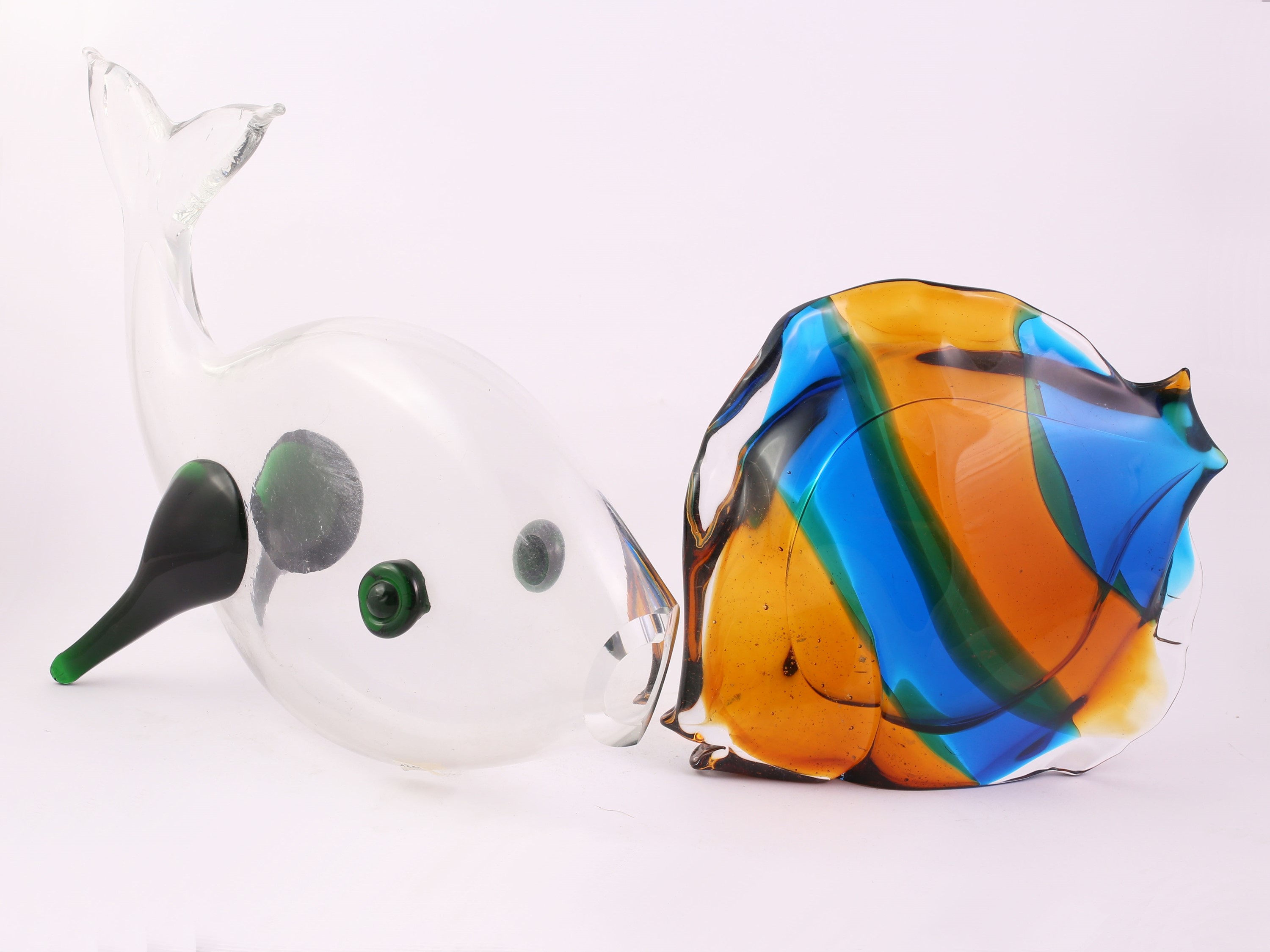 XX secolo uno in vetro sommerso con strisce verticali blu cobalto e verde e uno trasparente con applicazioni verde bottiglia