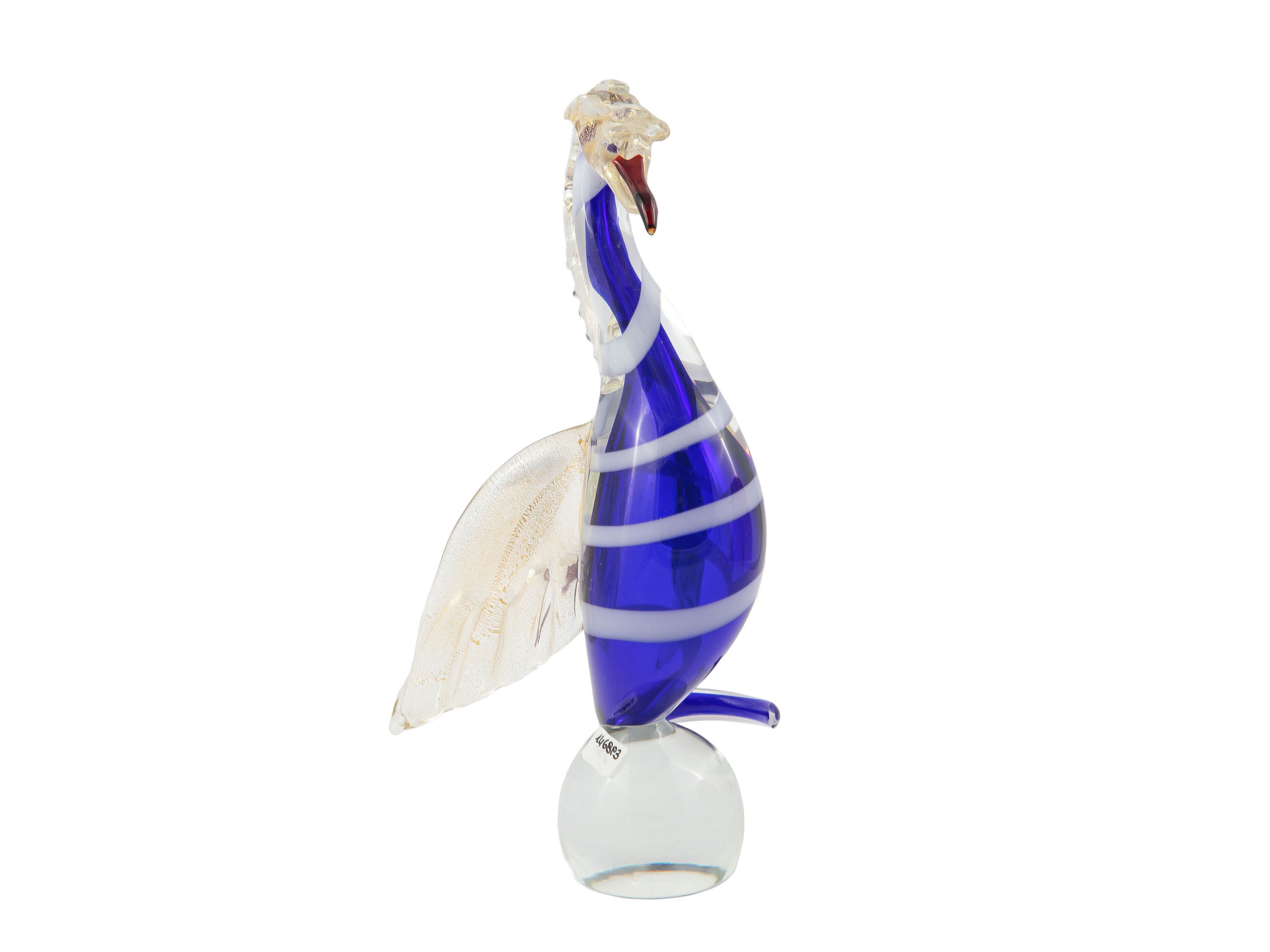 Figura di volatile in vetro soffiato blu con strisce in lattimo