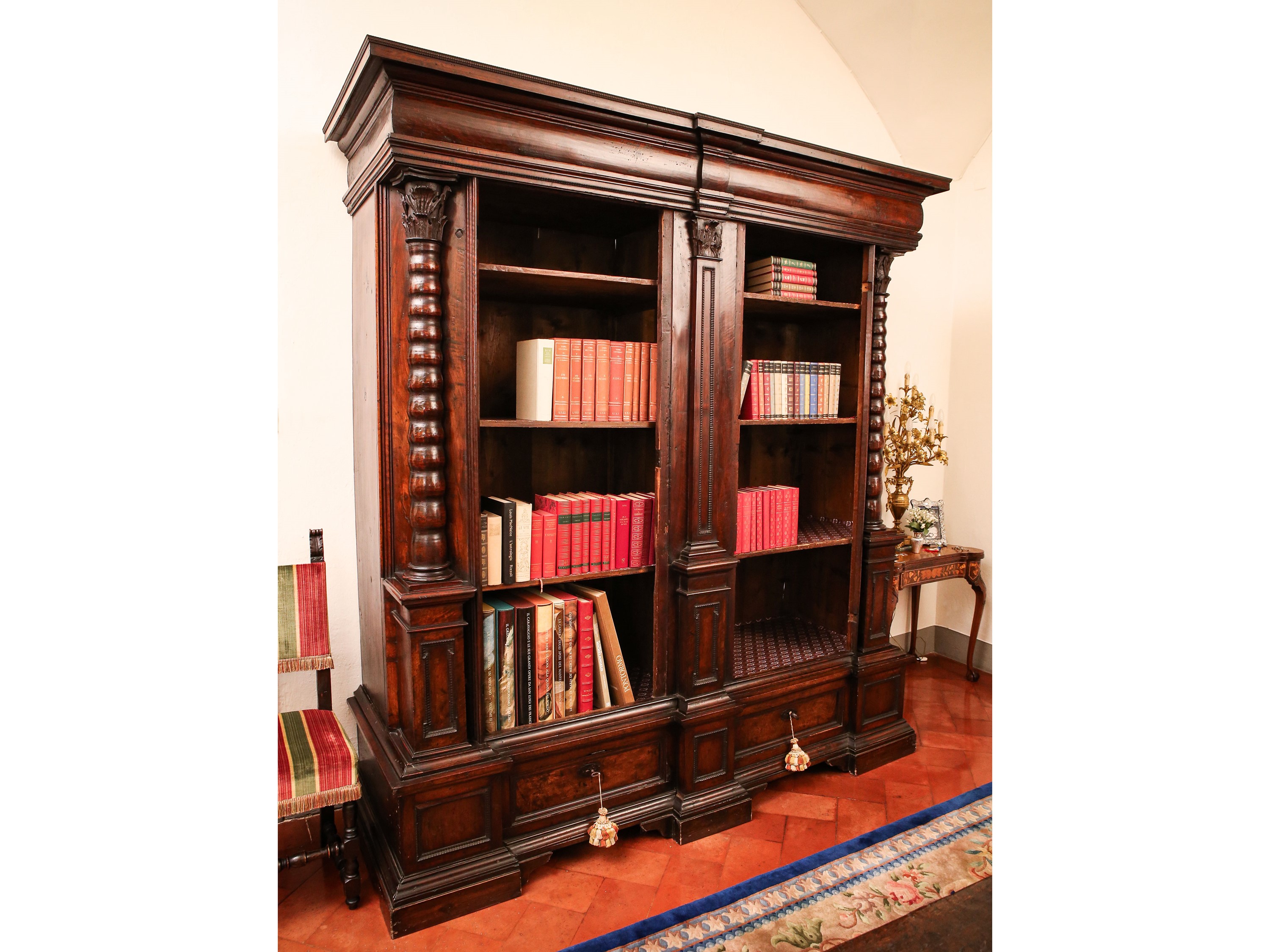 inizio del XX secolo realizzata in stile cinquecentesco, cappello aggettante, due vani con scaffali a giorno tra lesene tortili, alta base architettonica con due cassetti, corredata dai due sportelli (con difetti)
