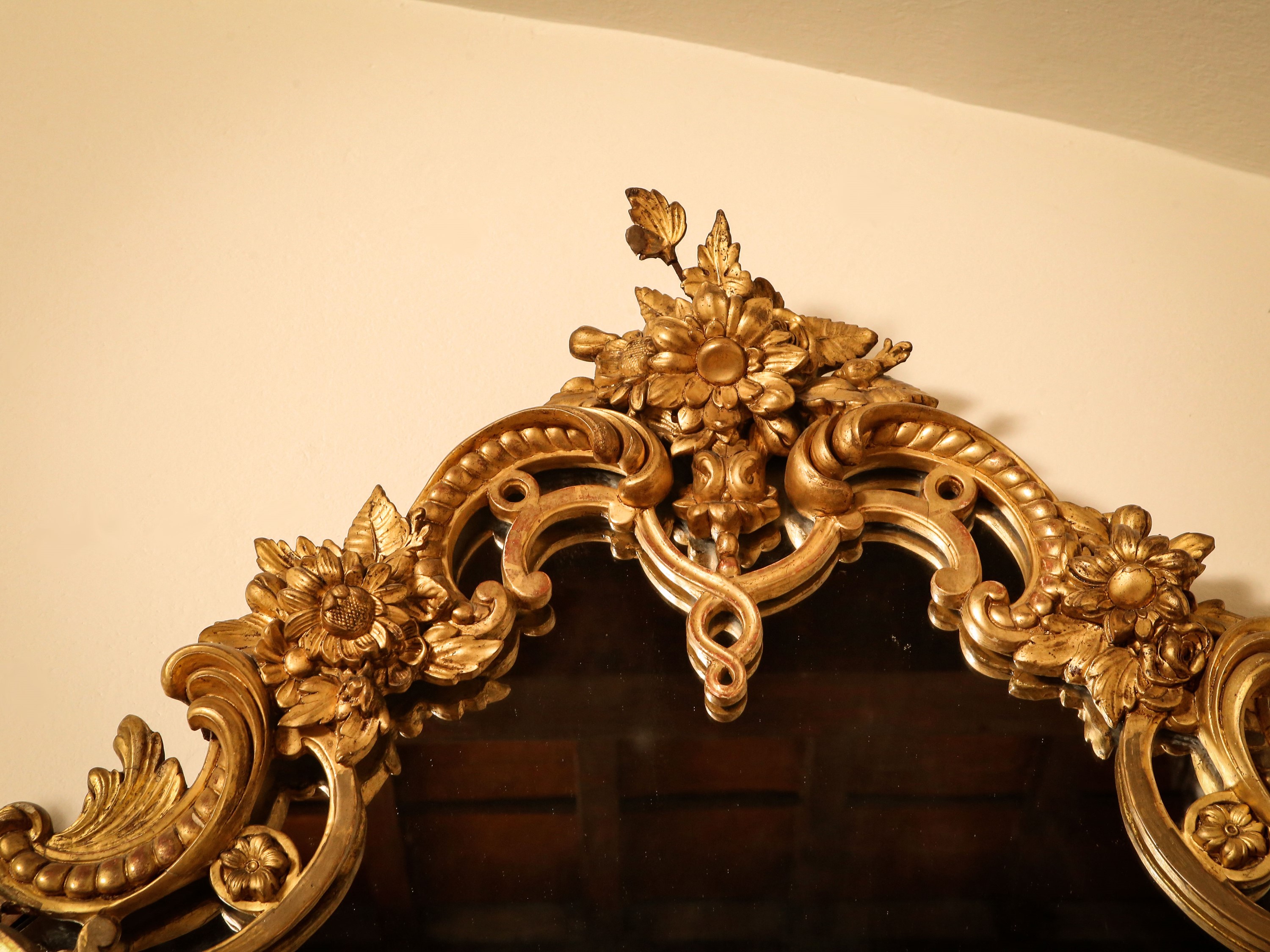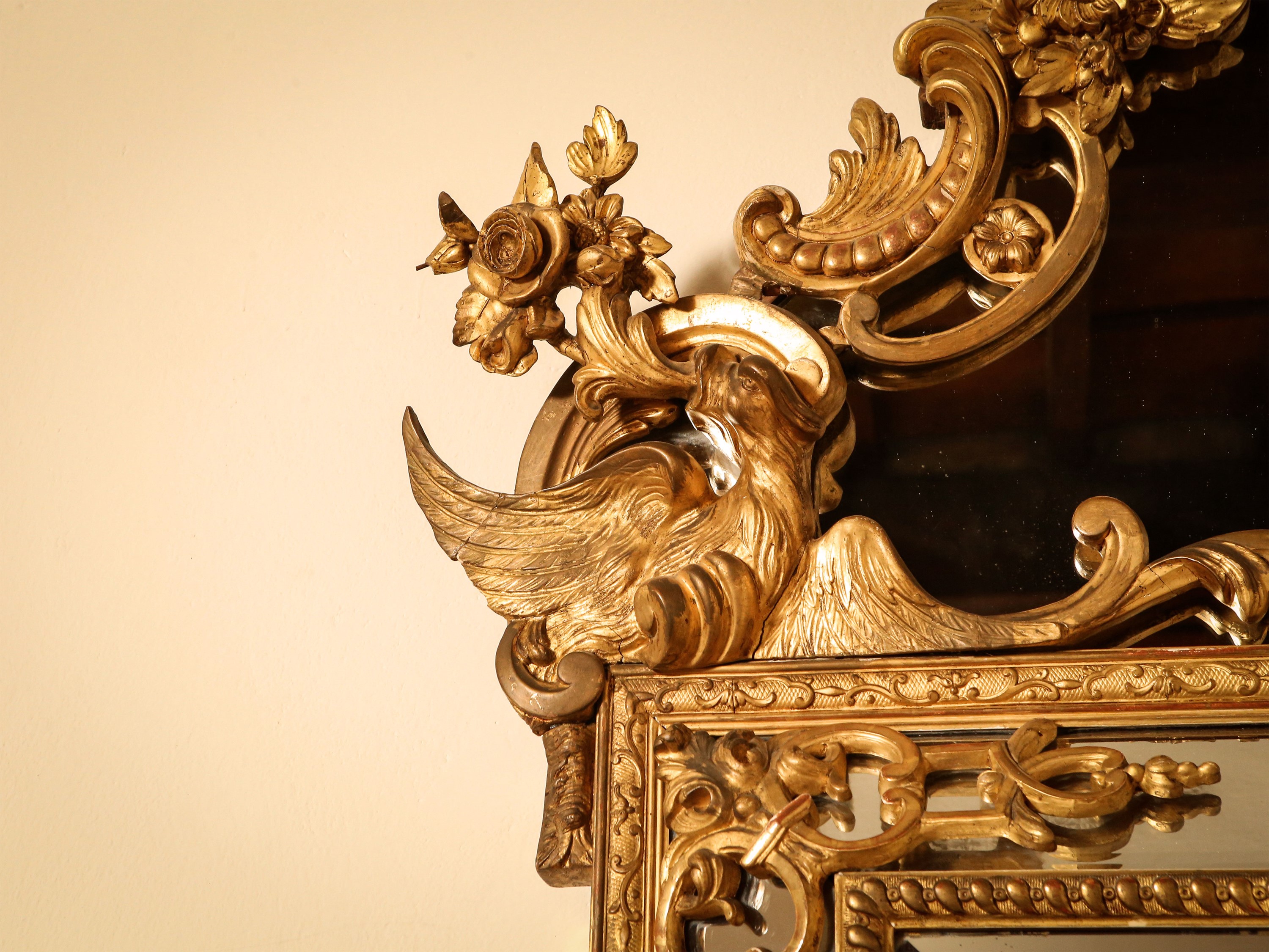 cm 208x123 fine del XIX secolo alta cimasa a cuspide con figure zoomorfe ad ali spiegate, volute e motivi floreali, doppia cornice, il bordo interno baccellato, quello esterno a volute, su alti piedi a ricciolo, lievi difetti