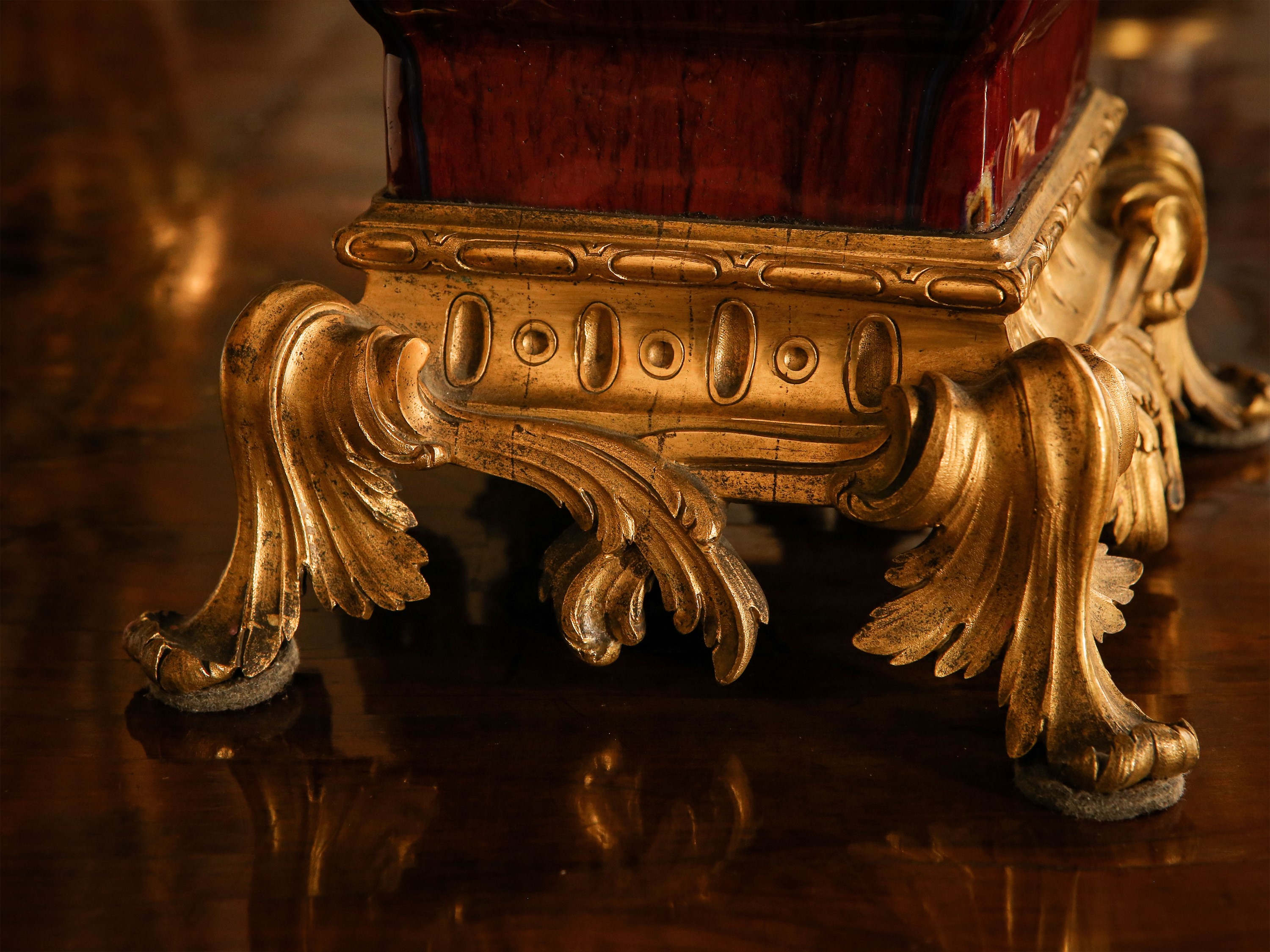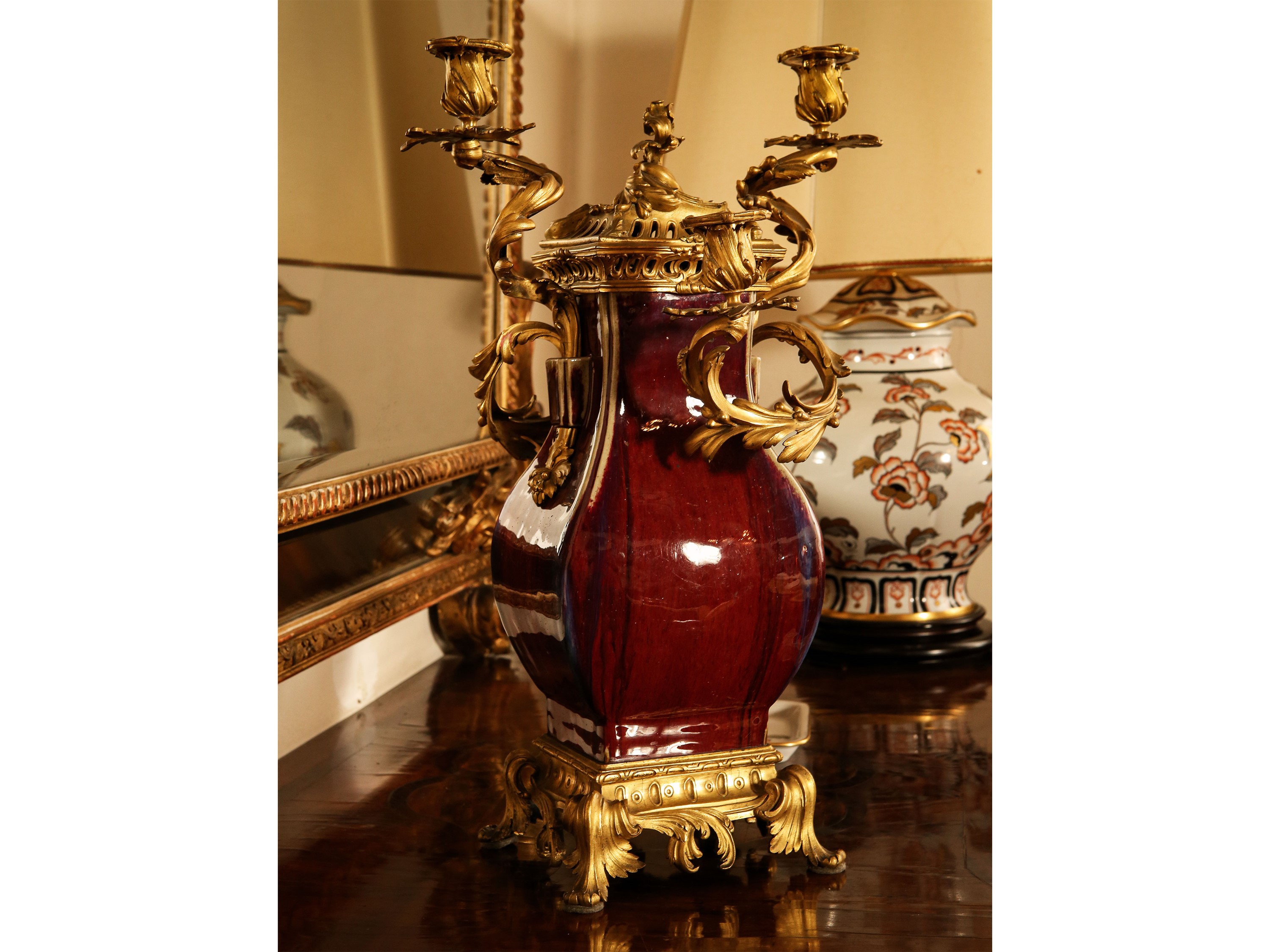 Cina, inizio del XX secolo montato in bronzo dorato a foggia di candeliere, quattro bracci realizzati come rami sinuosi, su base a quattro piedi a volute vegetali