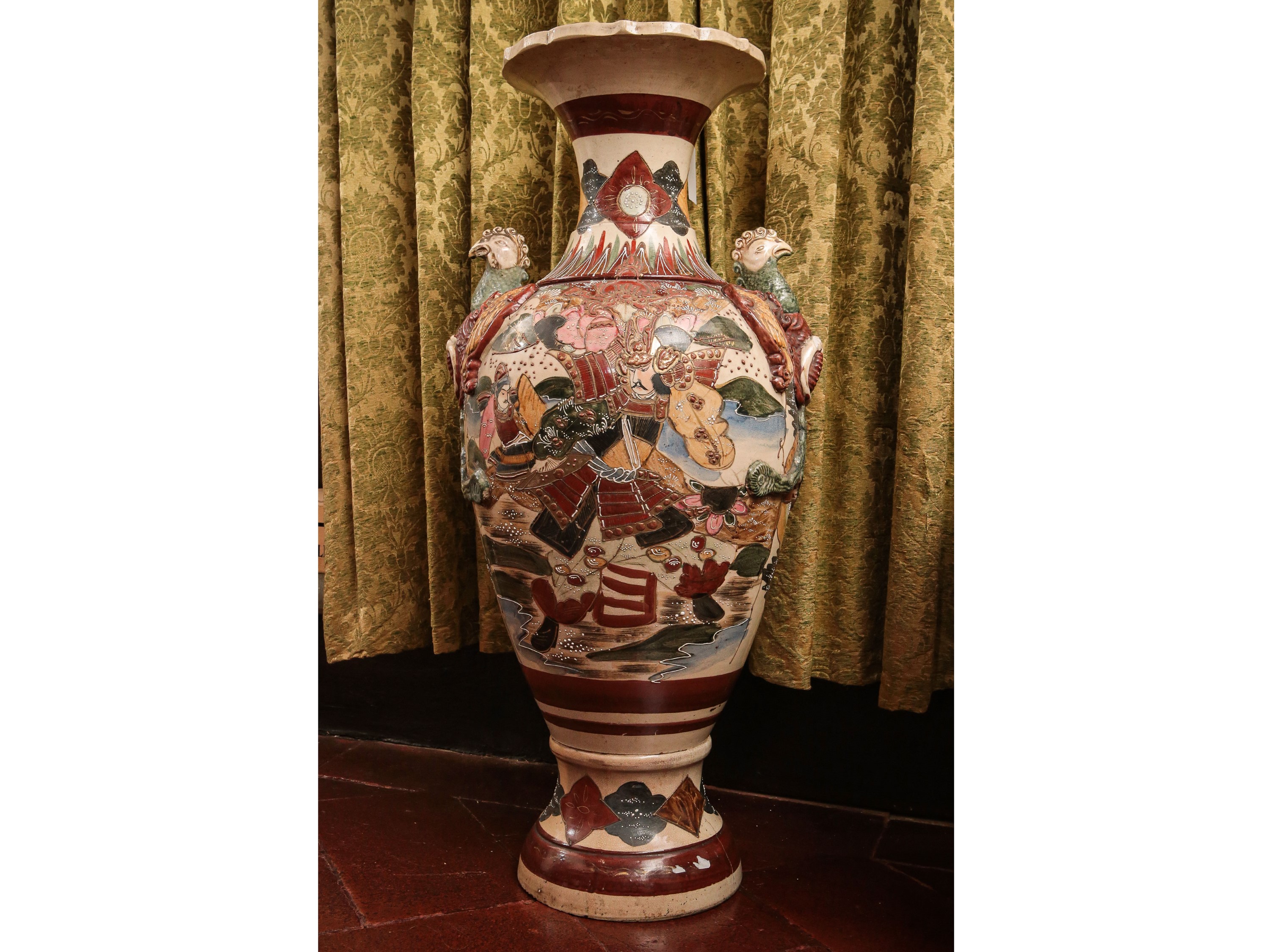 Giappone, inizio del XX secolo alto collo a tromba, corpo ovoidale, interamente dipinto con motivi vegetali, volatili, oggetti simboli benauguranti policromi e lumeggiature dorate, su base in noce a colonna di sezione esagonale