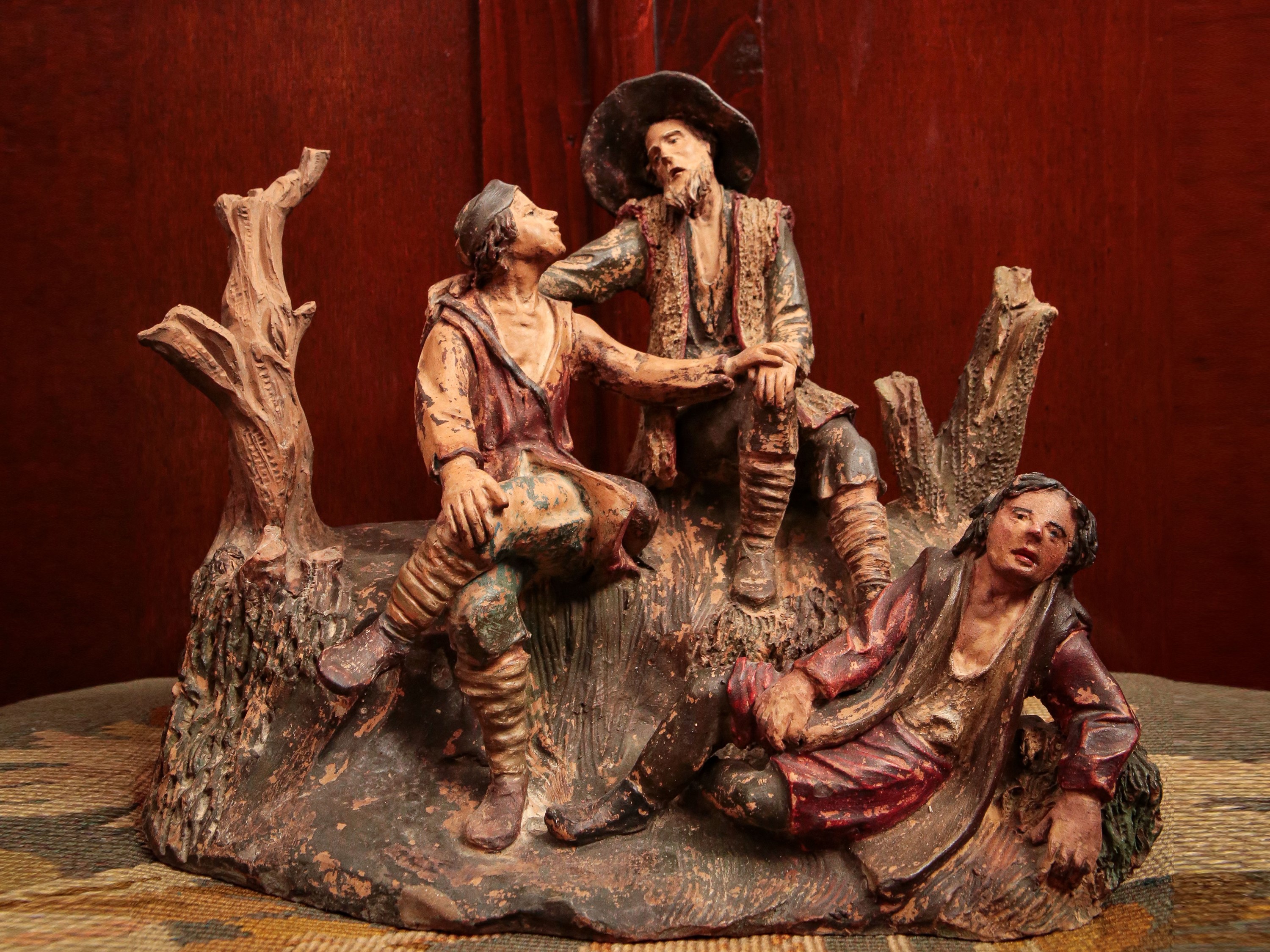 Ambito bresciano, XIX secolo raffigurante tre pastori fra due tronchi, lievi difetti