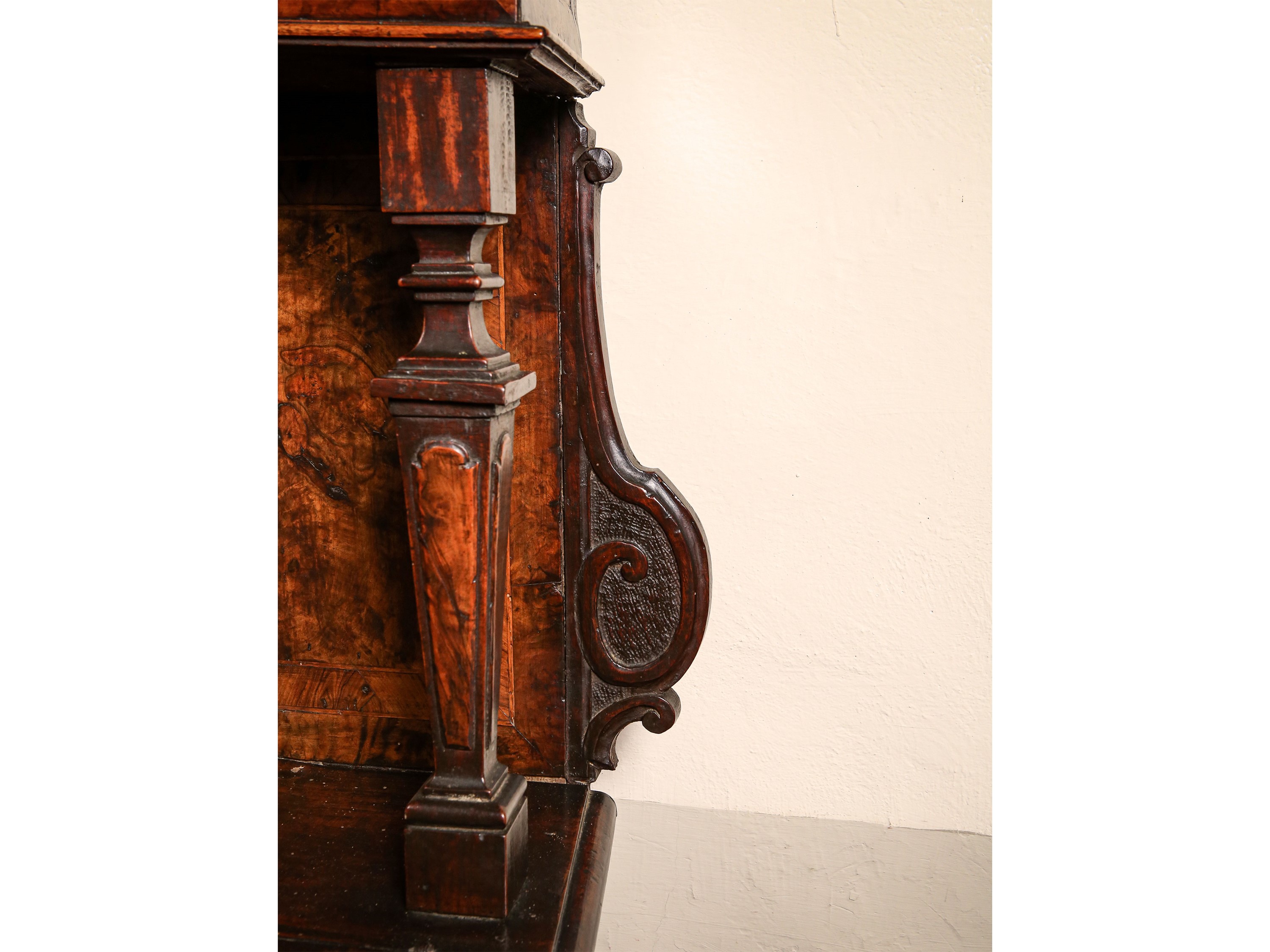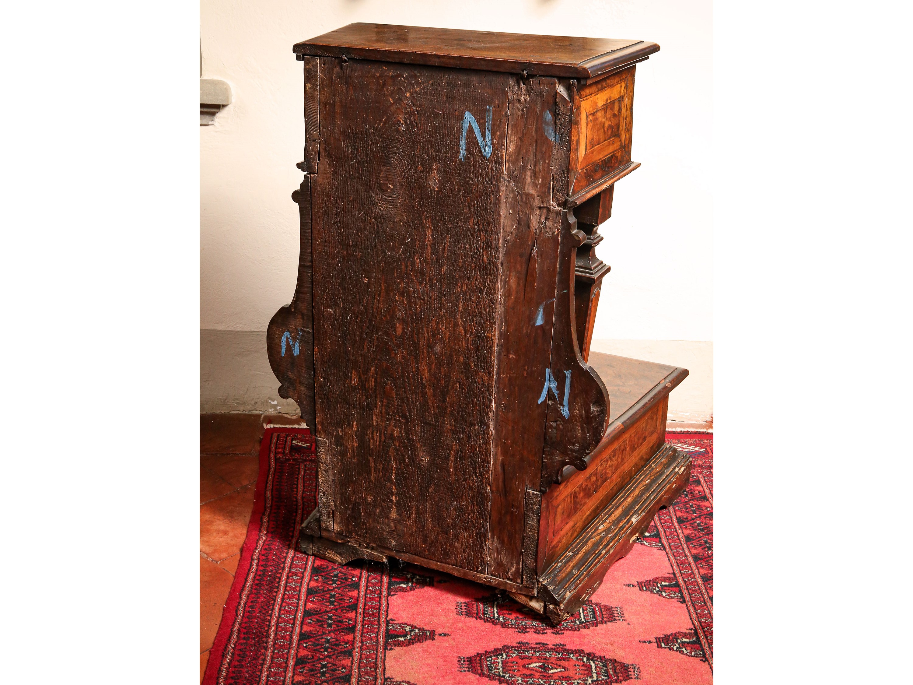 prima metà del XVIII secolo intarsiato con filettature in legni di frutto, un cassetto sorretto da due colonne a faretra, base da alzarsi, piedi a mensola, mancanze e difetti all'impiallacciatura