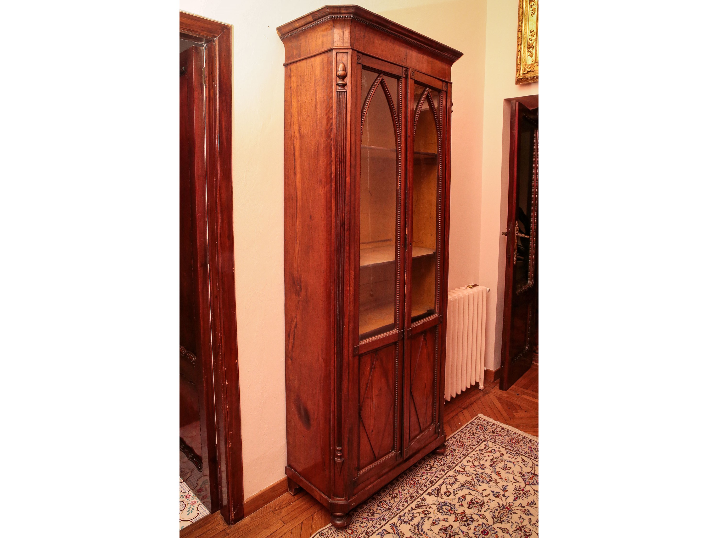 Libreria-vetrina impiallacciata in piuma di mogano