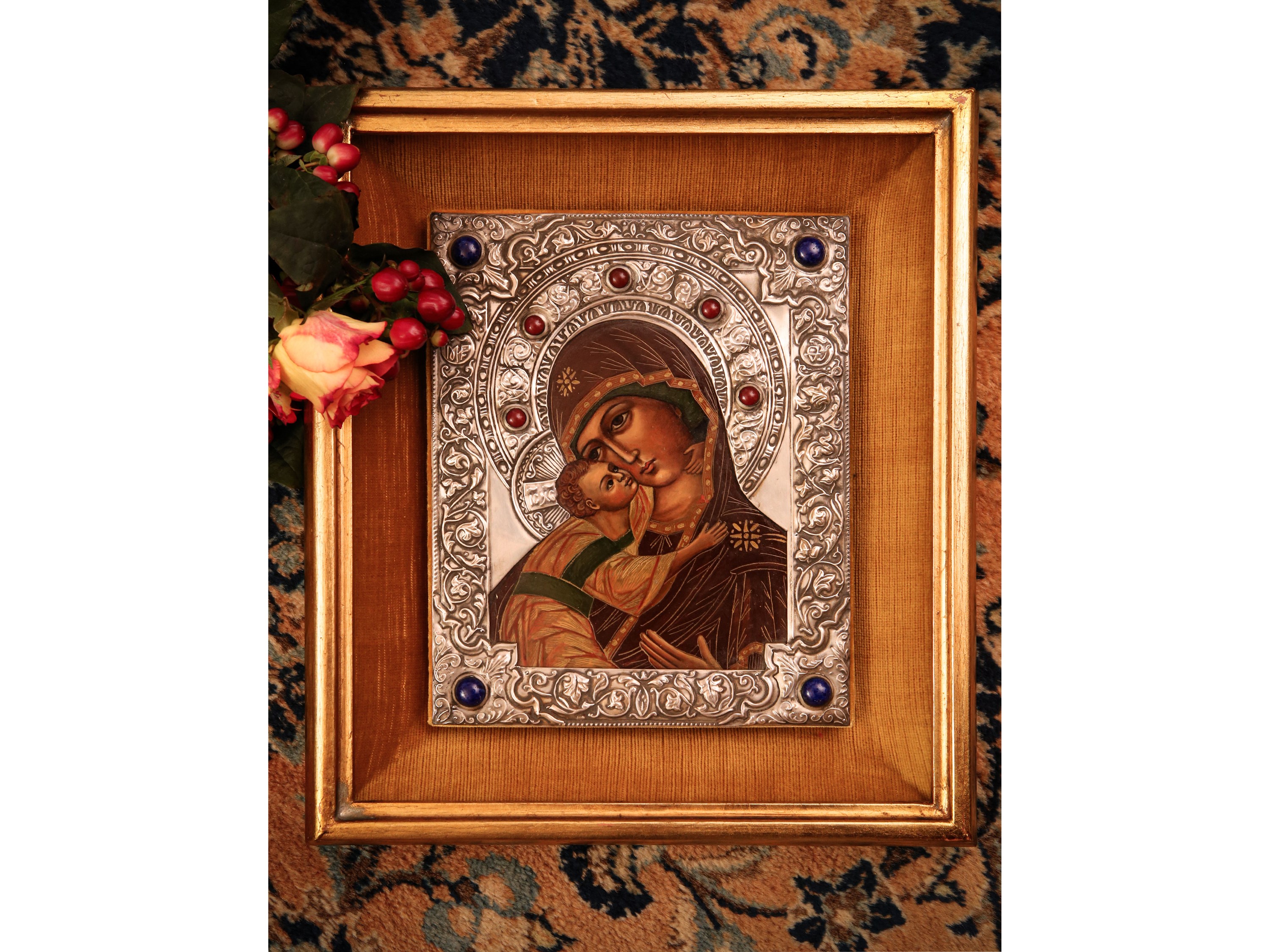 XX secolo icona a tempera su tavoletta con ritza in metallo argentato impreziosita da cabochon in paste vitree, in cornice