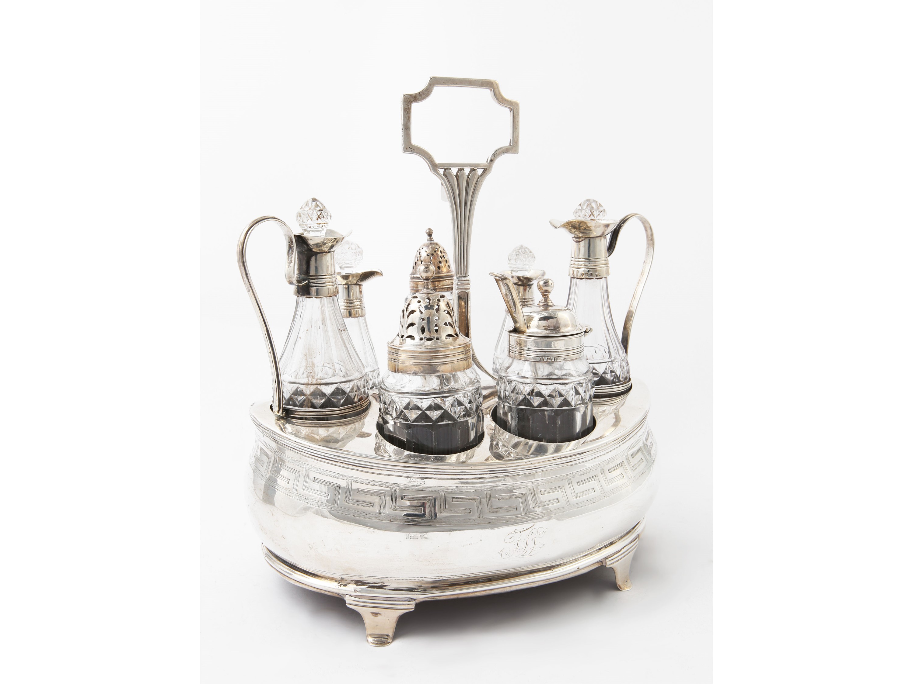 Londra, 1806 realizzata come un cestino ovale con alto bordo convesso e cesellato con motivo a greca, sette flaconi di varie tipologie rilegati in argento, presa centrale sagomata, base in legno