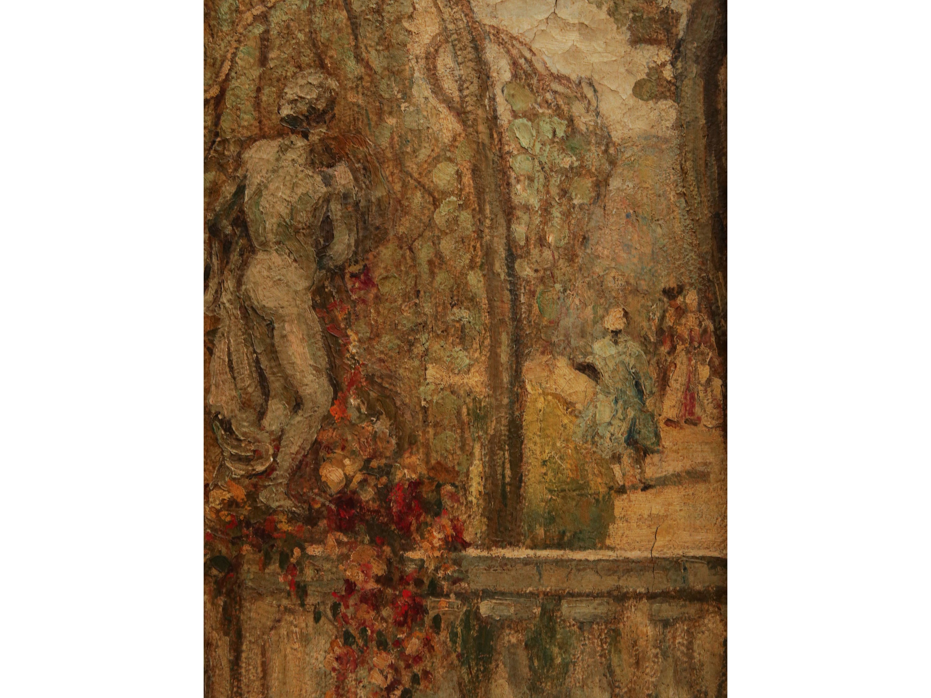 inizio del XX secolo le tre ante dipinte ad olio su tela con scena galante di gusto settecentesco in un parco, alcuni difetti