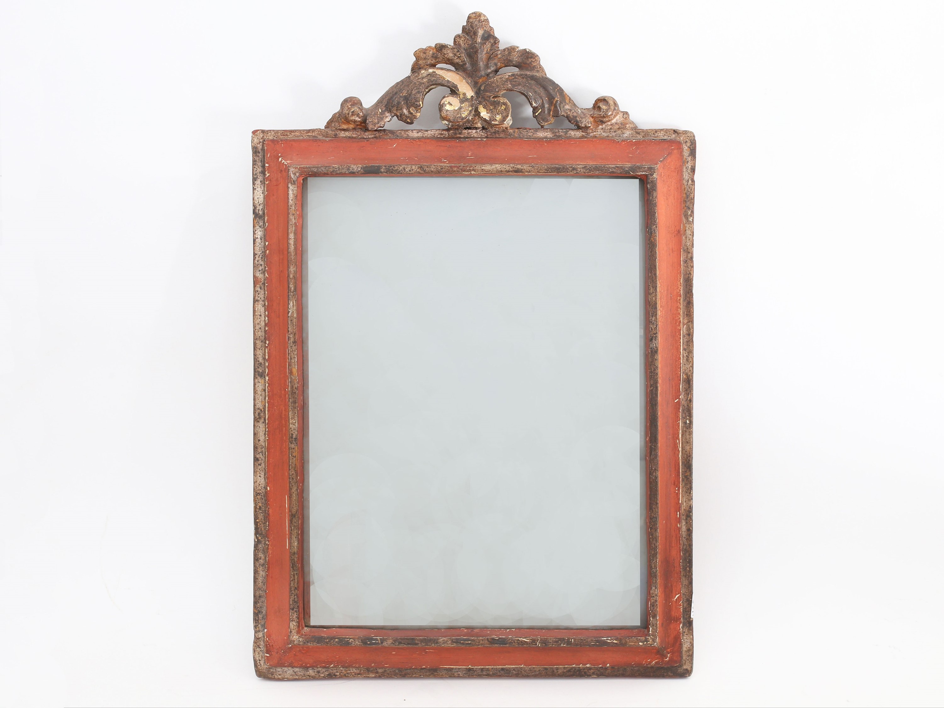 XVIII/XIX secolo laccata nei toni del rosso mattone, profili e cimasa a fregio dorati, bordi modanati, con specchio