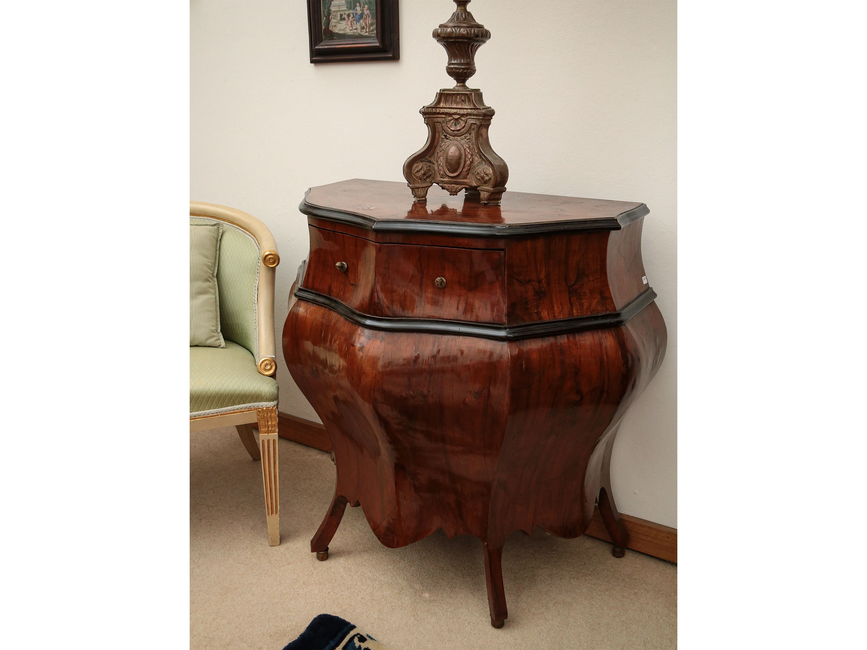 h cm 80x70x48 in parte della metà del XVIII secolo realizzato ad urna, un cassetto sul fronte bombato, due sportelli al verso, probabilmente aperti in epoca posteriore, pendaglina mossa, piedi a sciabola su ruote