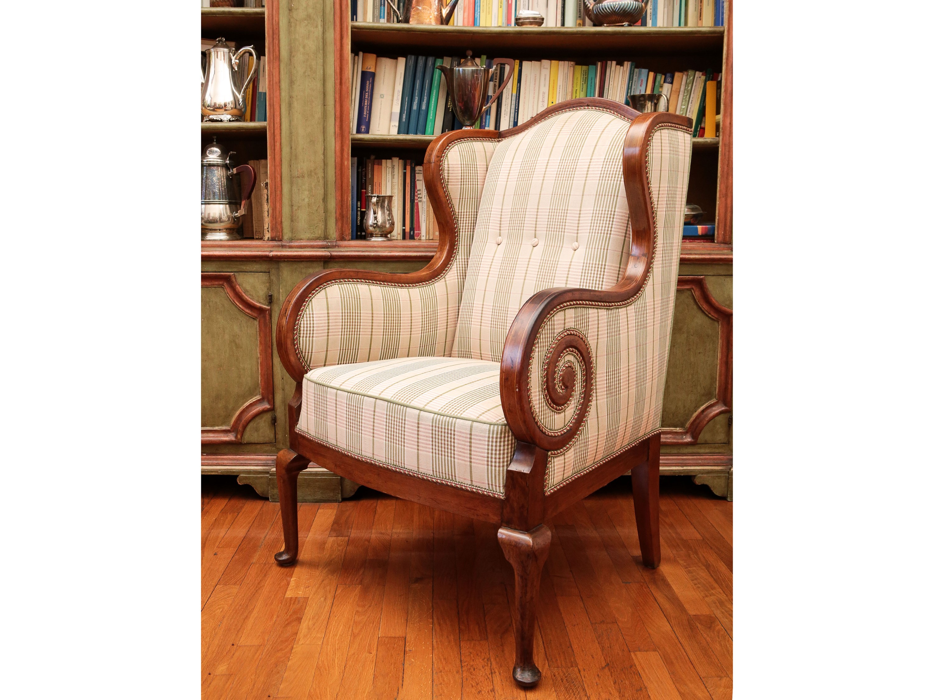 seconda metà del XIX secolo intarsiata con filettature, schienale sagomato, braccioli a grande voluta, piedi anteriori leggermente mossi, rivestita in tessuto con fantasia a quadretti nei toni del grigio