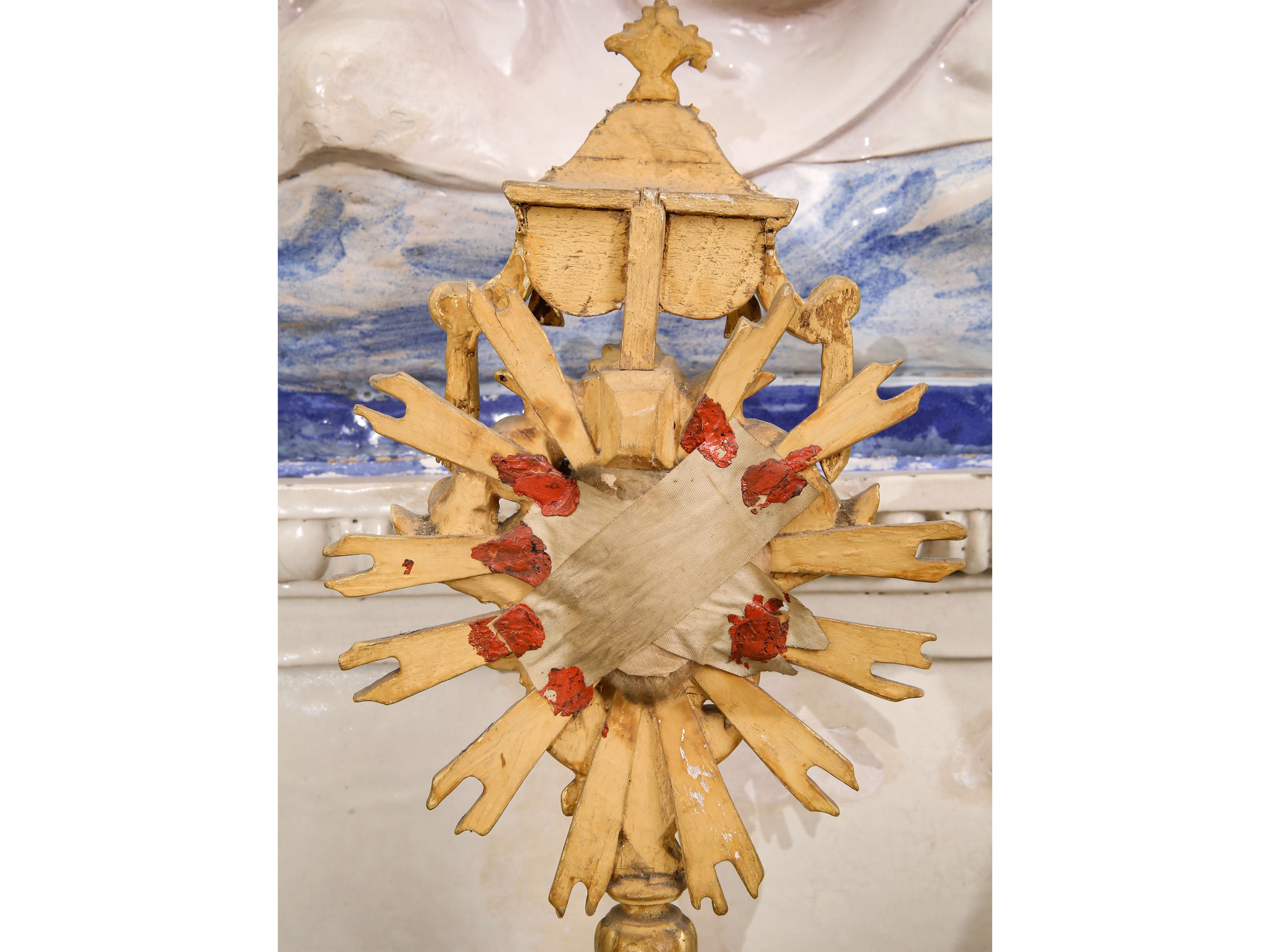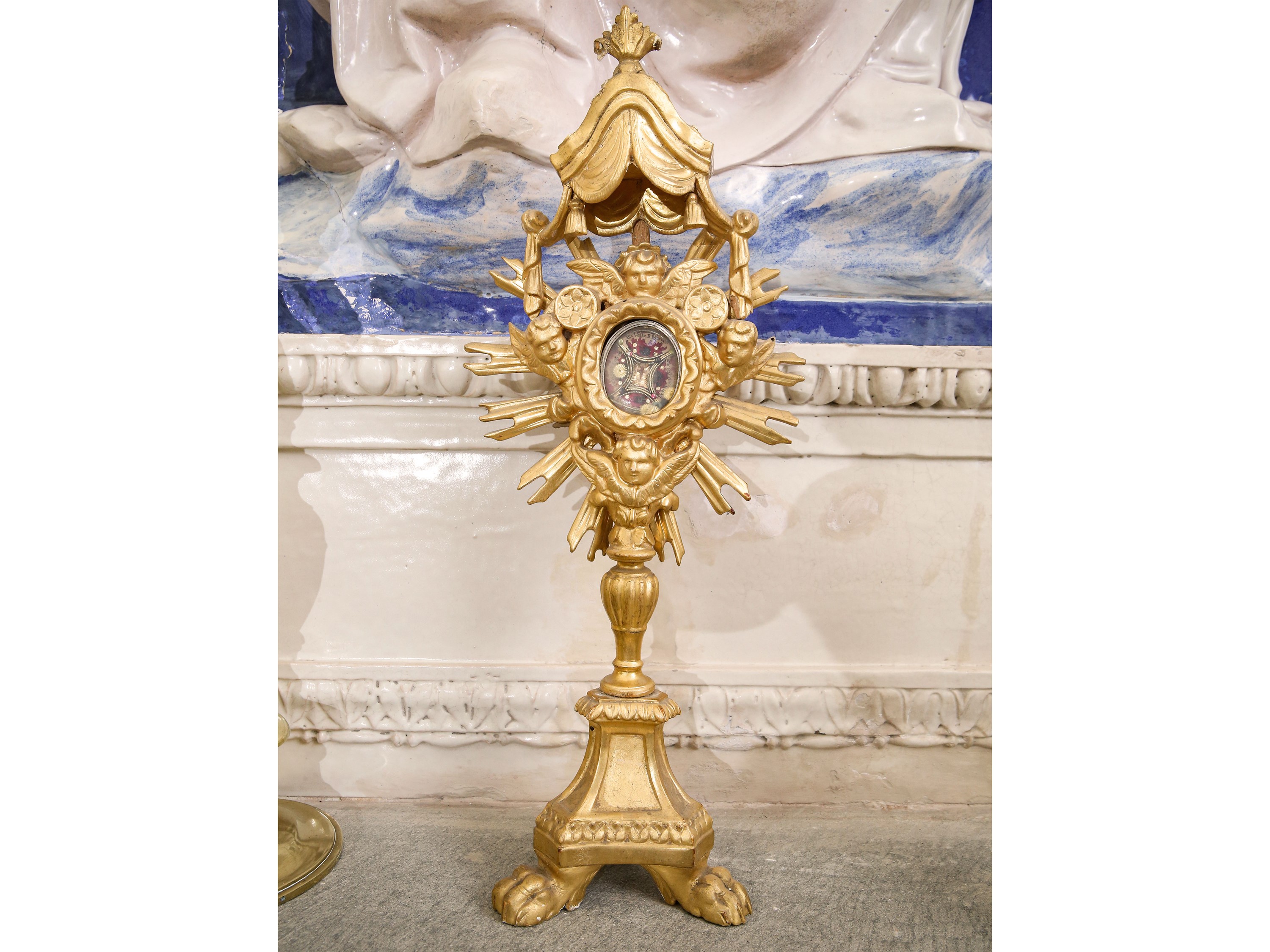 fine del XVIII secolo cimasa a baldacchino, luce ovale tra trionfo di cherubini e raggiera, piedi ferini