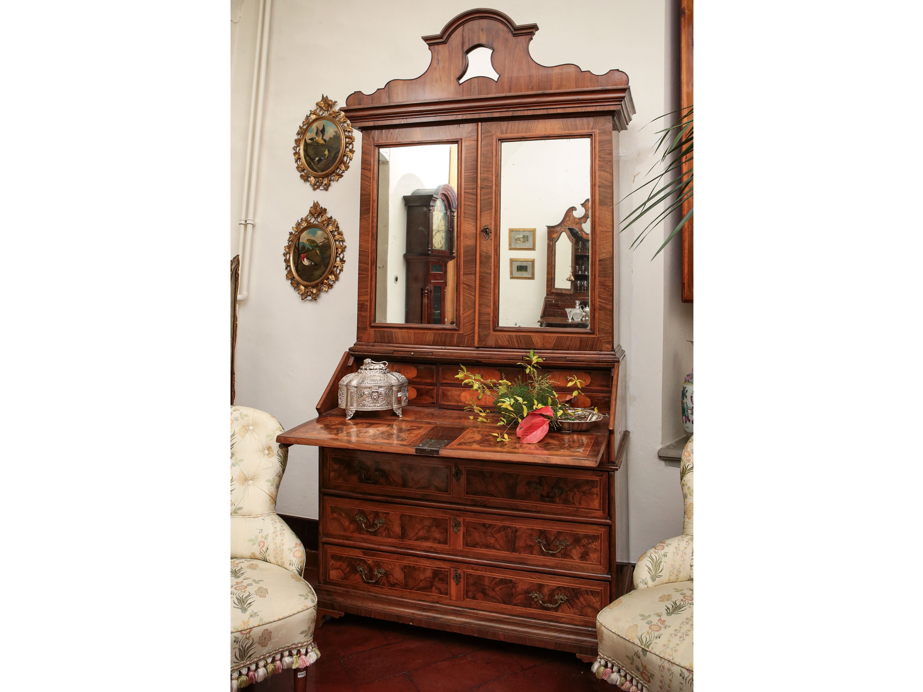 XVIII/XIX secolo dettagli ebanizzati, cimasa con voluta centrale con specchio, due ante a specchio, nella parte inferiore sportello a calatoio a celare scarabattolo, tre cassetti sottostanti, piedi a mensola, alcuni difetti, la parte superiore non coeva