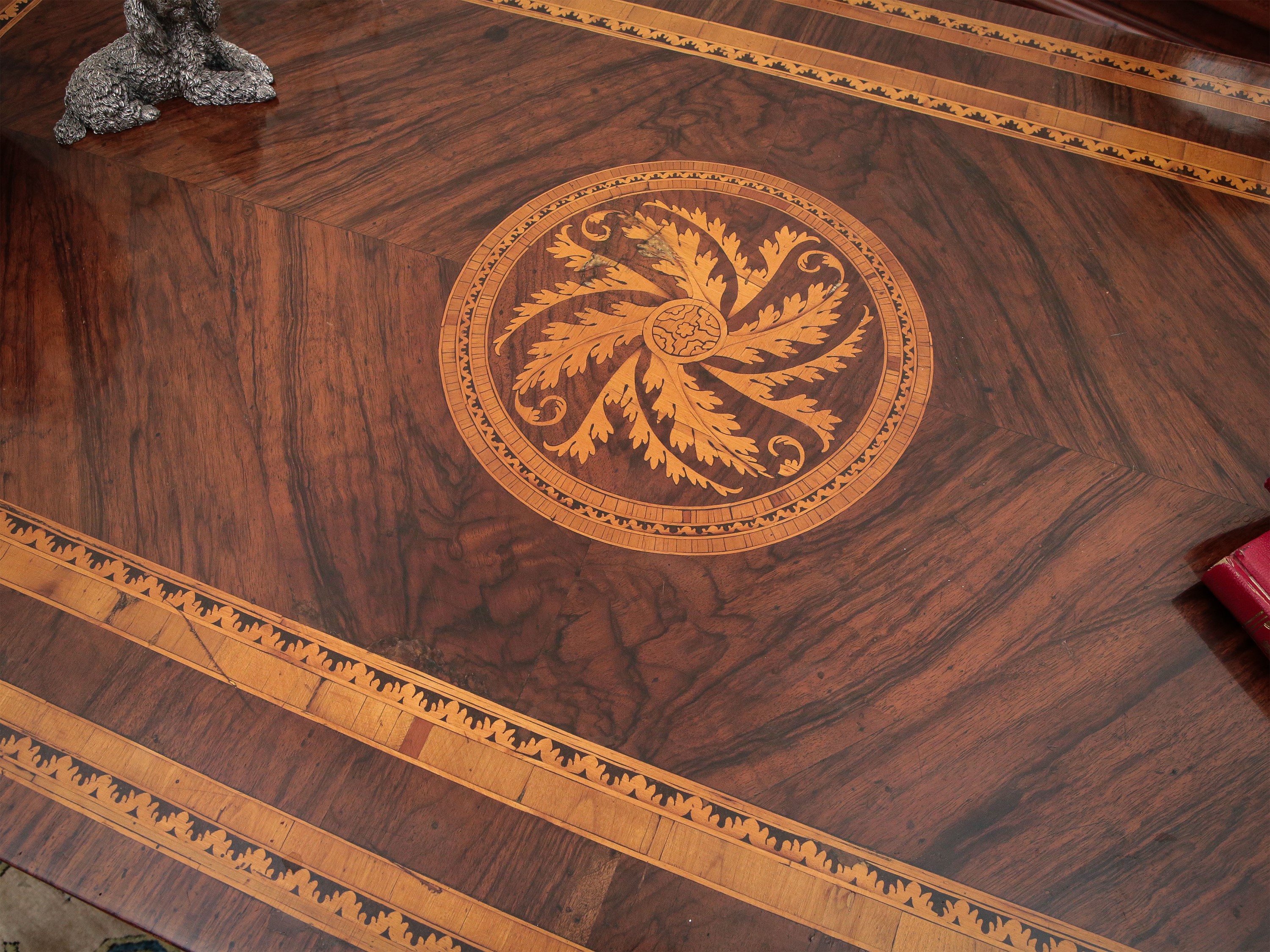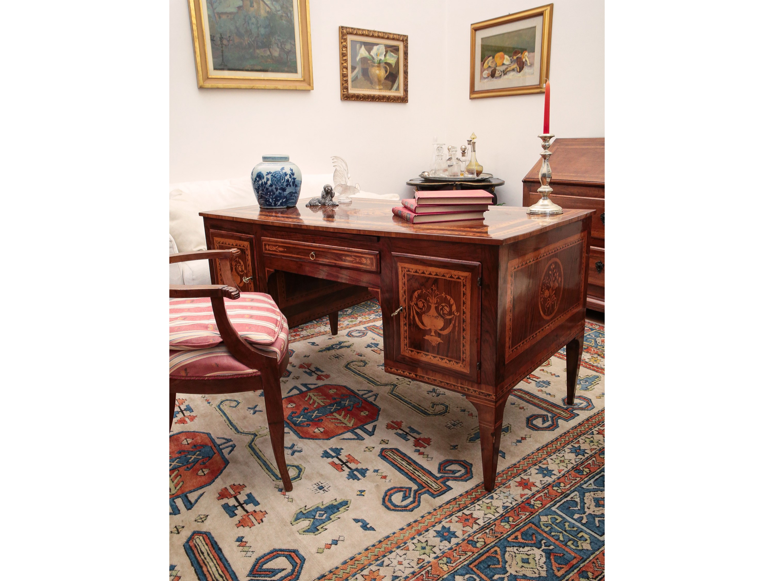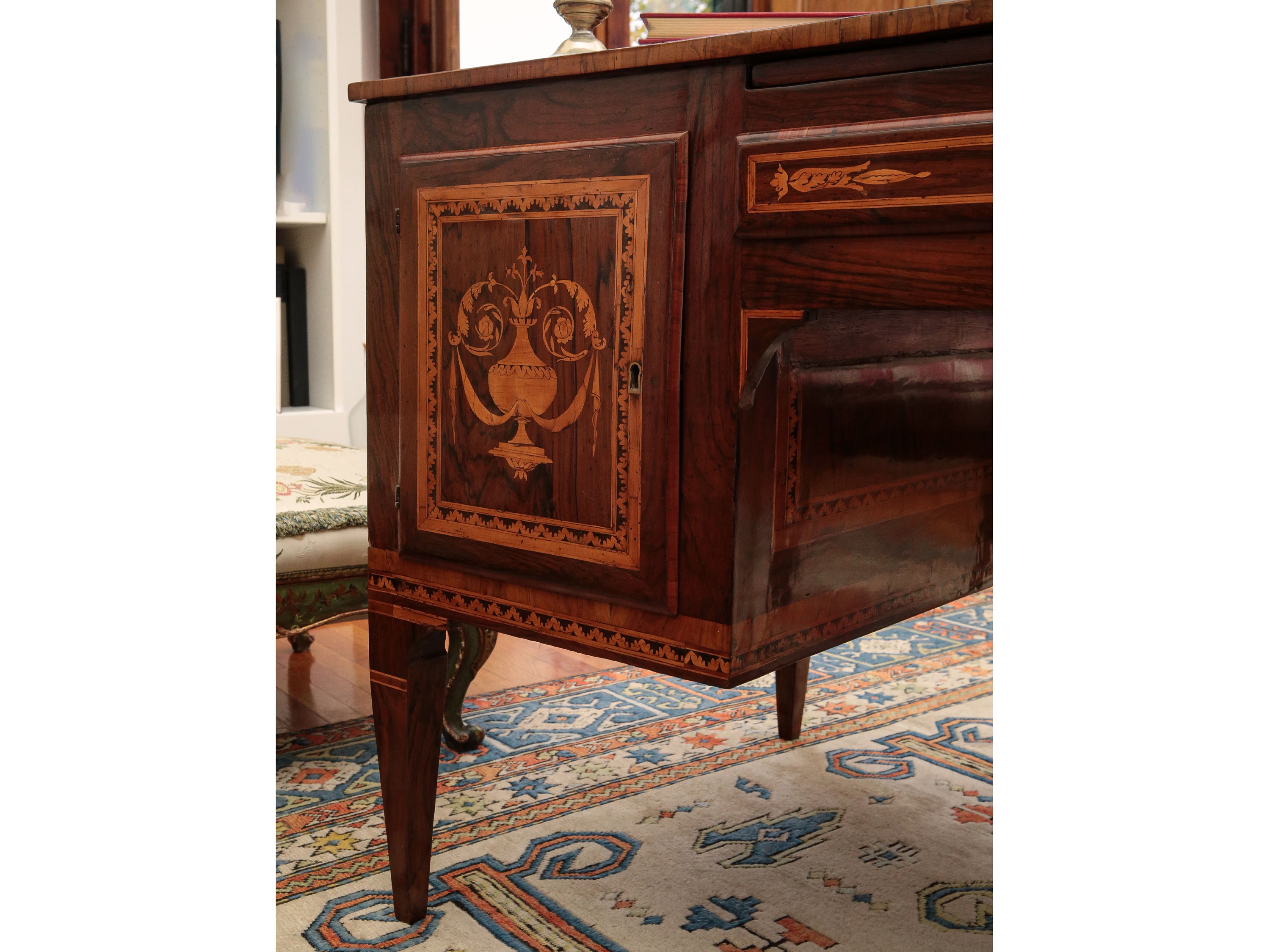 h cm 76x140x75 fine del XVIII/inizio del XIX secolo interamente intarsiata in legni di frutto alla Maggiolini con filettature a palmette, motivi a vasi e rosoni, utilizzabile da entrambi i lati con tiretti sotto il piano, cassetto centrale e due sportelli laterali, gambe a faretra, alcuni difetti