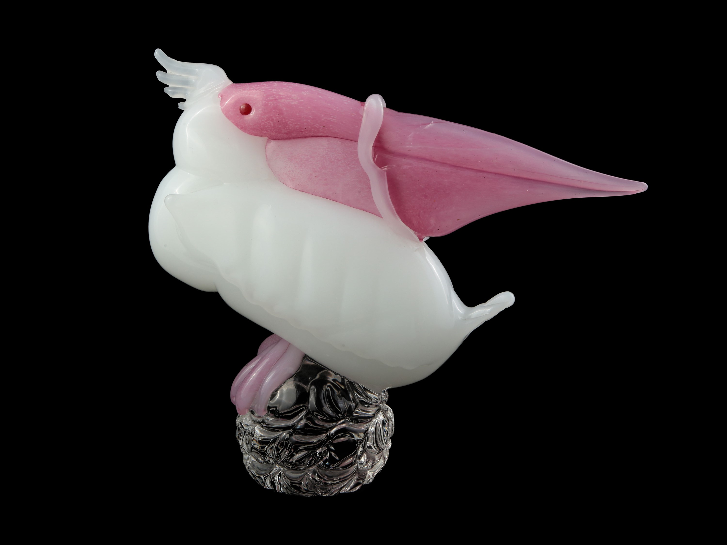 Murano, seconda metà del XX secolo con applicazione a caldo di becco e zampe in vetro rosa. Poggiante su base trasparente, occhi in pasta vitrea rossa.
