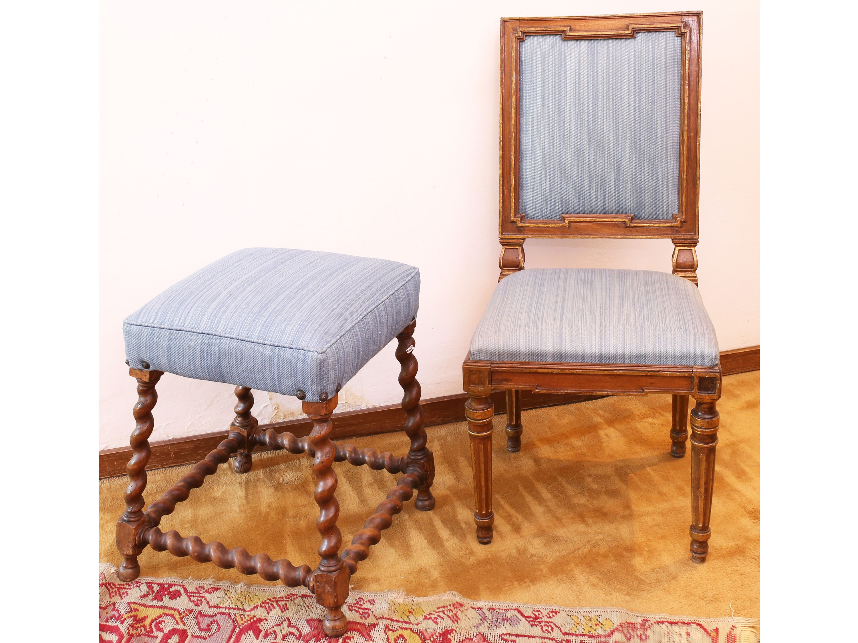 (2) Piemonte, fine del XVIII secolo lumeggiata in oro, schienale rettangolare con cornici modanate, gambe a faretra scanalate con attacco a rosone, abbinata a sgabello con gambe svasate e traverse a torchon, sedie quadrato, entrambi rivestiti in tessuto azzurro