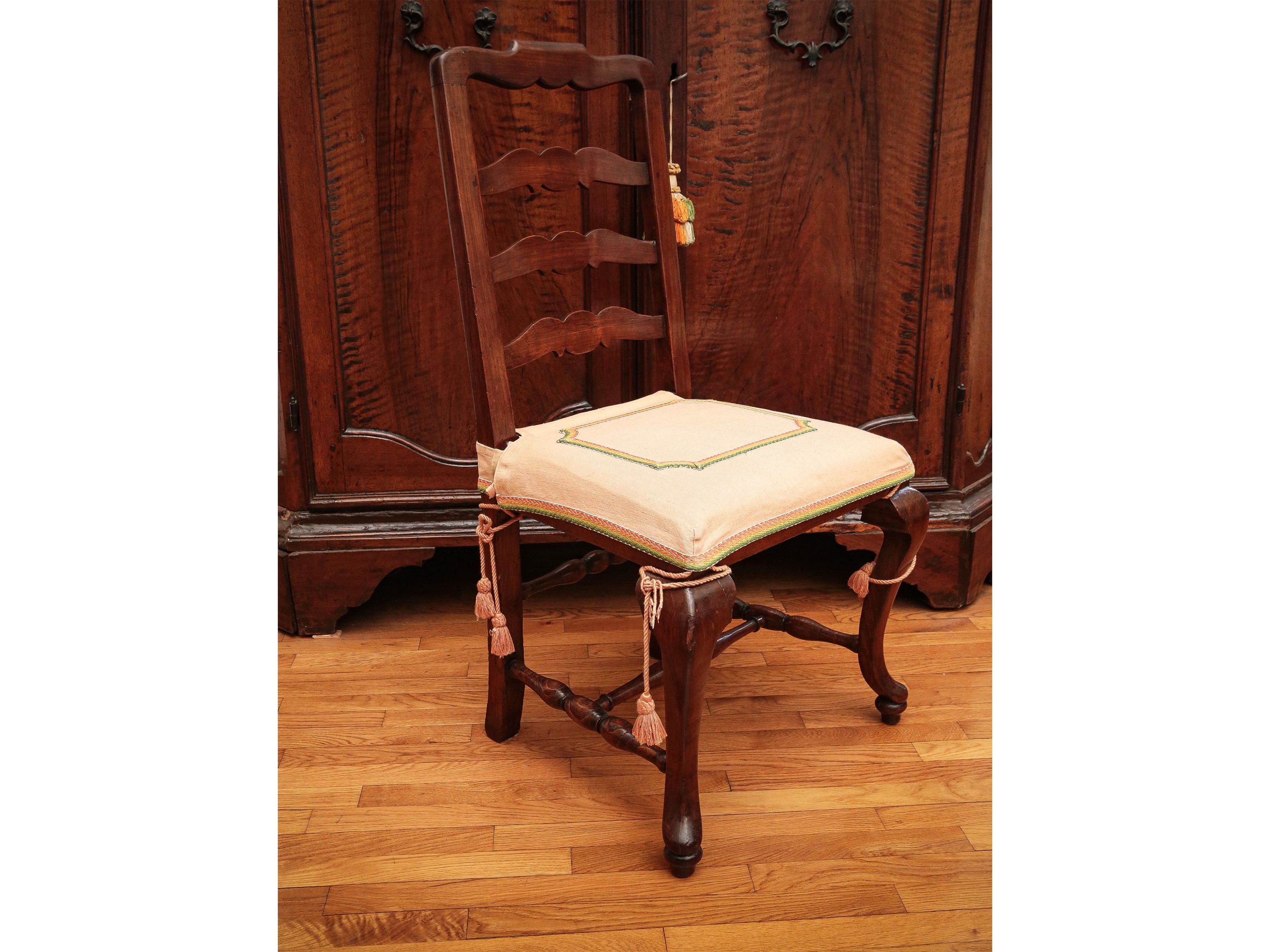 poltrone h cm 100x64x51 (8) XIX/XX secolo realizzate in stile seicentesco, schienali con triplice cartella sagomata, gambe anteriori leggermente mosse riunite alle posteriori a sciabola da traverse tornite, sedili imbottiti e rivestiti in tessuto giallo oro, le poltrone realizzate in epoca posteriore, corredate da coprisedile in filaticcio rosa ornato da passamaneria