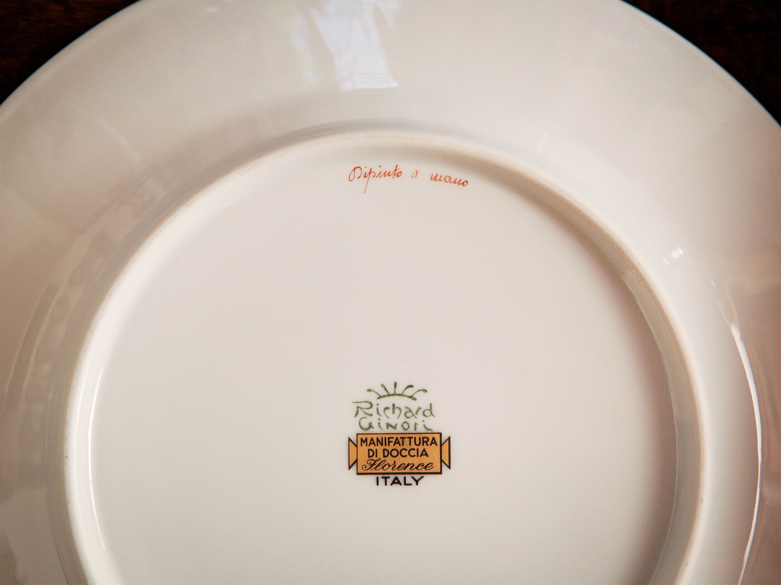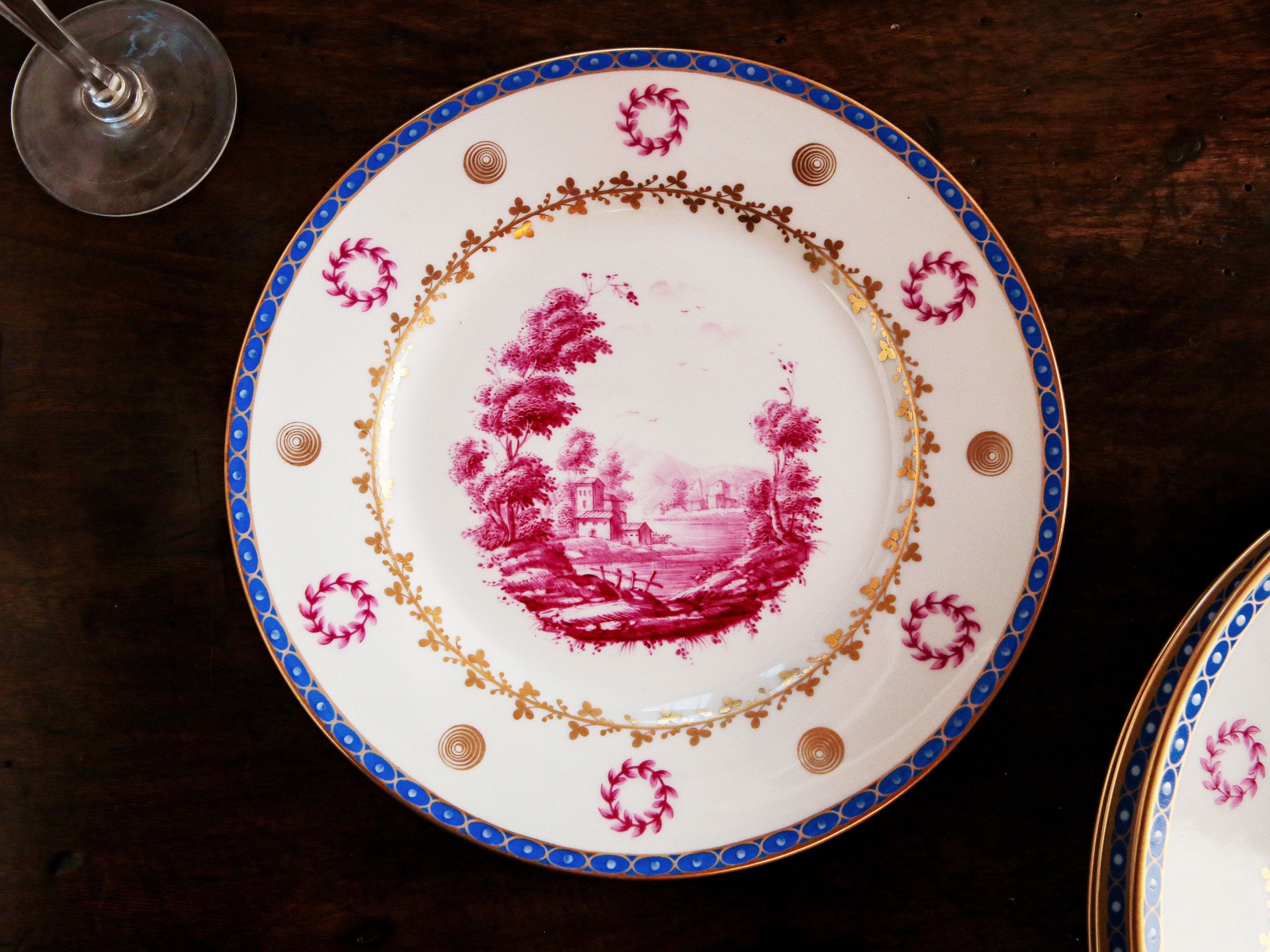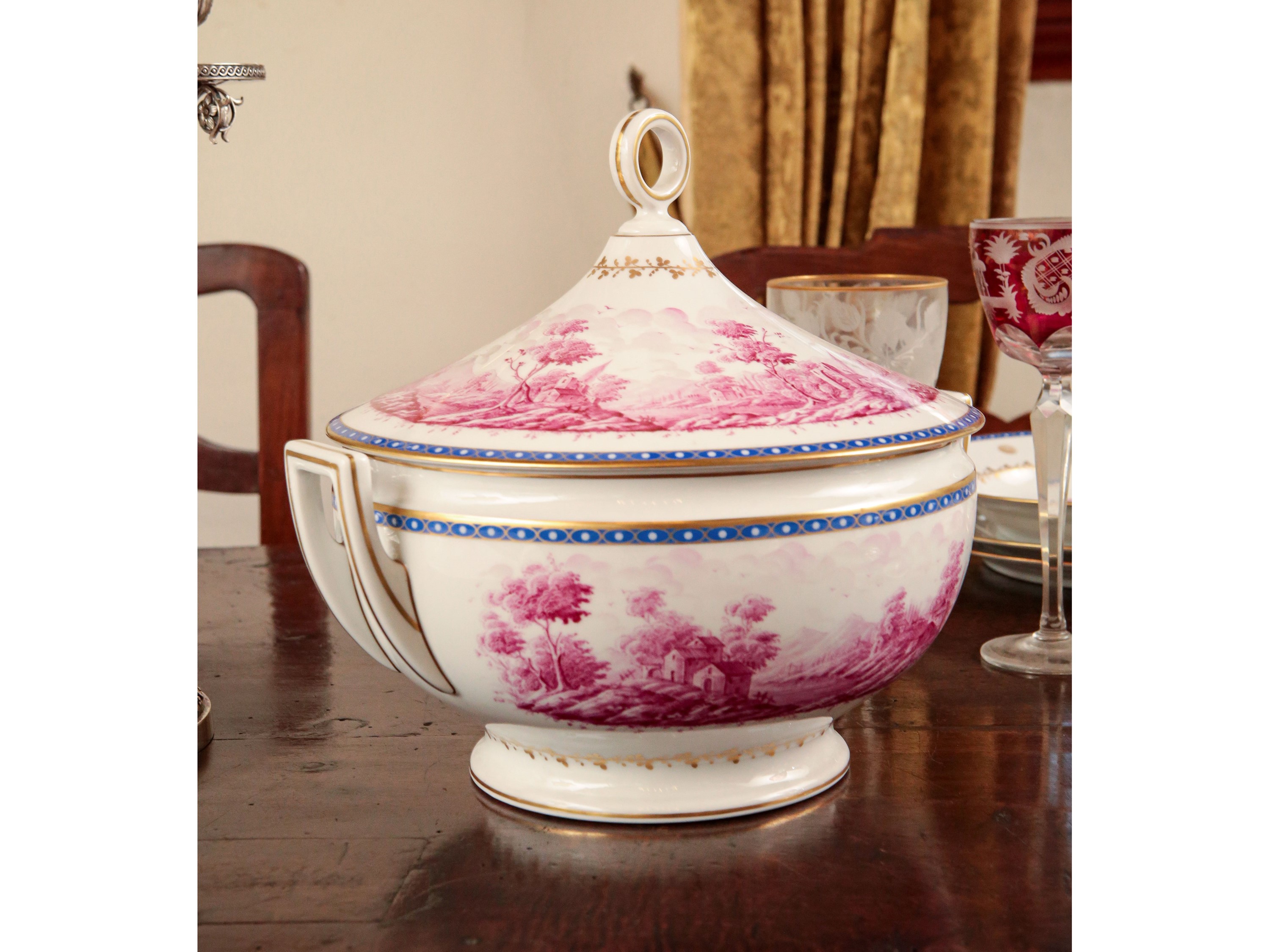 Anni Ottanta completo per otto persone, dipinto a mano in monocromia magenta con varie tipologie di paesaggi diversi, lumeggiature dorate e bordo blu, composto da 16 piatti piani, 8 piatti fondi, 8 piattini, 8 tazzine da caffè con piattini, insalatiera, zuppiera con coperchio, raviera, un vassoio rotondo e due ovali