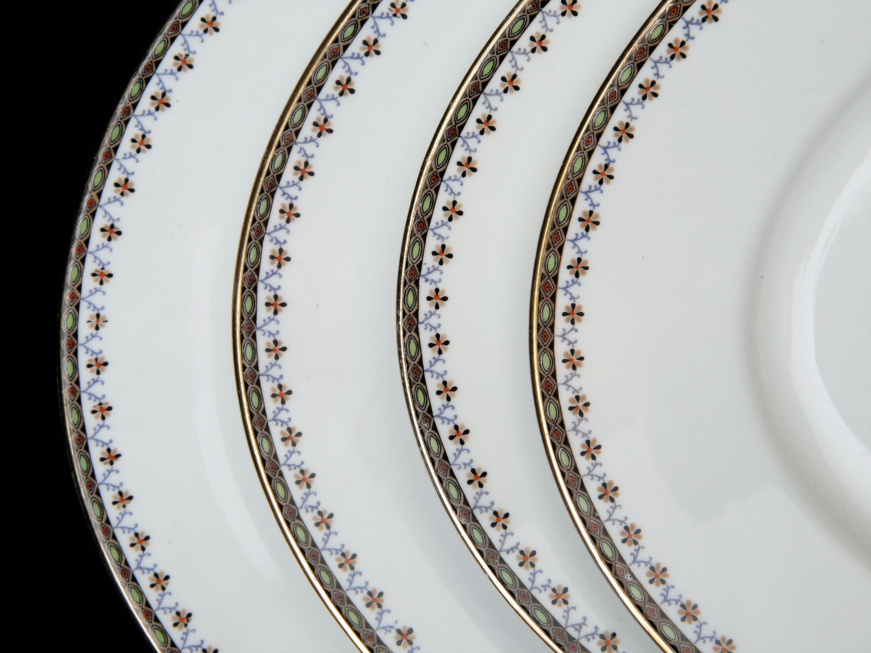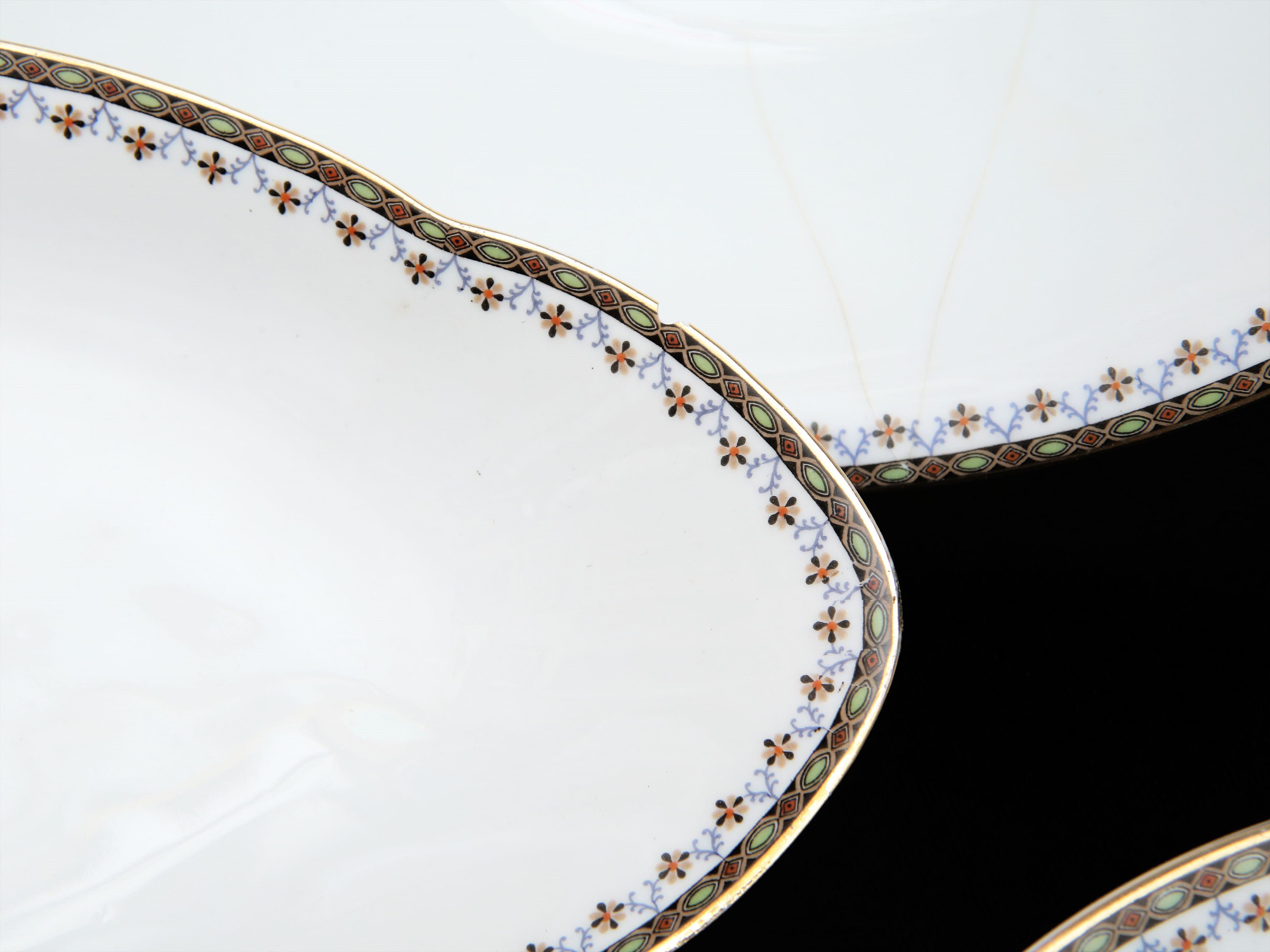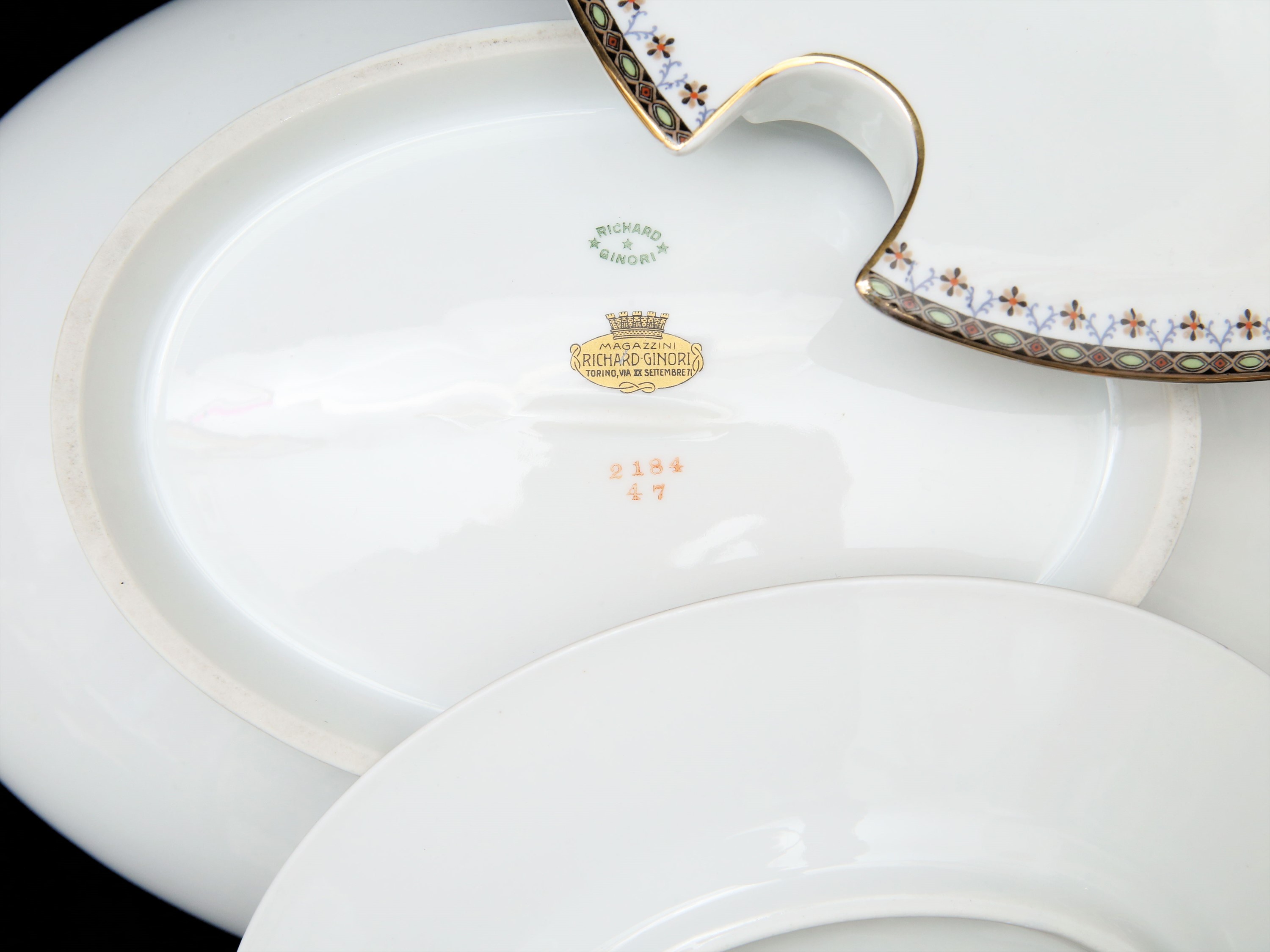 Anni Trenta bordo decorato con piccoli motivi geometrici policromi, completo per 12 persone, composto da 36 piatti piani, 12 fondi (uno con sbeccatura), 12 piattini, zuppiera, insalatiera (felature), alzata, salsiera con cucchiaio, 2 raviere (una con sbeccatura), 4 vassoi ovali a scalare ed uno rotondo (71)