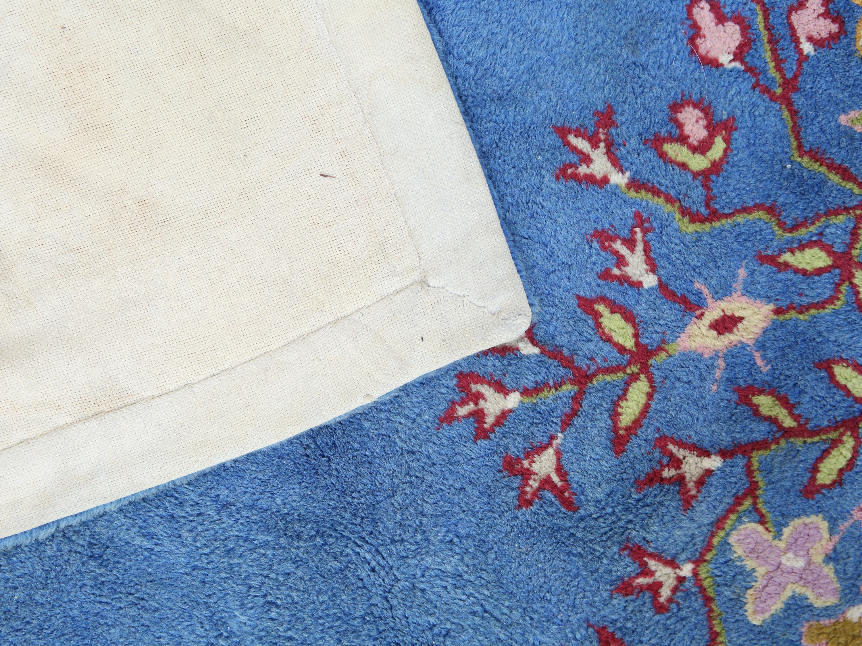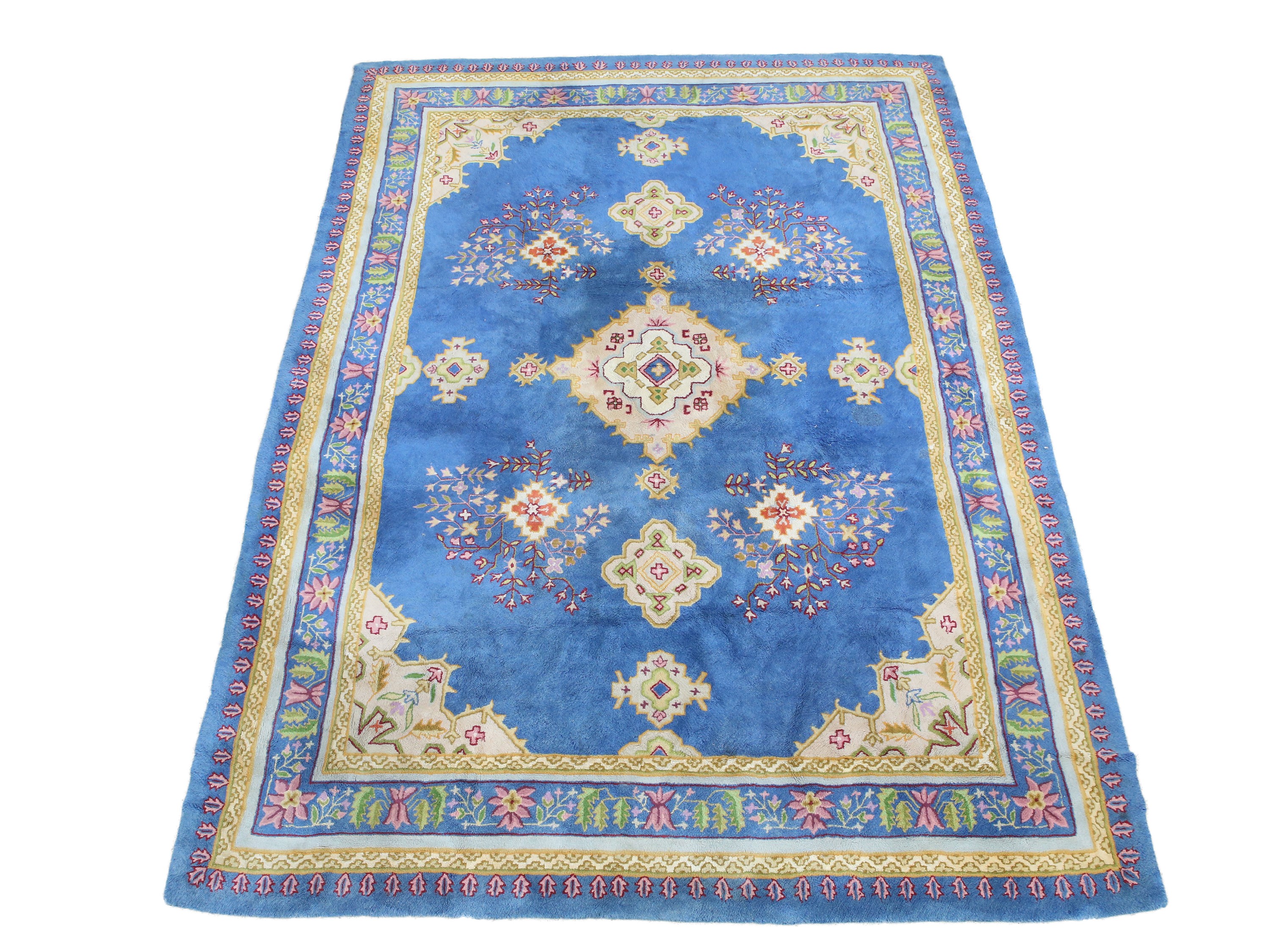 fondo azzurro, campo con medaglione centrale e motivi floreali stilizzati nei toni del rosso, verde e giallo, lievi difetti