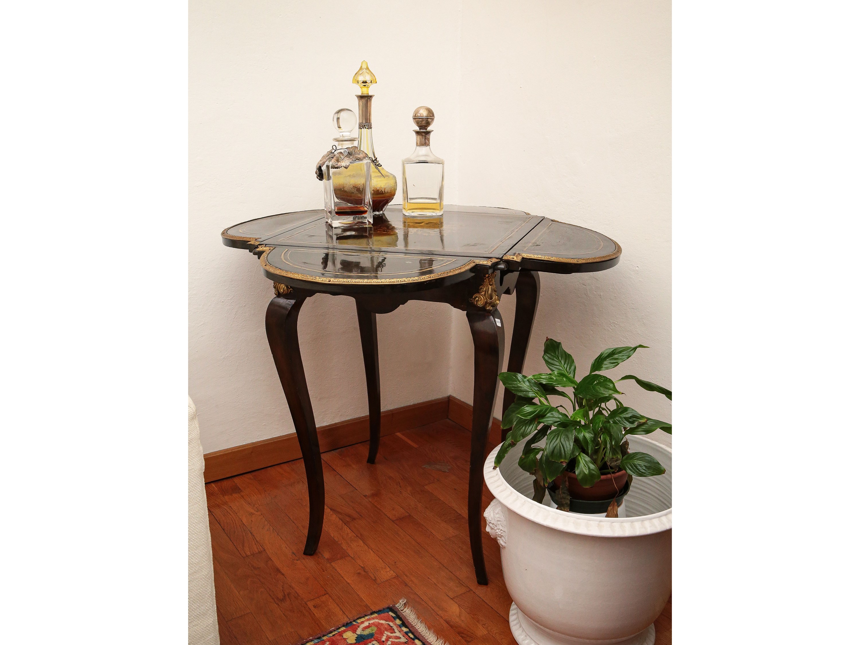 Francia, fine del XIX secolo intarsiato in ottone con filettature e trionfo di strumenti musicali, piano di forma quadrata con quattro bandelle a demi-lune, lievi difetti