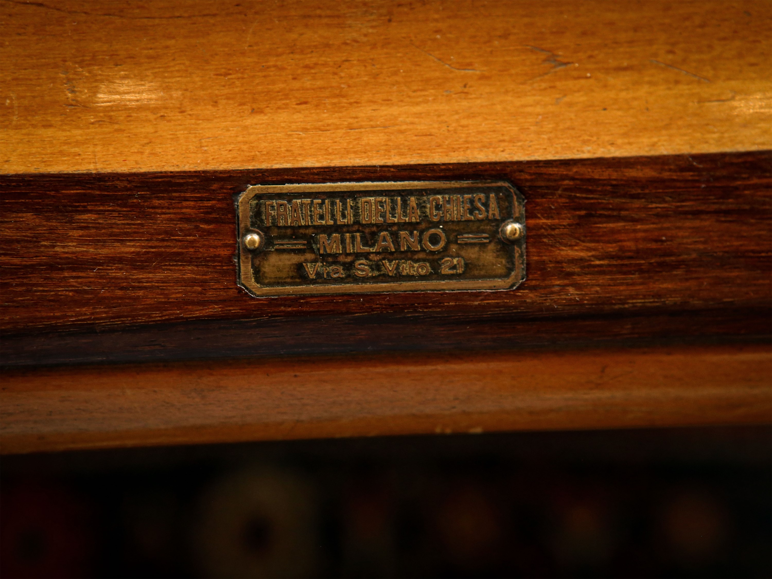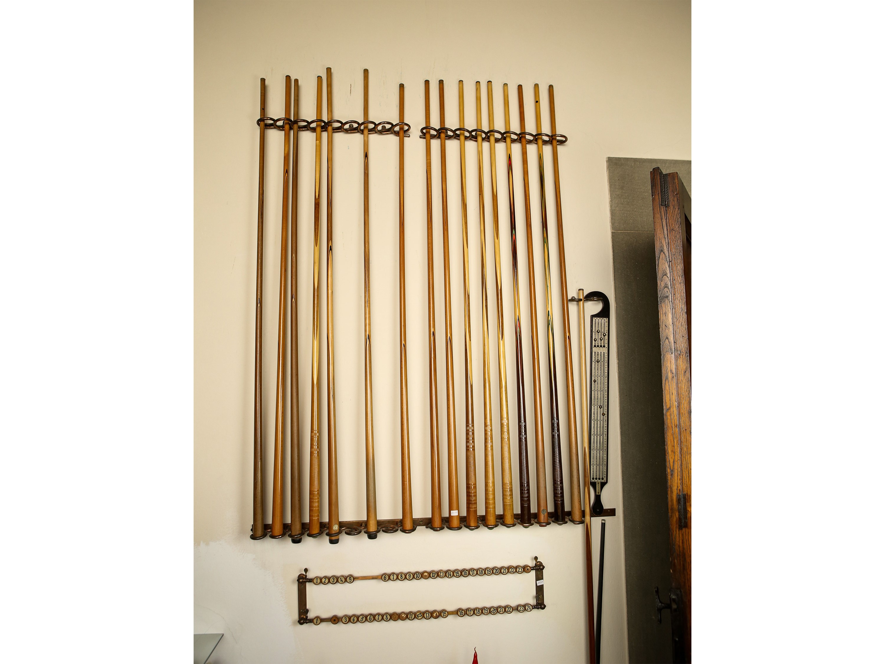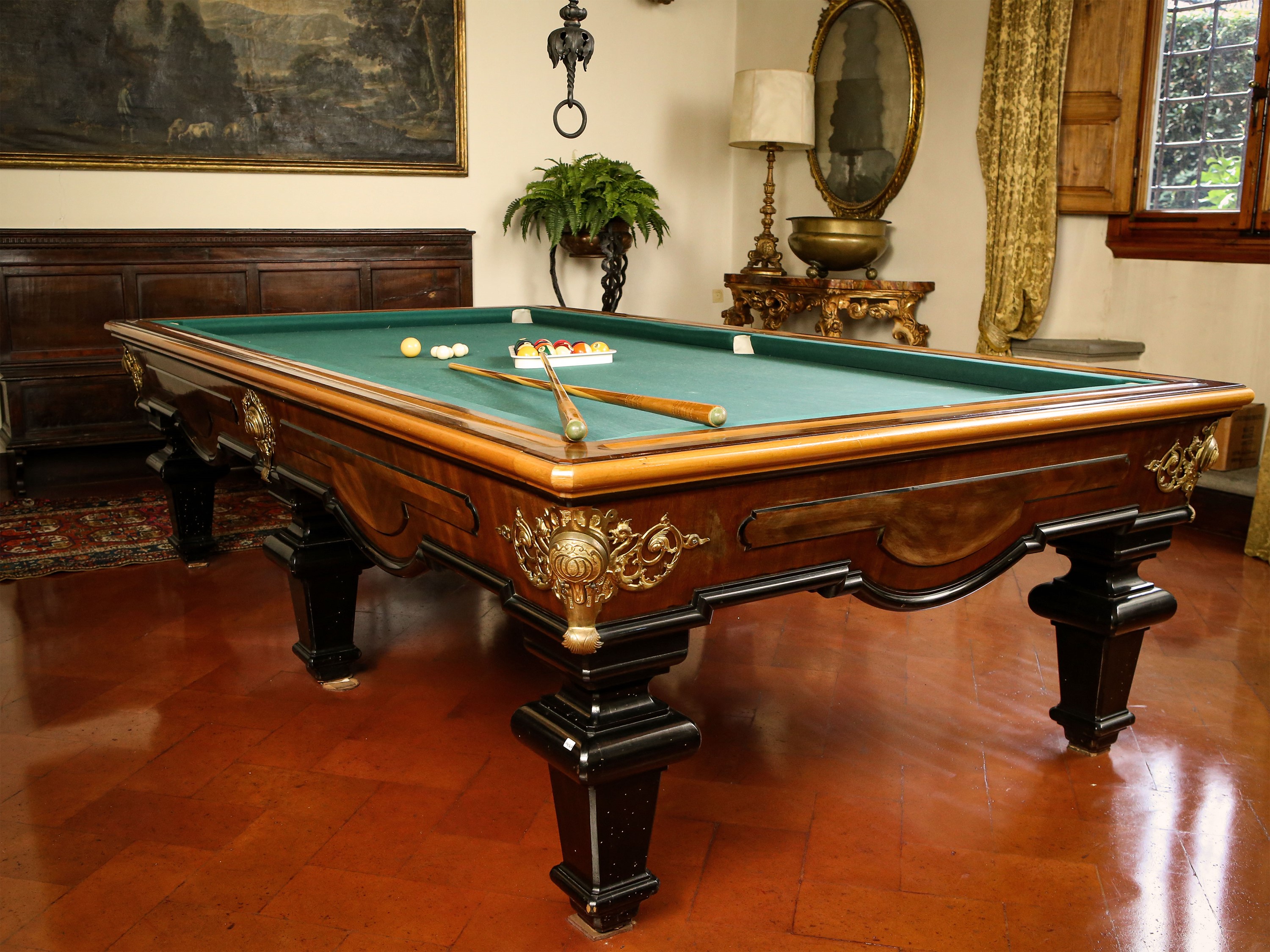 h cm 83x306x168 XX secolo impiallacciato in mogano, noce ed altre essenze, i profili e le sei gambe a faretra ebanizzati, dettagli in bronzo dorato, corredato di venti stecche con portastecche da parete in ottone, palle, boccini e due segnapunti, alcuni difetti