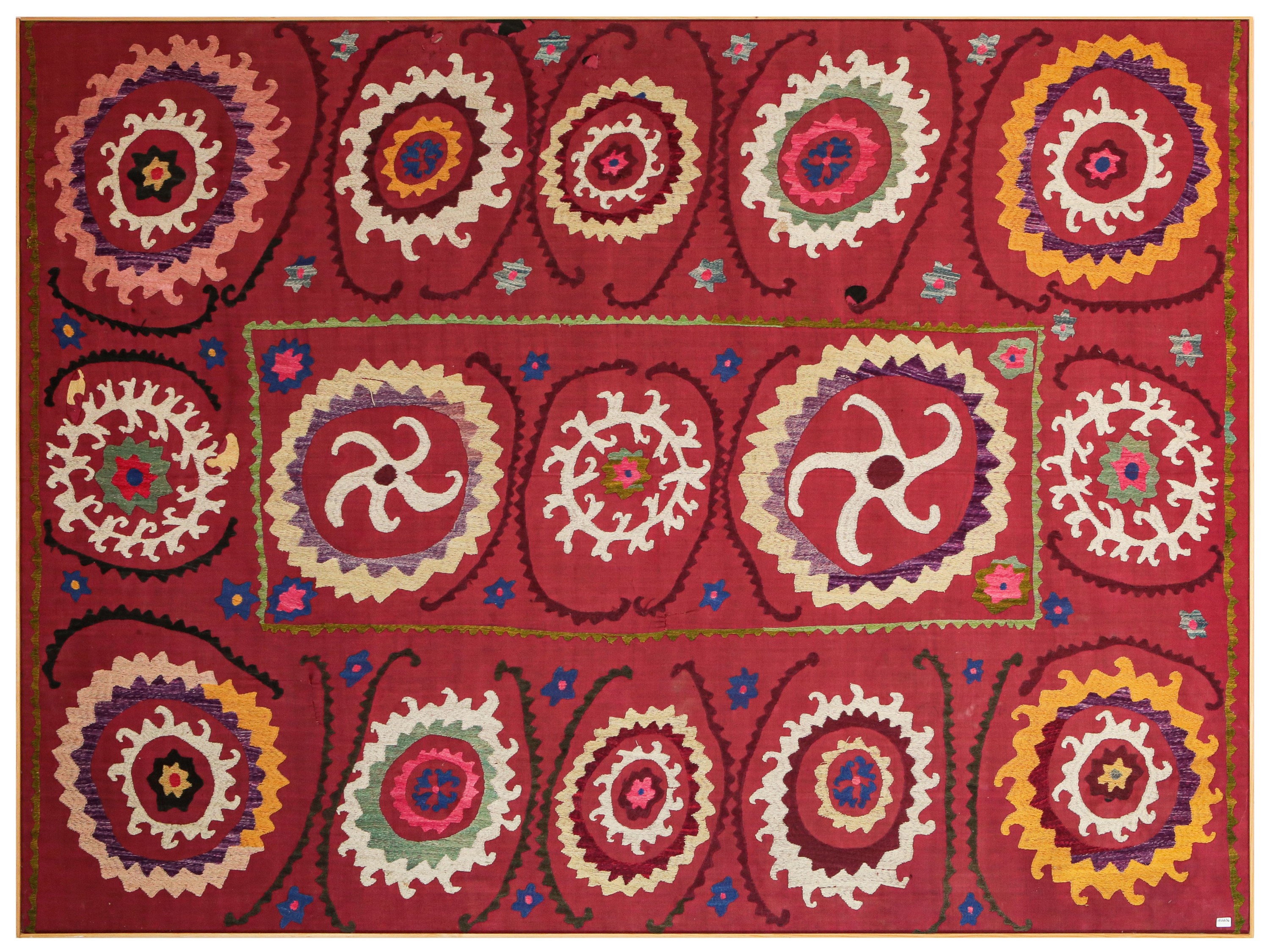 Asia centrale, prima metà del XX secolo fondo rosso con motivi circolari multicolore