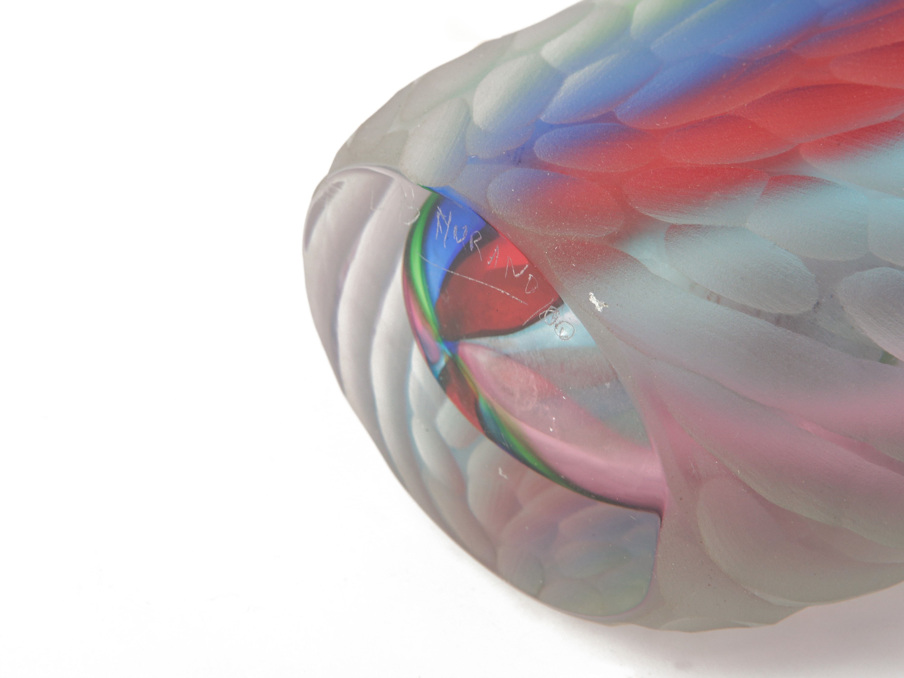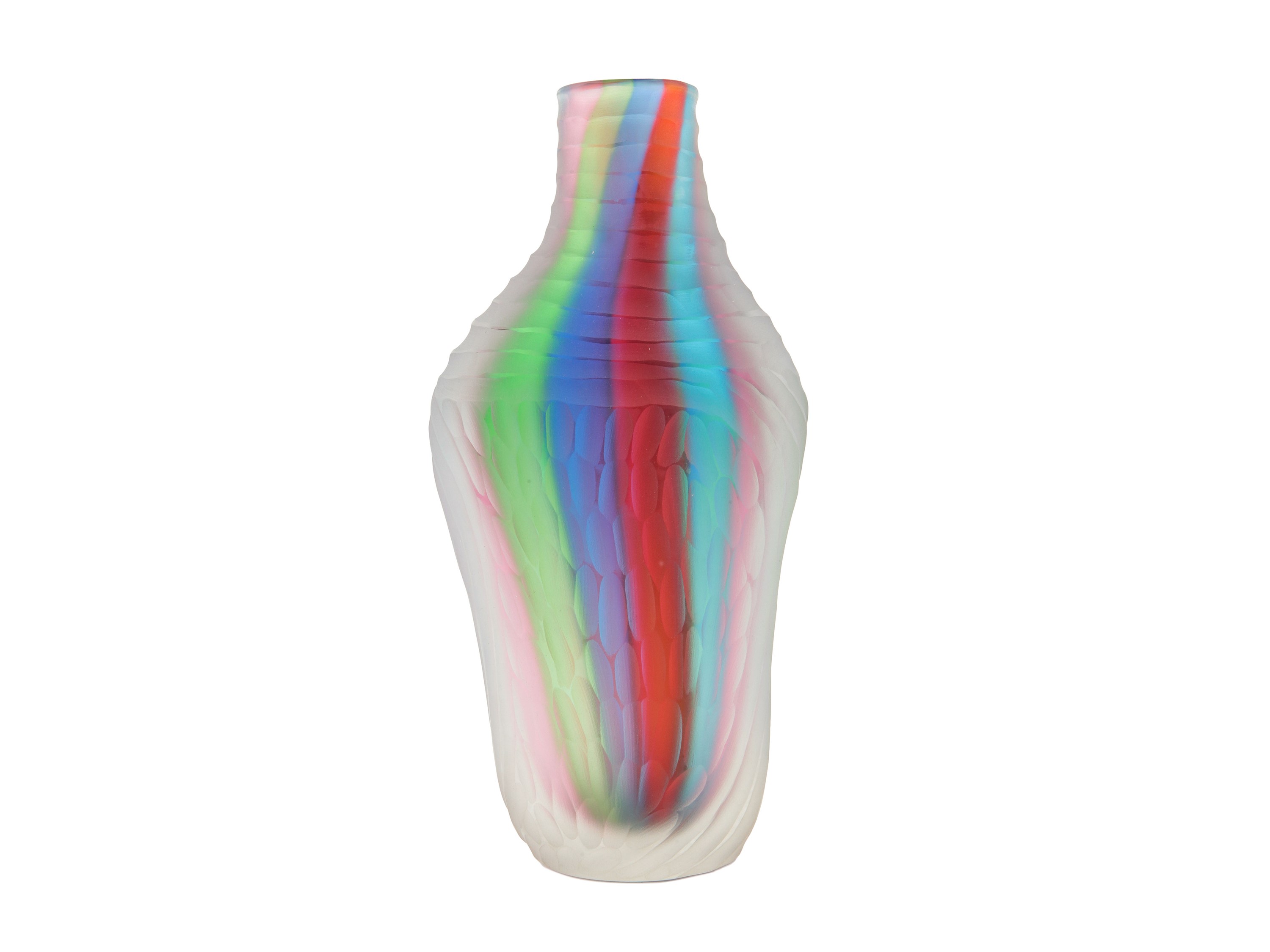 Murano, seconda metà del XX secolo con decoro a strisce policrome, superficie interamente scalpellata. Ispirato ad opere di Dino Martens.