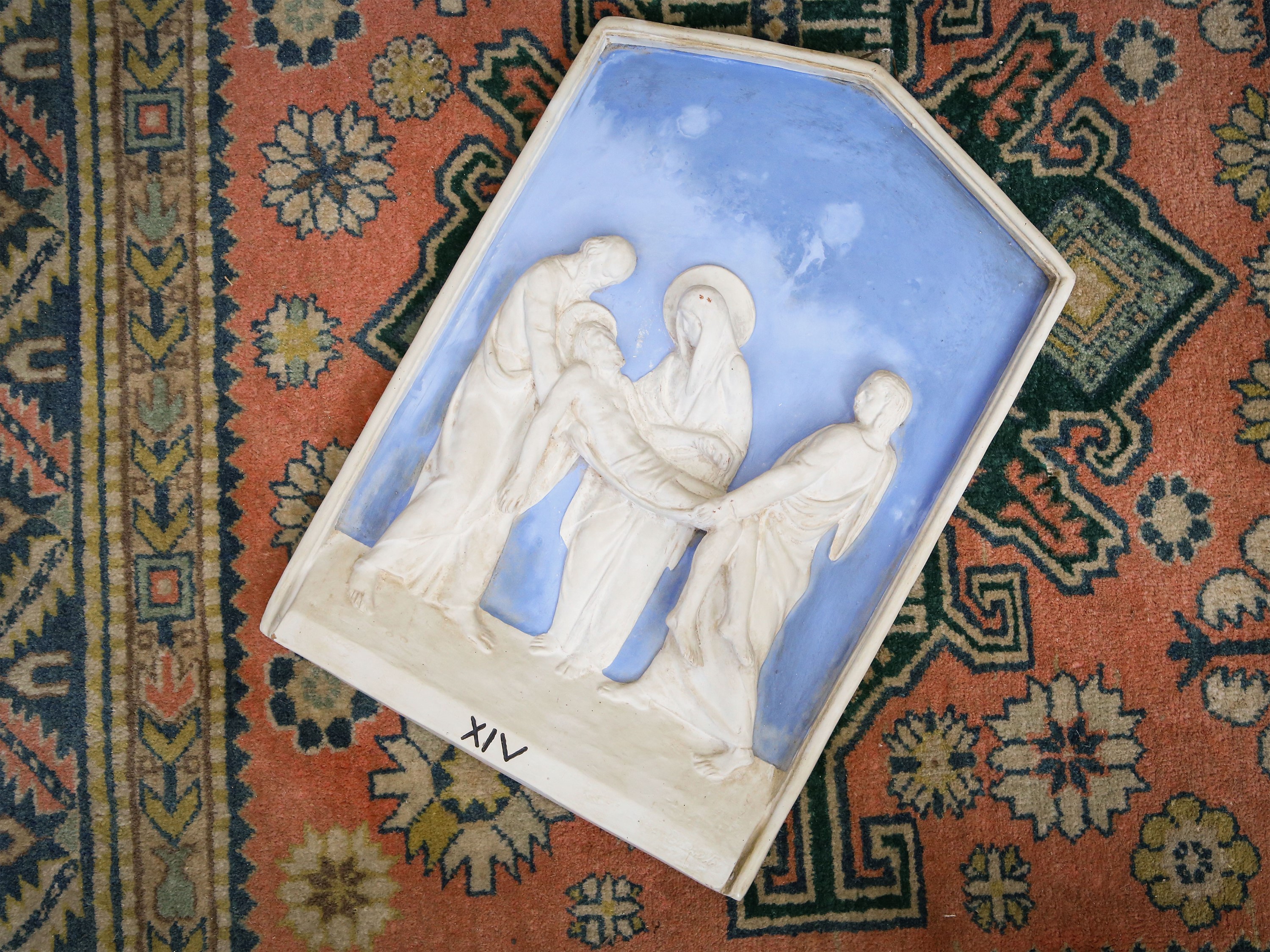 XX secolo composta da quattordici formelle ad alto rilievo in terracotta smaltata in stile robbiano, la dodicesima reca firma non identificata, difetti