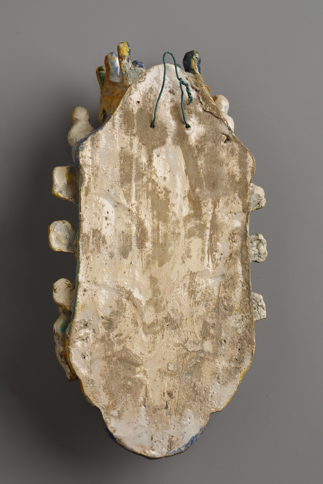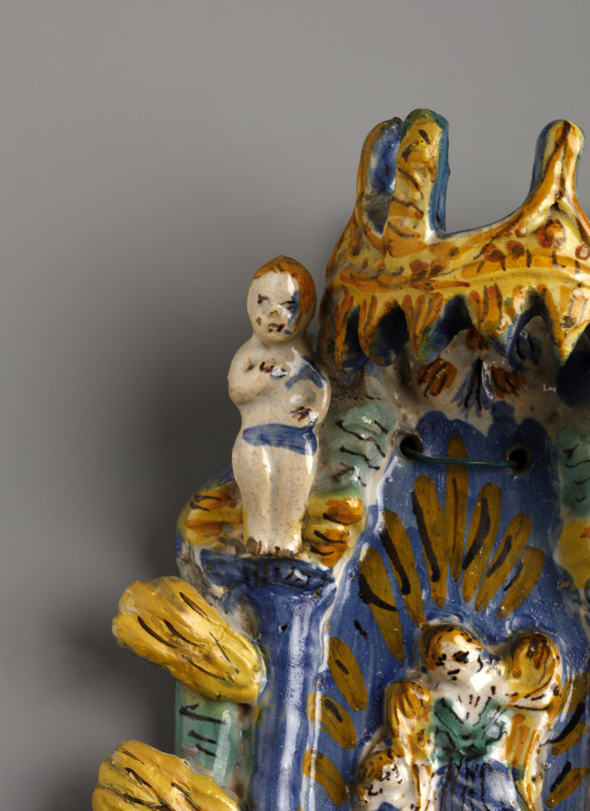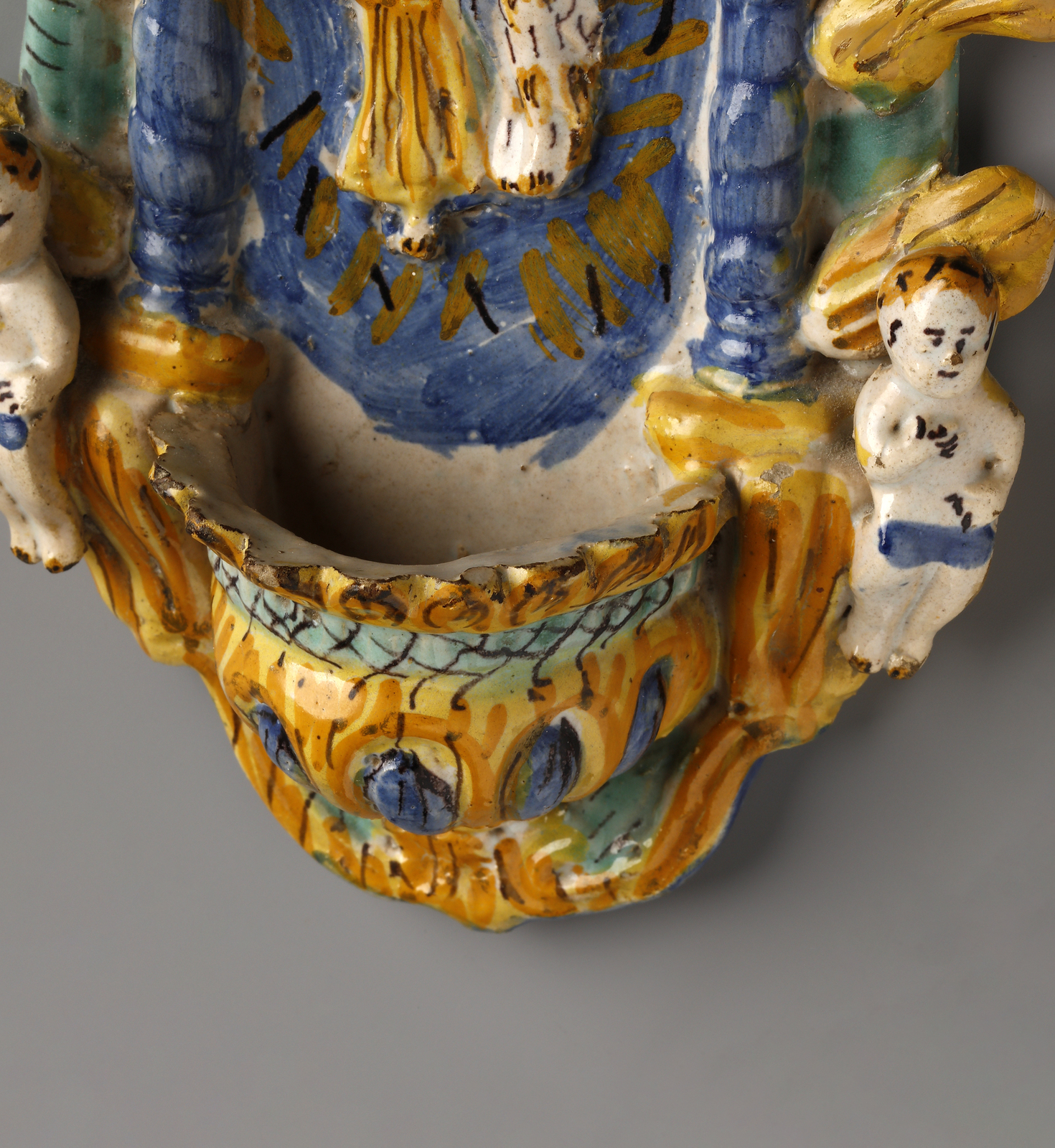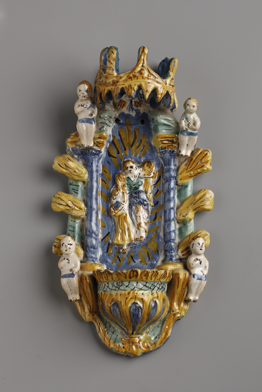 Acquasantiera in maiolica policroma raffigurante al centro l'angelo custode con [..]