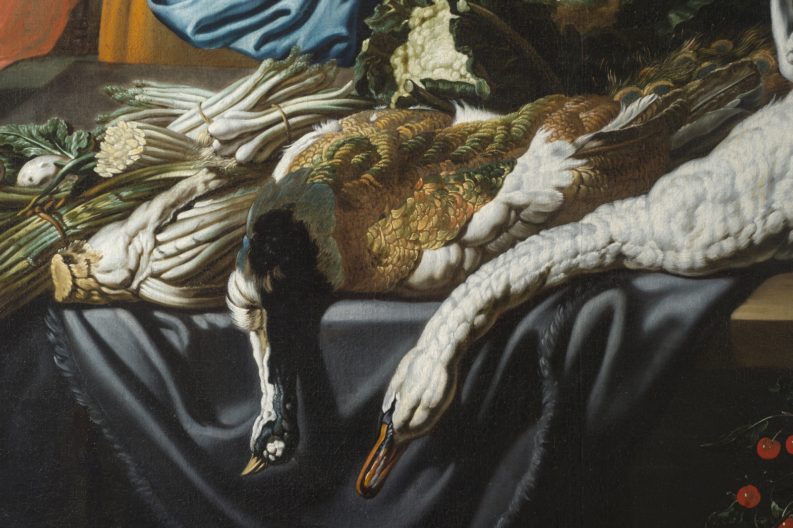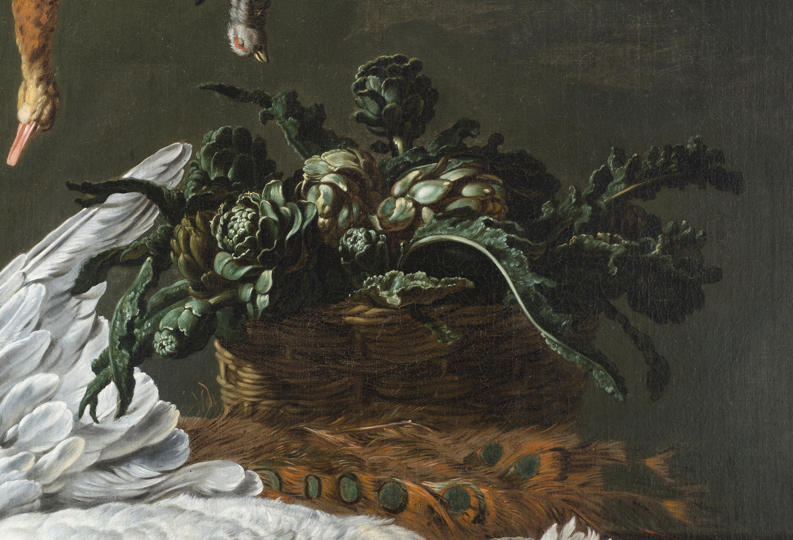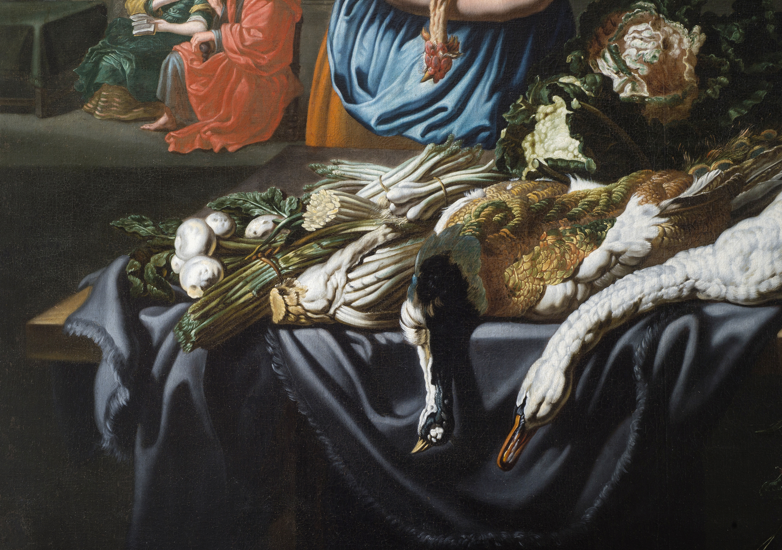 Si ringrazia il Dr. Fred G. Meijer per la sua gentile assistenza nella catalogazione di questo lotto.Il presente dipinto, che si segnala per l'alta qualità esecutiva e le ottime condizioni conservative, riprende il modello autografo di Adriaen Van Utrecht raffigurante la medesima scena conservato al Musée de Picardie ad Amiens (inv. M.P.Lav.1894-115). Il soggetto deriva dal Vangelo di Luca, in cui si narra come Cristo, giunto nel villaggio di Betania, venga accolto in casa da Marta, Maria e dal fratello Lazzaro: mentre Marta si dedica a cucinare un abbondante pasto, Maria resta seduta ad ascoltare gli insegnamenti di Gesù, scatenando l'ira della sorella. Gesù pertanto interviene, indicando a Marta come Maria stia in realtà facendo la cosa migliore, ascoltarlo, anziché occuparsi di faccende terrene. La scena evangelica è qui funzionale alla rappresentazione di una straordinaria ''pronkstilleven'', una natura morta ricca di cacciagione, ortaggi, fiori e frutta, tipologia che già il maestro di Van Utrecht, Frans Snyders, aveva di fatto inventato e affrontato a più riprese, inserendo spesso anche dei personaggi. Non era quindi infrequente che due artisti lavorassero insieme sullo stesso dipinto, concentrandosi uno sugli elementi naturali e l'altro sulle figure. Nell'opera di Amiens, sembra che Van Utrecht abbia collaborato in questo senso con Simon de Vos, pittore specializzato in personaggi e marito della sorella dell'artista. Il presente dipinto riprende nei dettagli l'opera conservata in Francia e, in considerazione della sua qualità, fa ipotizzare che sia stata potenzialmente realizzata all'interno della cerchia di Adriaen Van Utrecht e della sua bottega.Completa il dipinto una grande cornice in legno intagliato, dorato e policromo, probabilmente della prima metà del XIX secolo, con modanatura riccamente decorata da un modulo di foglie d'acanto intagliate e dorate senza soluzione di continuità con profilo esterno decorato da una teoria di fusaiole e sferette.