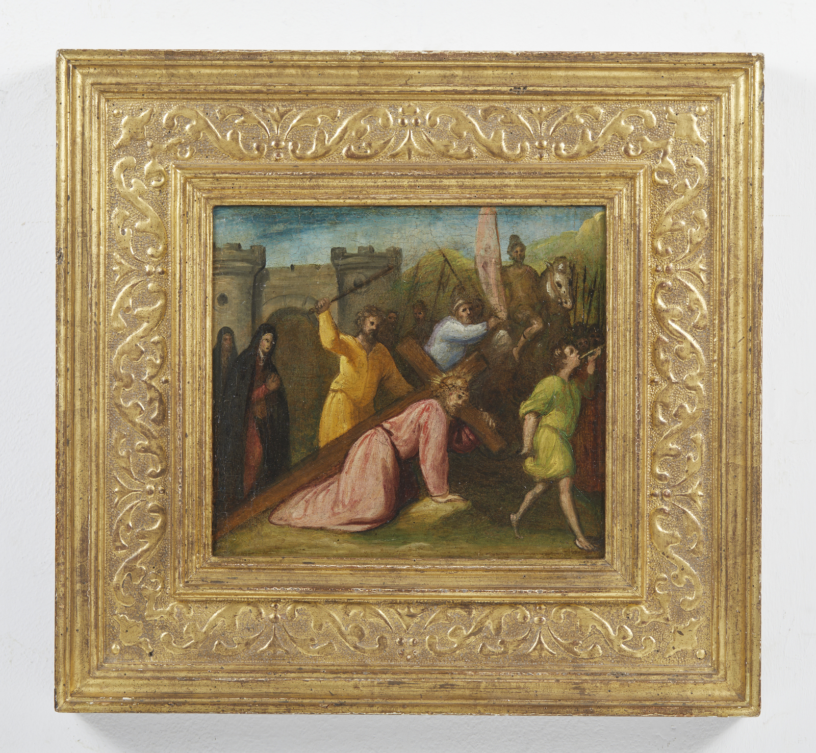 L'opera è accompagnata dalla scheda a cura di Marco Ciampolini, 20 agosto 2017, Siena.La tavoletta narra un episodio della Salita al Calvario descritto nel vangelo di San Luca (23, 26-33). Si tratta dell'incontro di Gesù con alcune donne mentre cade sotto il peso della croce. Queste, scoppiate in pianto, furono redarguite da Cristo che annunciò loro la caduta di Gerusalemme, invitandole a non versare lacrime per lui ma per la rovina che sarebbe caduta su di loro e sui loro figli.La tavola non nacque come una pittura singola, ma come parte di un insieme con più storie. Troppo grande per essere considerata uno scomparto di predella, probabilmente costituì il pannello di un complesso raffigurante i Misteri del Rosario. L'episodio infatti coincide con il quarto dei cinque Misteri dolorosi ( gli altri sono l'Orazione nell'orto, la Coronazione di Spine, la Flagellazione e la Crocifissione). L'originale contesto della Caduta di Cristo sotto la croce, dovette essere simile a quello del dossale oggi posto nell'altare Accarigi di S.Domenico a Siena, un'opera nella quale i quindici Misteri del Rosario (gaudiosi, dolorosi e gloriosi) sono ordinati in tre file parallele. In questo dossale le scene dell'infanzia, della Passione e della Gloria di Gesù, sono interpretate attraverso un ''miscuglio di pensieri più antichi del Sodoma e di riflessi del Beccafumi, accompagnato da una vena naif''.E il tono, rende dall'autore dolcemente accattivante attraverso l'uso di colori delicati e trasparenti, che ritroviamo nell'opera in esame.L'identica cultura si unisce a precisi paralleli formali che rendono indubitabile la medesima paternità. Le figure, in entrambe le opere, presentano le stesse posture ondulate, che trasmettono il loro movimento ai panneggi. La Vergine, all'estremità sinistra della nostra tavola, con la testa schiacciata e il fluente mantello, si lascia confrontare con l'analoga figura nell'Incoronazione del complesso pittorico di S. Domenico a Siena.Questo complesso, come è stato dimostrato, è opera dell'autore delle pitture del fregio dell'Oratorio di S. Bernardino a Siena, ossia di Sinolfo d'Andrea Trombetto.Di questo artista abbiamo un solo lavoro datato, appunto il ricordato fregio dell'Oratorio di S. Bernardino, che il pittore eseguì, in collaborazione con il doratore Andrea Maganza di Firenze, nel 1514. Numerosi documenti attestano che Sinolfo viveva in condizione agiata, segno di una riconosciuta professionalità.Sinolfo era personaggio di una certa levatura culturale. Ultimamente è stata resa nota la sua partecipazione, negli anni quaranta del Cinquecento, alle attività letterarie e teatrali della rinomata Accademia de' Rozzi, con il soprannome di ''Materiale''.L'opera in esame si aggiunge all'esiguo corpus di pitture di Sinolfo d'Andrea, che comprende, oltre alle opere descritte, una Sacra Famiglia nella Pinacoteca di Siena, una Adorazione del Bambino nel Museo Civico di San Gimignano e tre tondi, con Madonna e Bambino, talvolta accompagnati da angeli e santi (uno nel museo diocesano della stessa città, uno presso Tornabuoni a Firenze e l'altro in ubicazione sconosciuta).Nell'ancora incerta cronologia del pittore, l'opera in esame nella sua sinuosa eleganza e nella trasparenza dei colori, elementi memori della produzione matura di Beccafumi, appare la più evoluta fra i dipinti conosciuti di Sinolfo, collocabile negli anni trenta del Cinquecento.