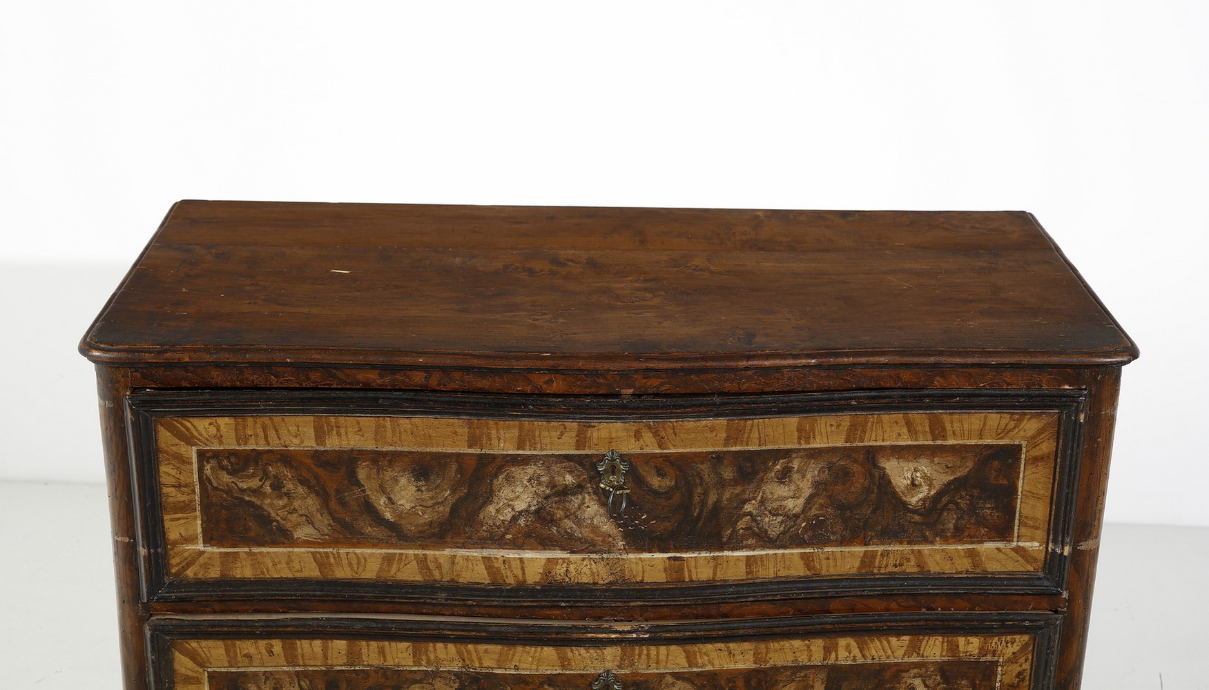 Cassettone in legno dipinto a finta radica, fronte leggermente mosso a due cassetti, [..]