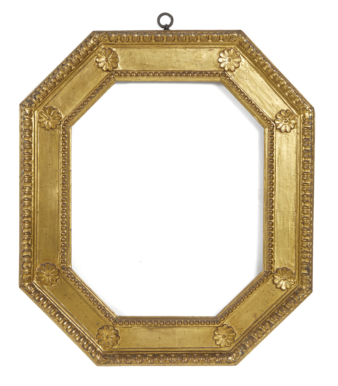 Cornice ottagonale in legno intagliato e dorato con bordo esterno decorato a ovuli, [..]
