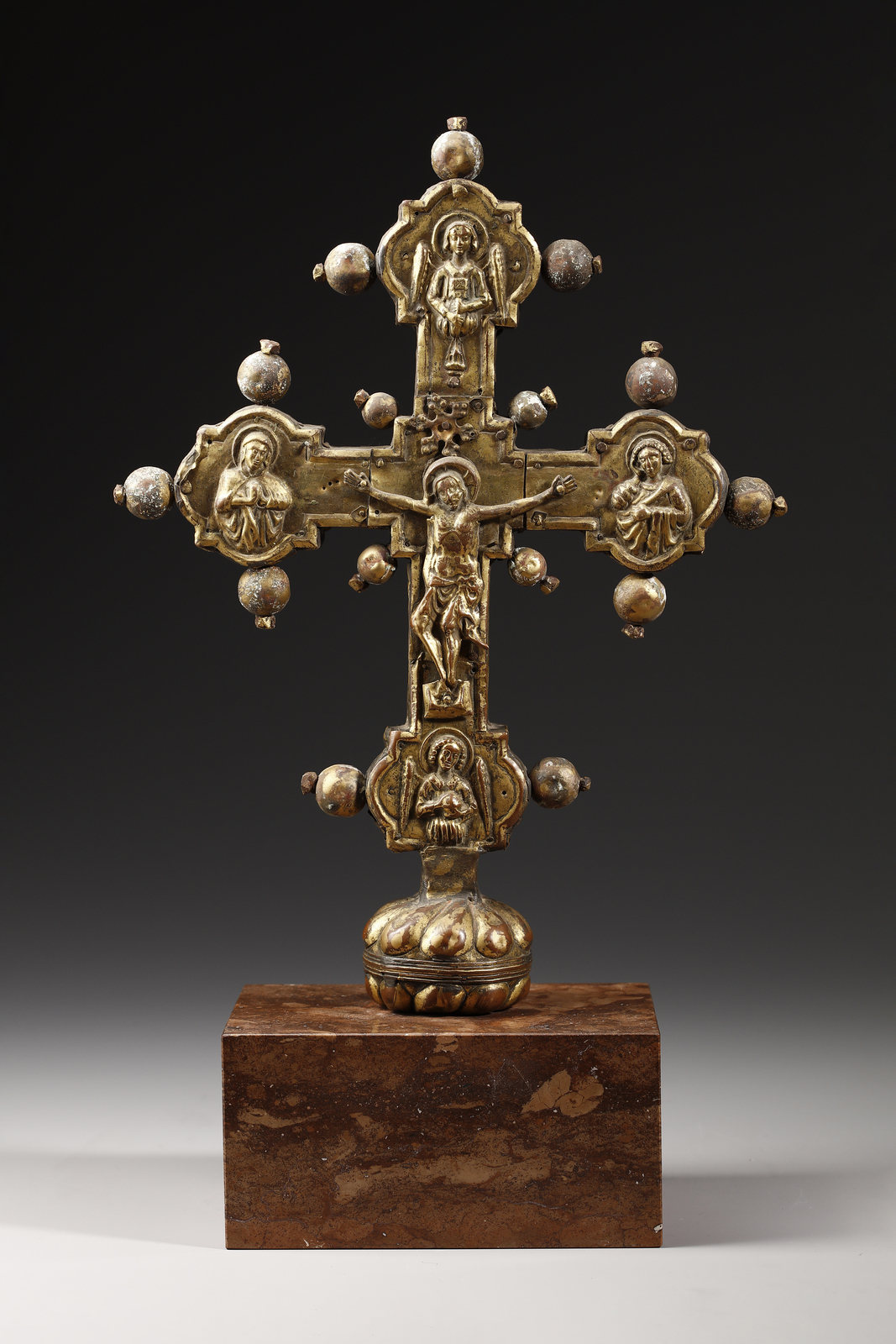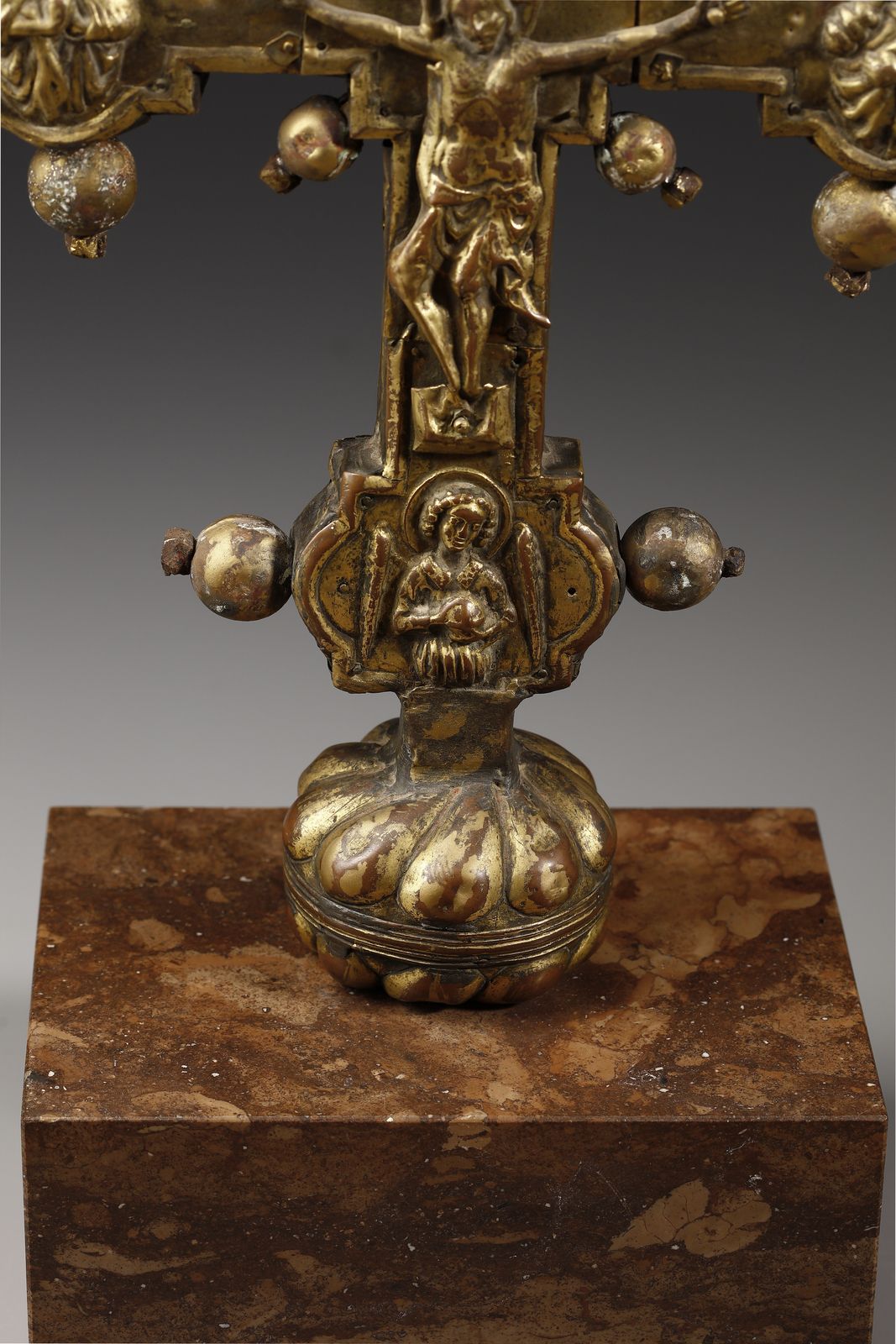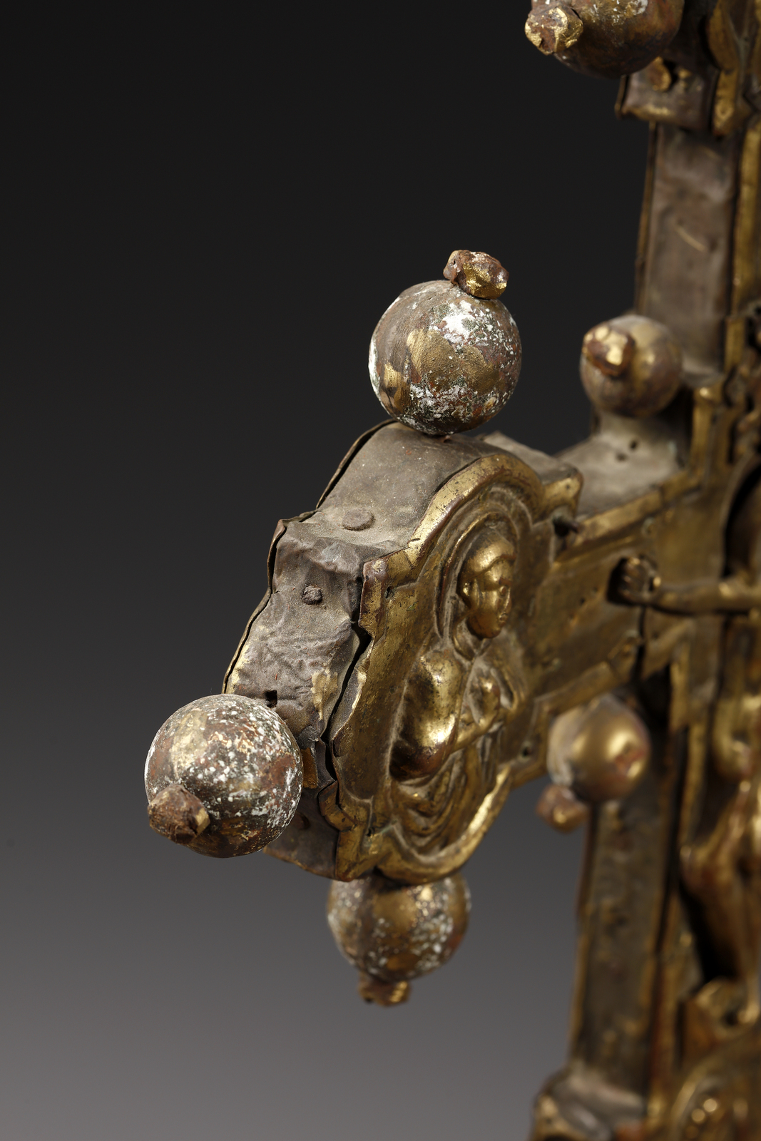 Croce astile in rame sbalzato e dorato, terminali polilobati con la Madonna, S. [..]
