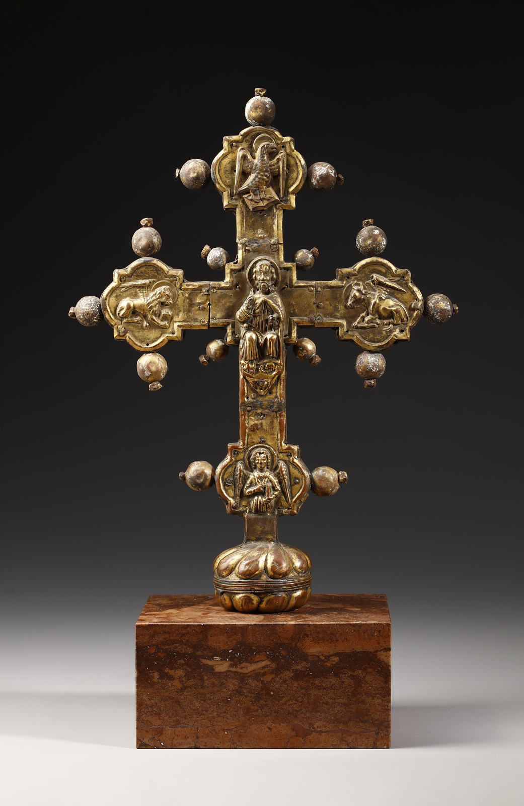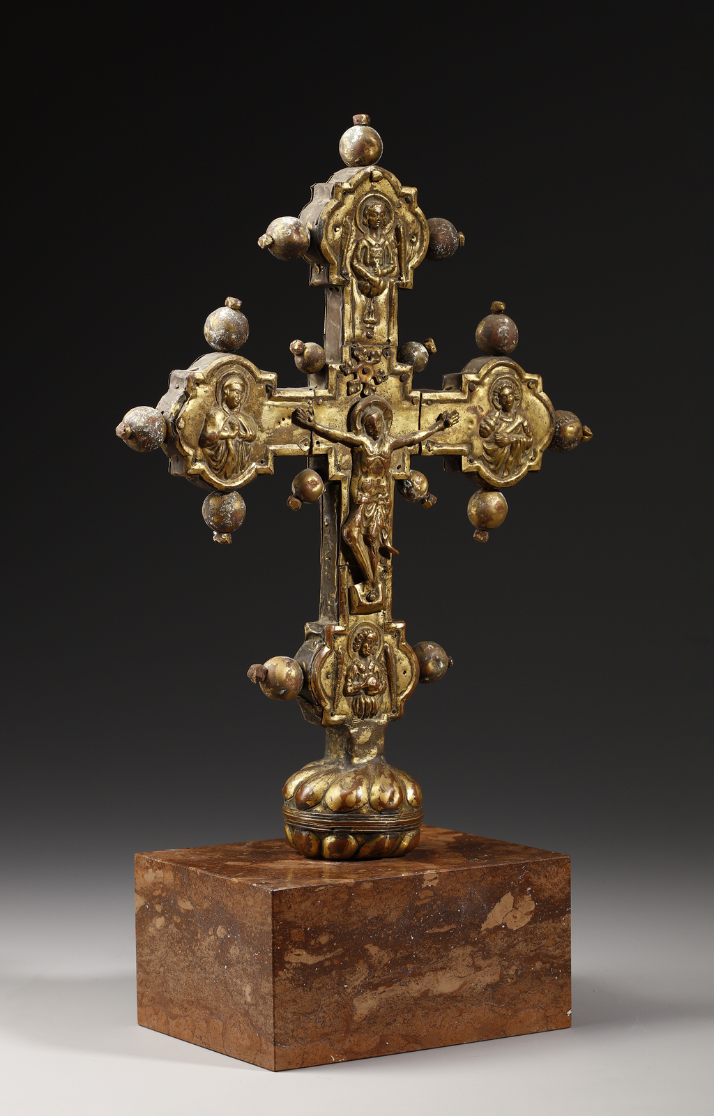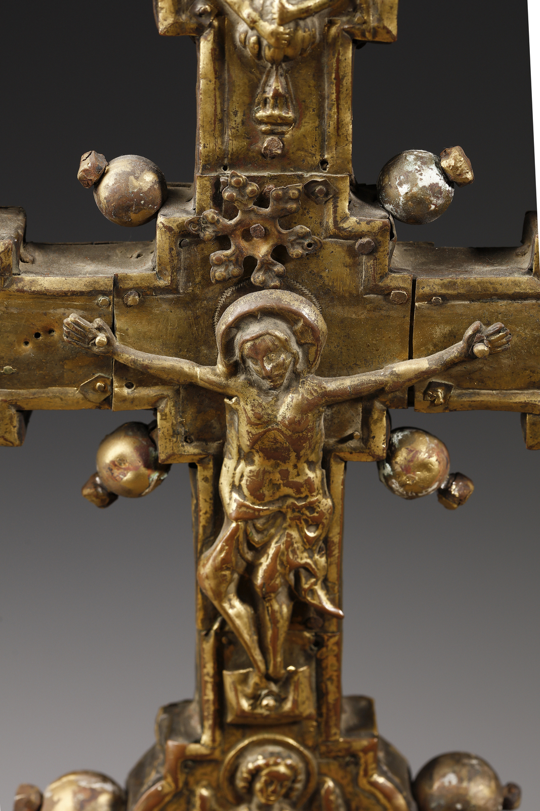 Croce astile in rame sbalzato e dorato, terminali polilobati con la Madonna, S. [..]