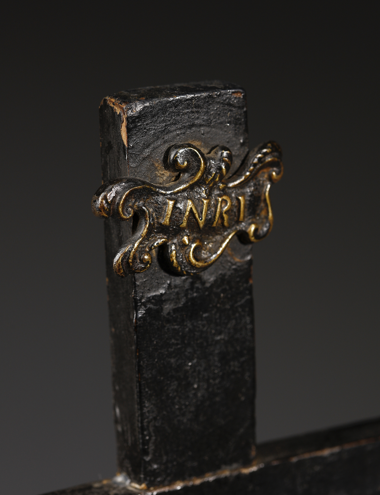 Crocifisso in bronzo patinato, croce in legno con inserto in pietra dura