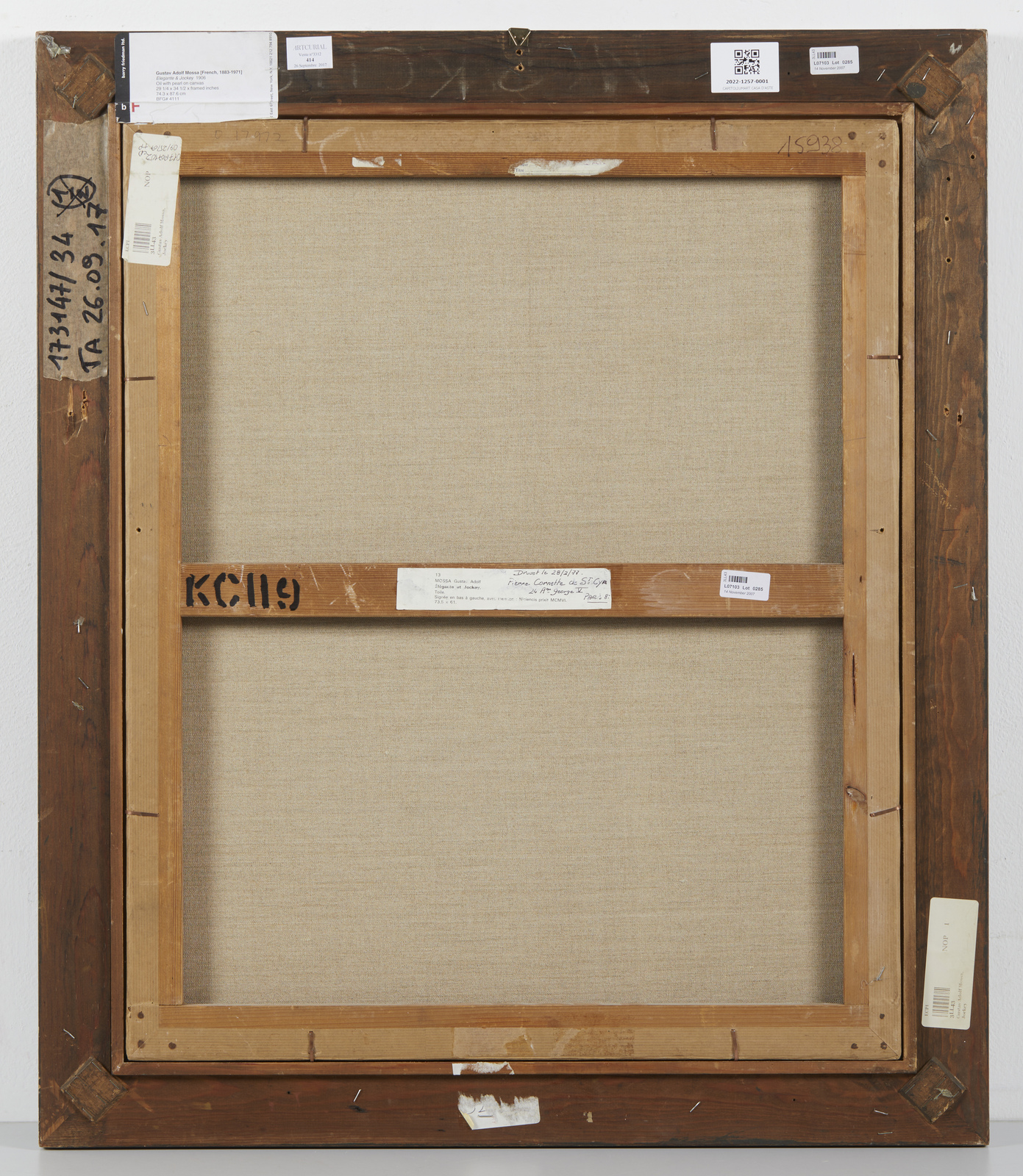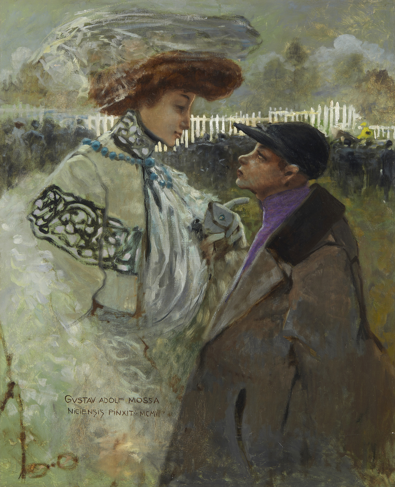 Firmato e datato 'GUSTAV ADOLF MOSSA / NICIENSIS PINXIT. MCMVI' in basso a sinistra.Provenienza: Parigi, Hotel Drouot, Cornette de Saint Cyr, 28 febbraio 1977. Versailles, Me Blache, 2 maggio 1982.Londra, Christie's, 1 dicembre 1989, n. 1032. Piccadily Gallery, Londra. Barry Friedman Ltd, New York, si veda un'etichetta sul retro. Londra, Sotheby's, 14 novembre 2007, n. 285. Collezione privata, ItaliaEsposizioni: ''Gustav Adolf Mossa, l'oeuvre symboliste, 1903-1918'', Parigi, 19 giugno - 27 settembre 1992, ripr. p. 32.Bibliografia: M. Gibson, 'Symbolism', Colonia 1995, p. 12, ripr.. J. Forneris, ''Résonances niçoises dans l'oeuvre symboliste de Gustav-Adolf Mossa 1900-1911'', in 'Nice historique', n° 3, 2009, p. 185-186, ripr. a colori. S. Lombart e J. R. Soubiran, ''Gustav Adolf Mossa, Catalogue Raisonné des oeuvres symbolistes'', Parigi 2010, p. 52, n° H26.Figlio d'arte (il padre Alexis Mossa fu artista del Carnevale di Nizza e poi curatore del Museo della città), Gustav-Adolf Mossa appartiene alla seconda generazione di Simbolisti, movimento da cui trae indubbiamente ispirazioni e suggestioni per sviluppare però un immaginario estremamente personale. La sua produzione si concentra tra gli anni 1901 e 1918 ed è costituita soprattutto da opere su carta, caratterizzate dal suo tratto netto ispirato dal mondo delle illustrazioni e delle ''affiches'' pubblicitarie di inizio secolo: rare sono le sue opere su tela, opere centrali nel suo percorso artistico e nella comprensione della sua poetica. Mossa unisce la straordinaria conoscenza del mito e della poesia, soprattutto quella di Charles Baudelaire, con l'estetica simbolista e con l'immaginario grottesco del Carnevale, in un'osmosi il cui risultato è insieme onirico e inquietante. Le archetipiche immagini del mito biblico o greco (Giuditta e Oloferne, Edipo e la Sfinge, ecc.) sono rilette in chiave contemporanea e centrale è spesso la figura della ''femme fatal'', moderna e crudele protagonista di molte sue opere. Nel presente dipinto, uno dei capolavori dell'artista, sono presenti tutte queste tematiche: il fantino, come un moderno Edipo, appare ammaliato, quasi schernito dalla torreggiante e lussuriosa figura della dama-sfinge, che lo sovrasta e lo domina con la sua sola presenza e l'imposizione del dito, sullo sfondo di un tenebroso ippodromo, in una ''mascherata'' della vita onirica e brutale al tempo stesso.